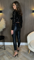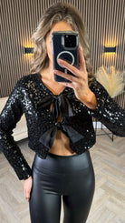 Sparkle and shine with the Morgan Black Sequin Top! This playful top features an open sequin design and a unique bow detail closure. Its slight crop length adds a fun twist to any outfit. Get ready to turn heads and make a statement with this quirky and stylish top! ✨🎀