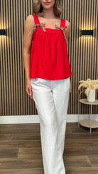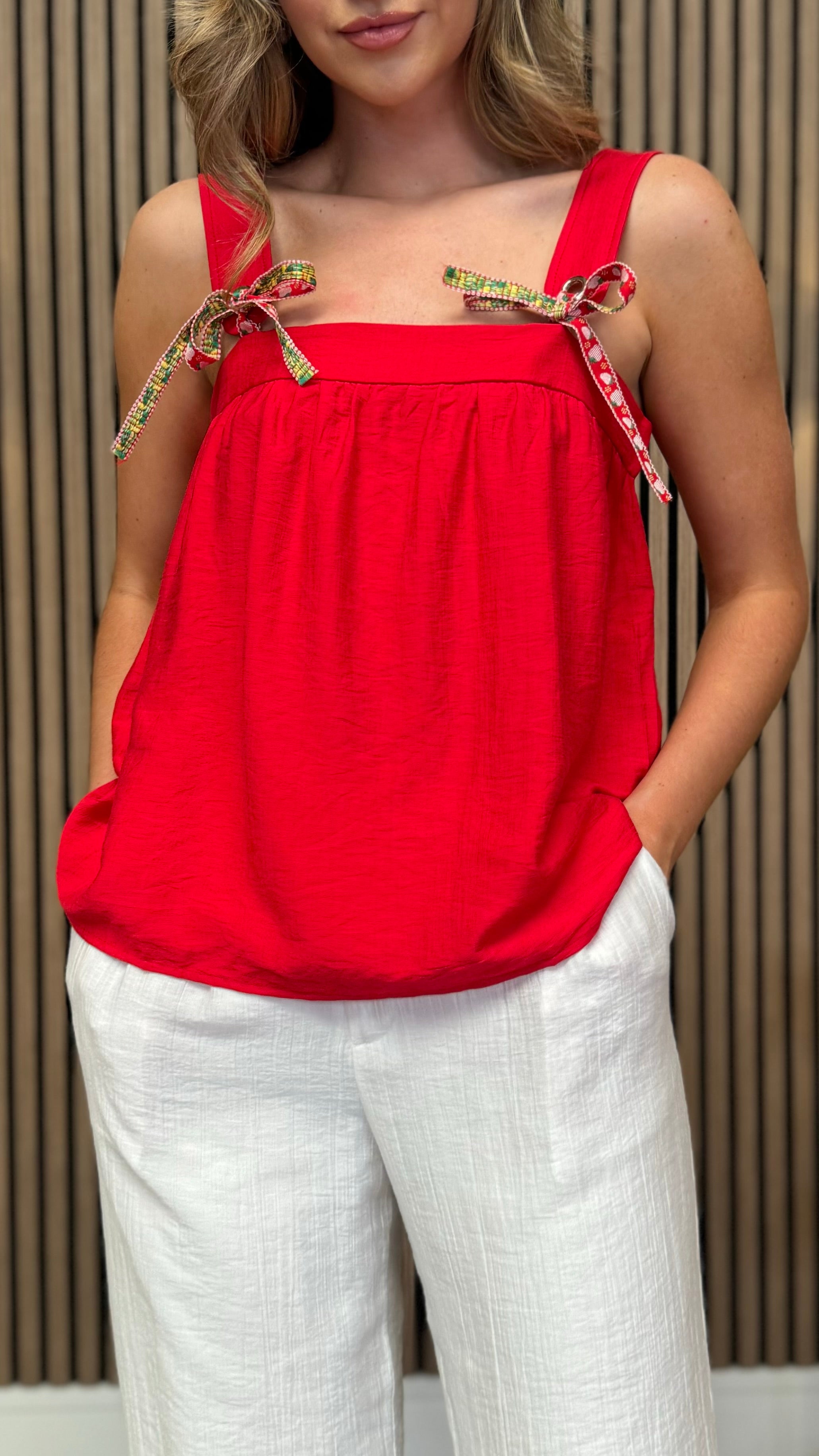 Add a splash of sweetness to your wardrobe with the Amara Red Strawberries Detail Tie Strap Top! 🍓 This top features charming strawberry accents and adjustable tie straps for a perfect fit. Light, fun, and fresh—it's your go-to for sunny days and playful vibes! ☀️💕