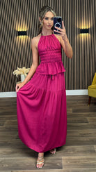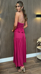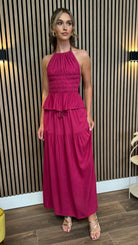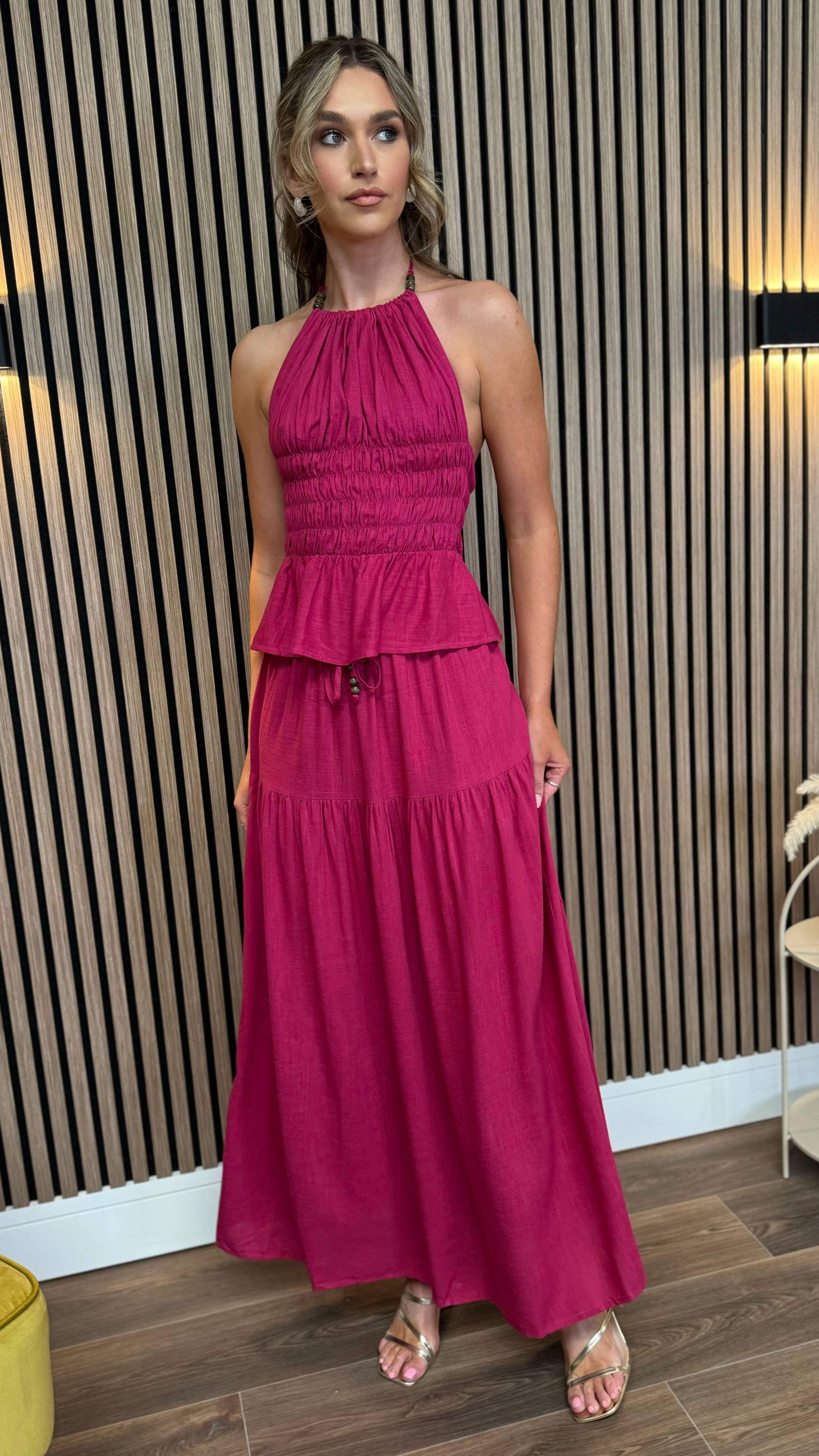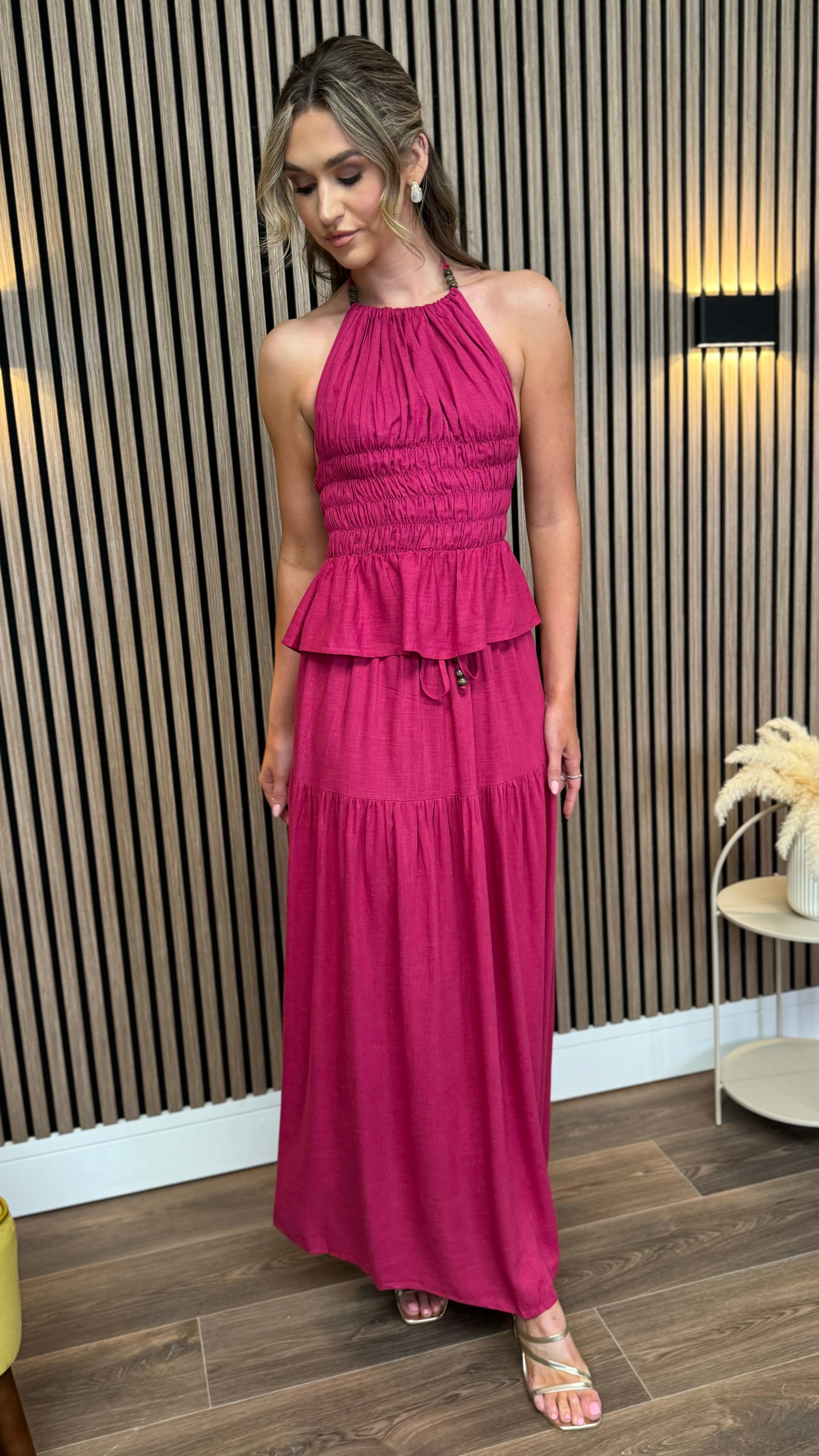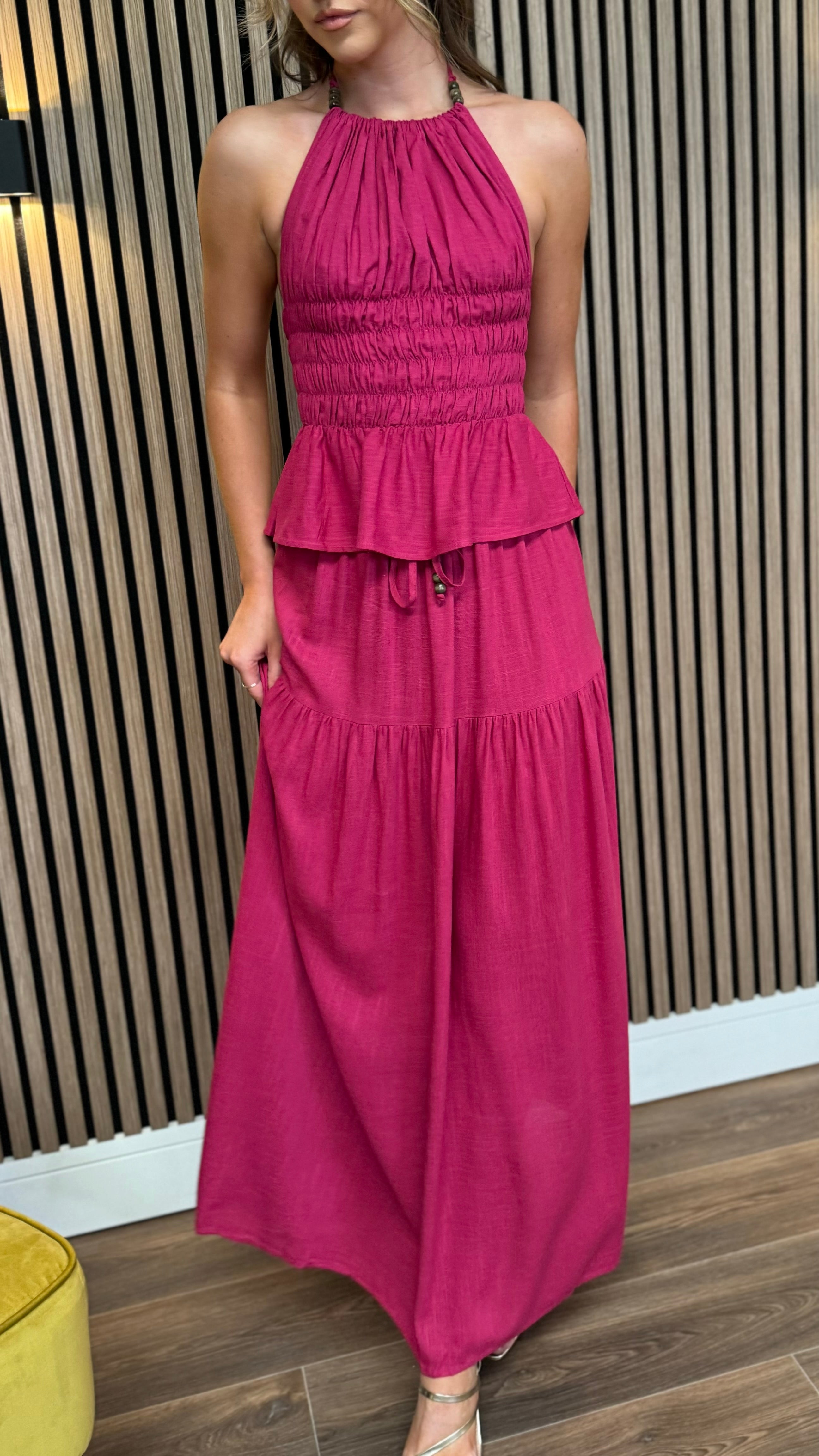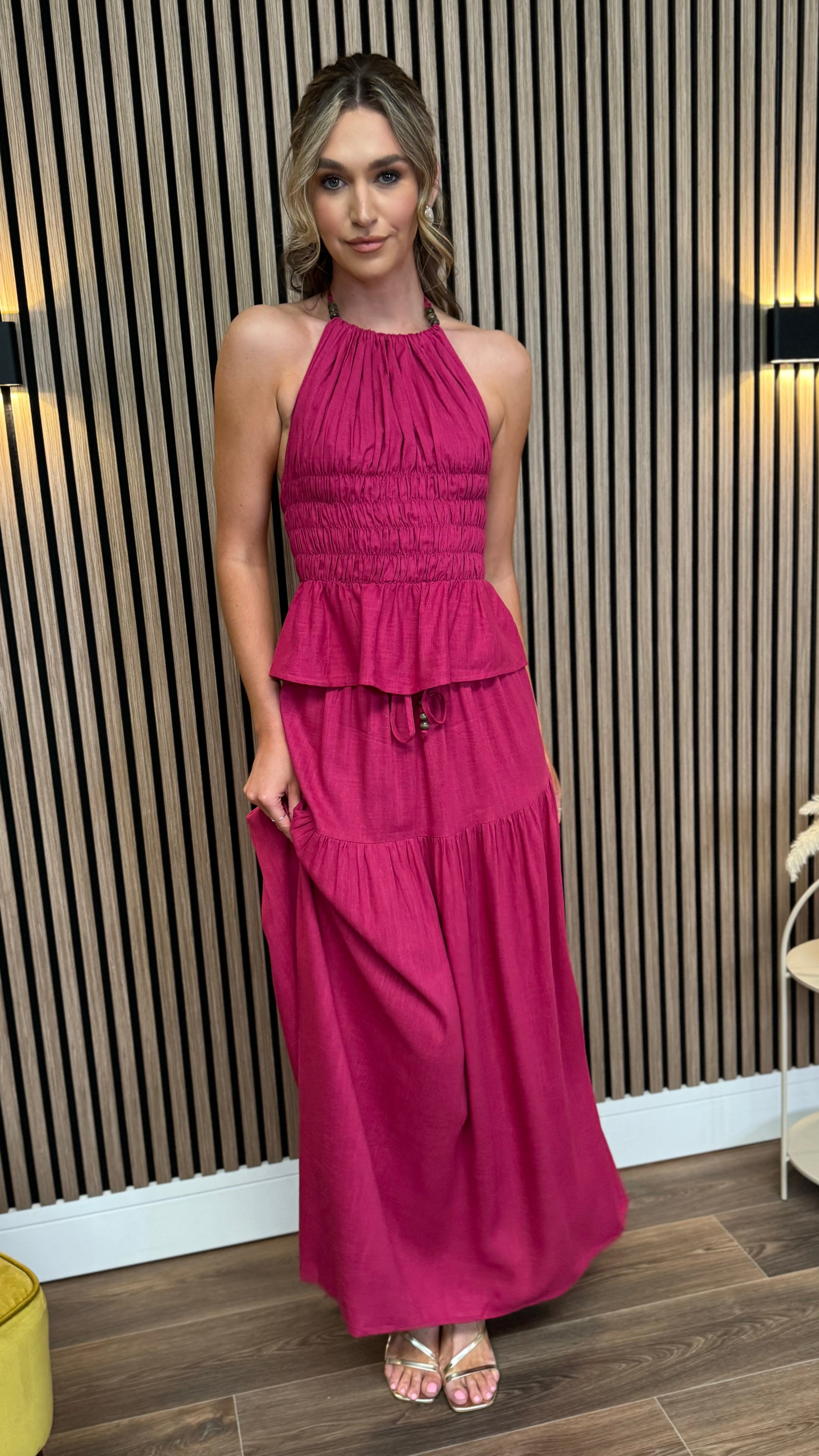 Savannah Fuchsia Linen Beaded Detail Maxi Skirt & Halterneck Shirred Top Co-Ord