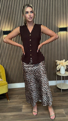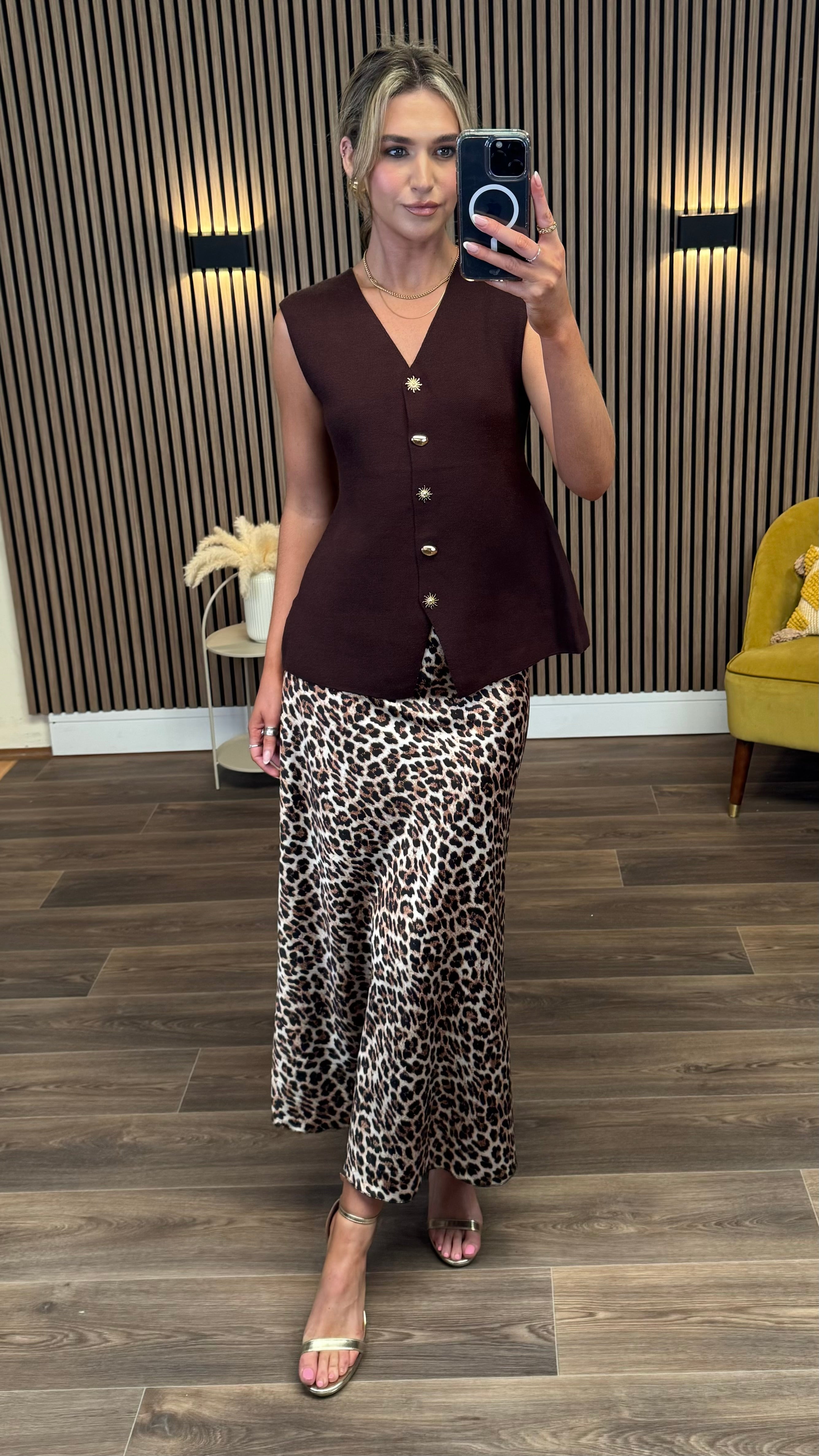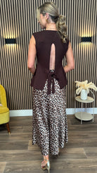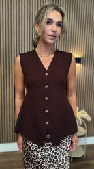 Elevate your style with the Nolan Chocolate Brown & Gold Button Detail Waistcoat. Featuring a chic V-neck and sleeveless design, this waistcoat surprises with mixed gold buttons that add a touch of sparkle. The playful tie-back and front split bring movement and flair, making it perfect for layering or wearing solo. Ready to turn heads? This waistcoat blends bold details with effortless charm.