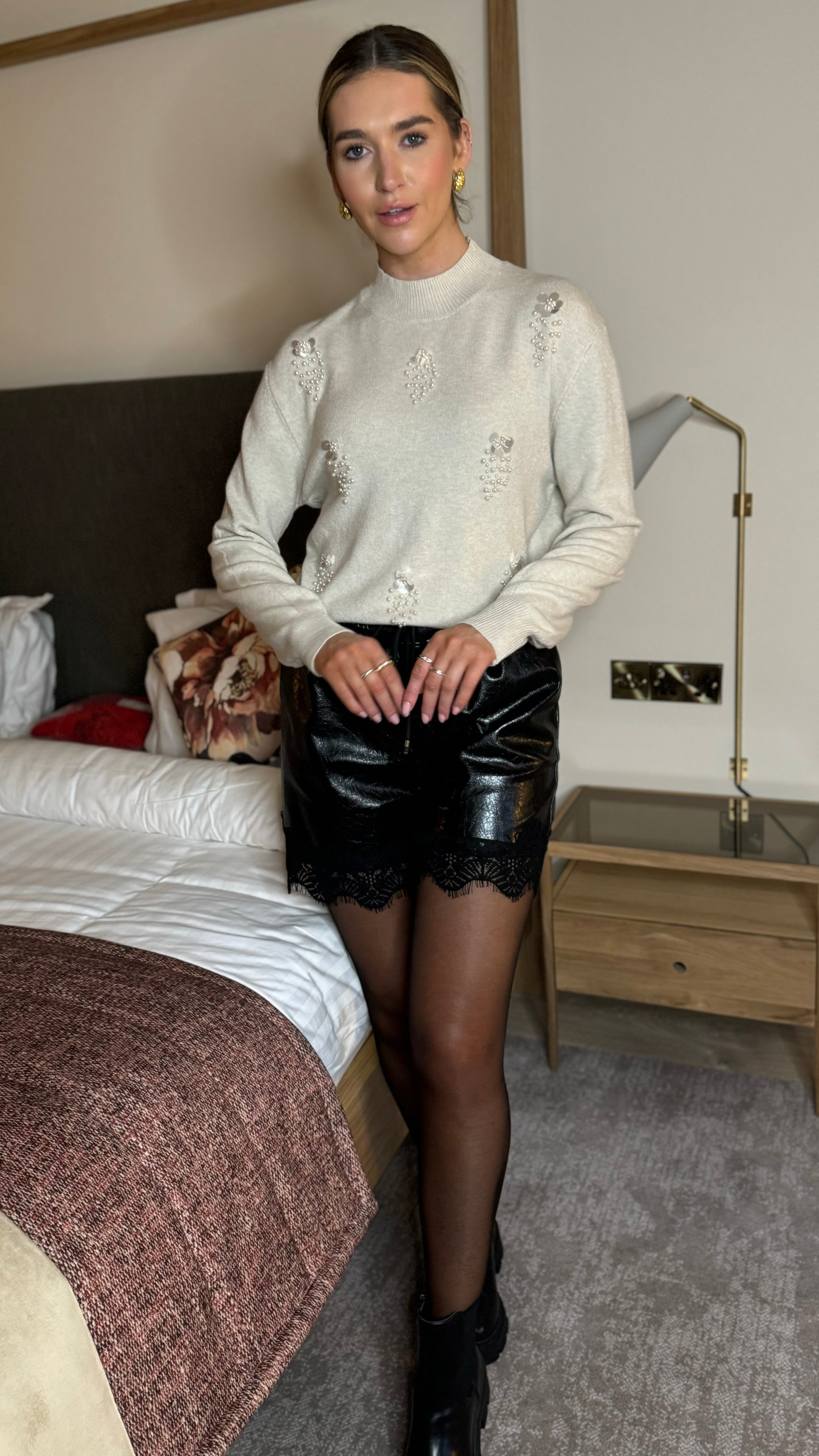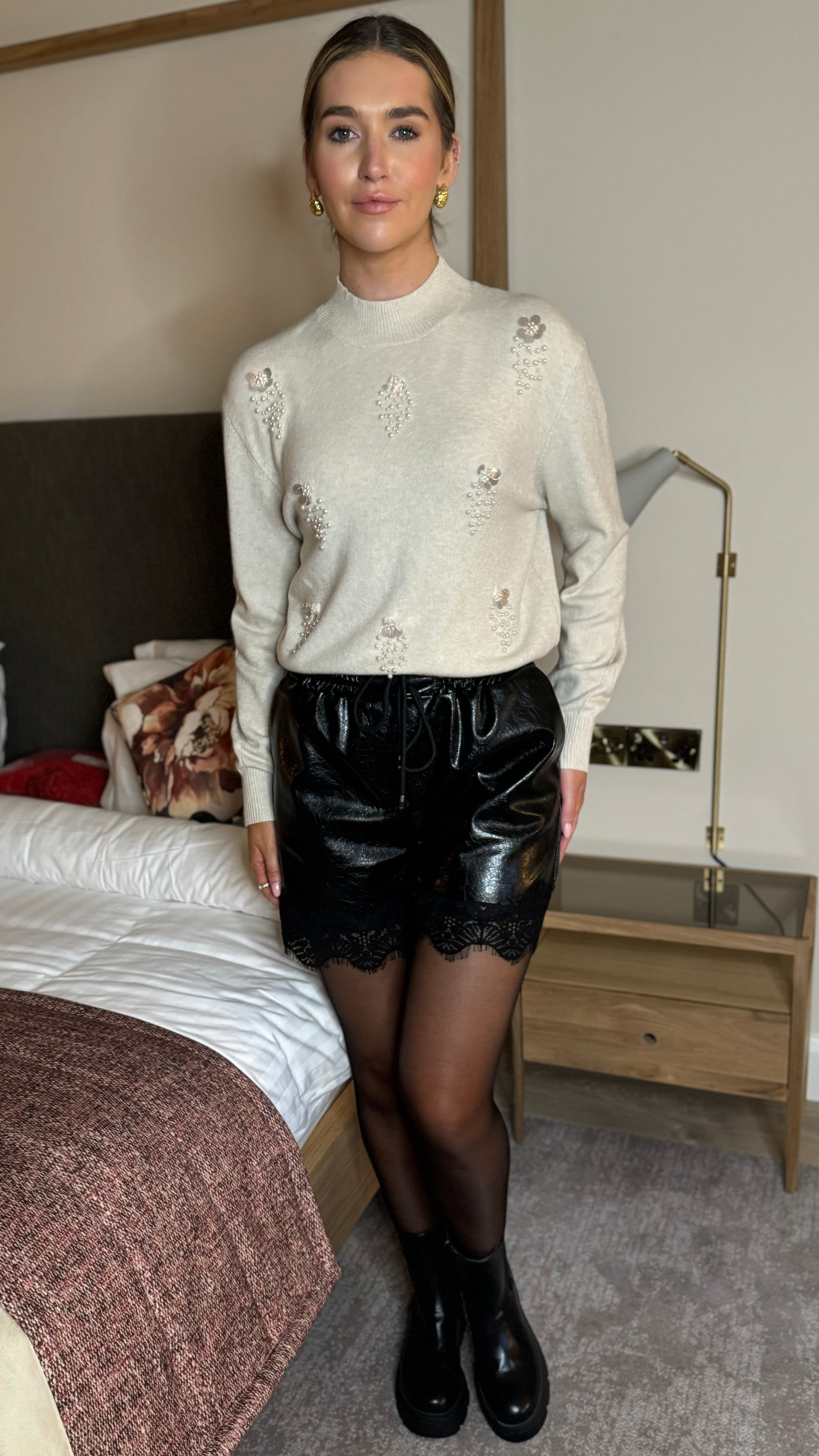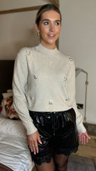 Elevate your everyday knit game with the Nora Beige Pearl Embellished Knit Jumper—a playful twist on classic comfort. This cozy layer features a chic high neckline that frames your face beautifully, while delicate pearl embellishments add just the right amount of sparkle without trying too hard. Long sleeves keep you warm and toasty, finished with fitted cuffs that hug your wrists perfectly. Whether you're dressing up for brunch or keeping it casual, this versatile beige knit is your new go-to piece for effortless style.