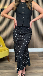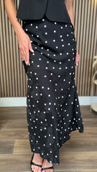 This Olive Black & White Polka Dot Skirt with subtle floral accents offers a sophisticated blend of classic patterns and delicate detailing. Its refined design makes it an ideal choice for elevating your everyday wardrobe with timeless elegance.