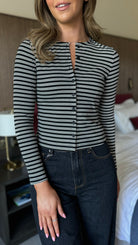 This Olive Black & White Stripe Button Down Top is the ultimate mix of comfy and chic. With long sleeves and a soft, stretchy fabric, it hugs you just right while keeping things relaxed. The playful round neckline adds a fun twist to the classic button-down style.