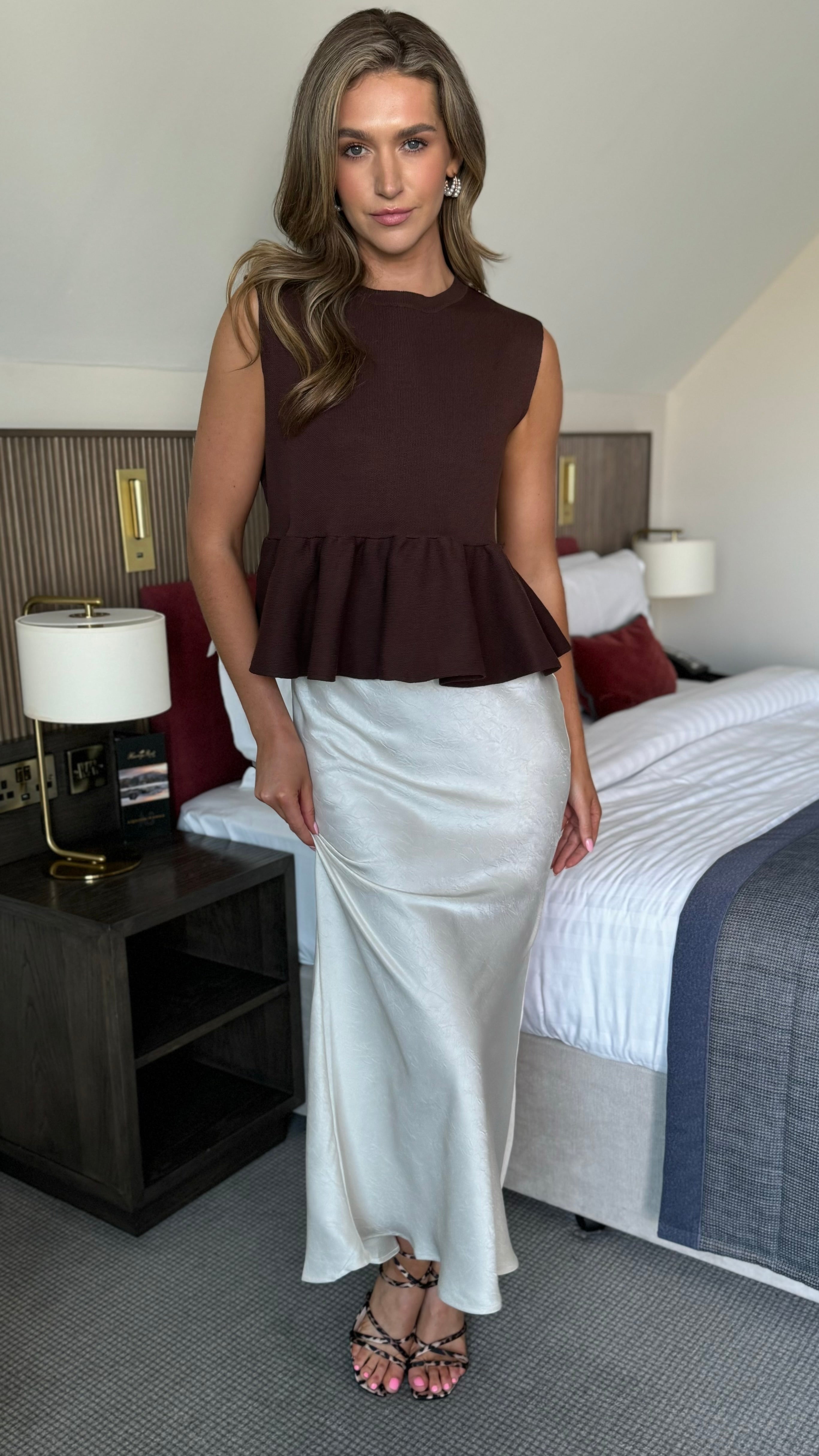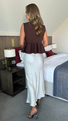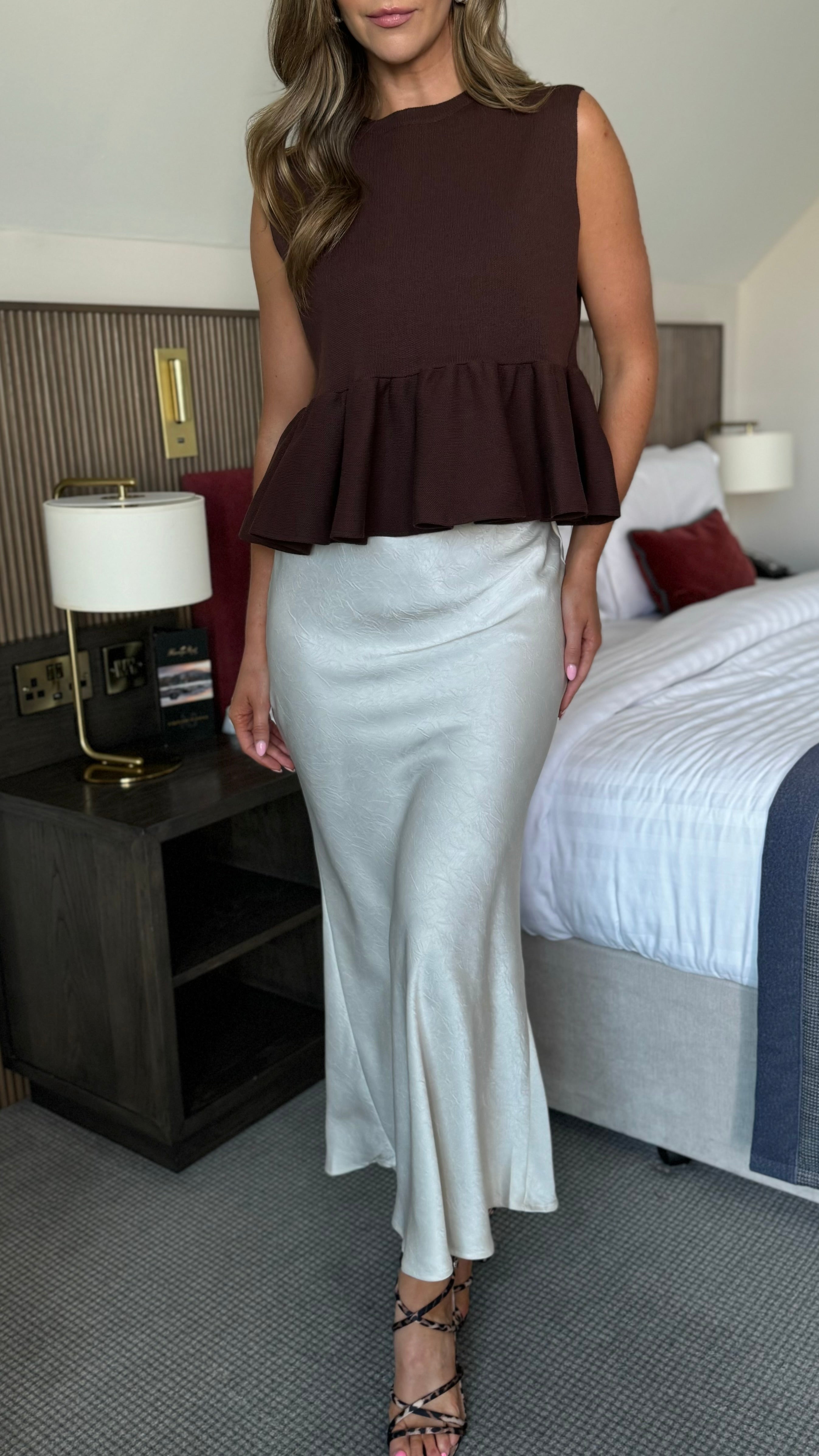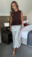 Indulge in luxury with the Raelynn Ivory Satin Midi Skirt. The soft satin material drapes elegantly for a sophisticated look. The ivory hue adds a touch of femininity and romance. Perfect for any occasion, this midi skirt is sure to turn heads.