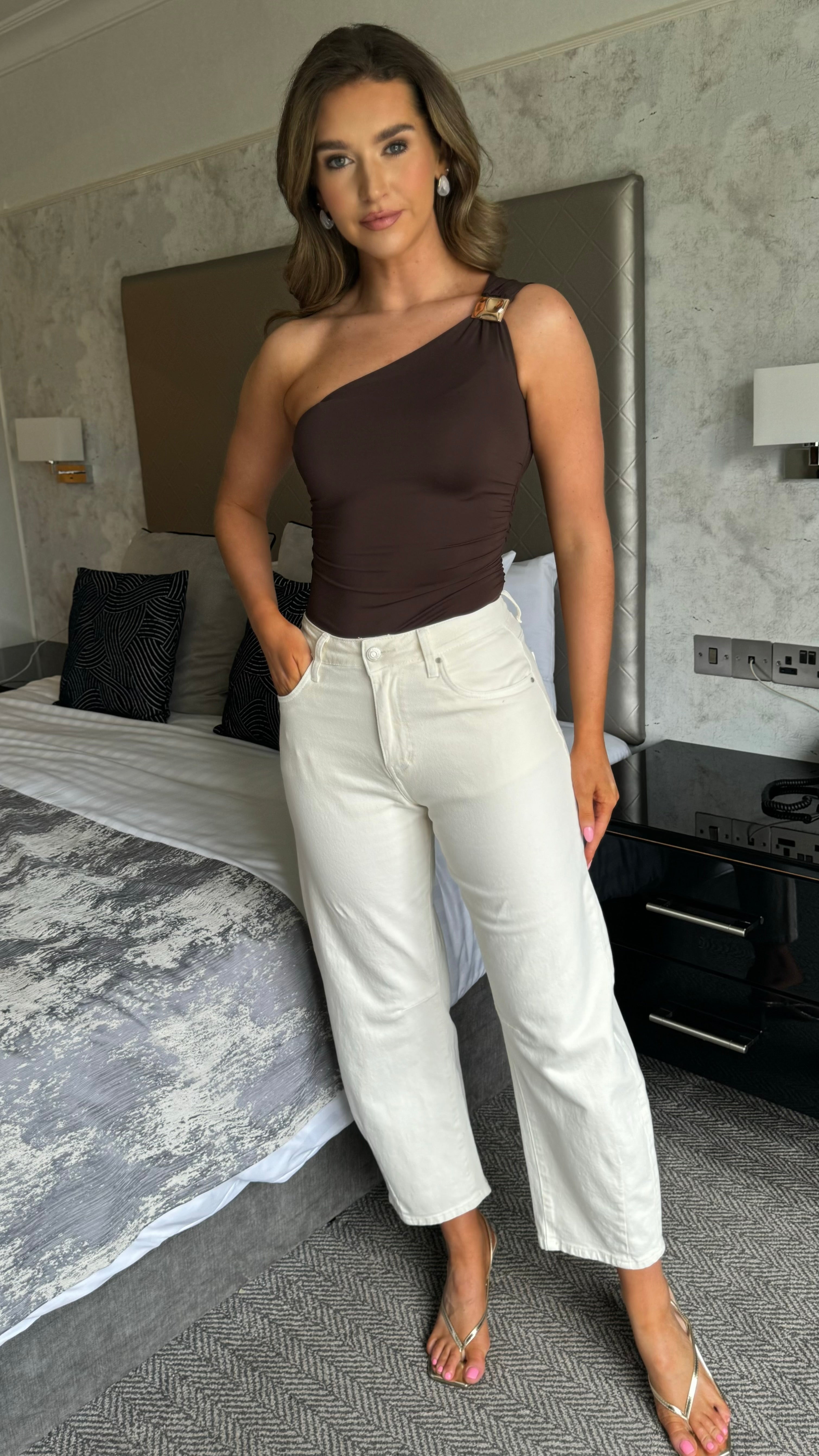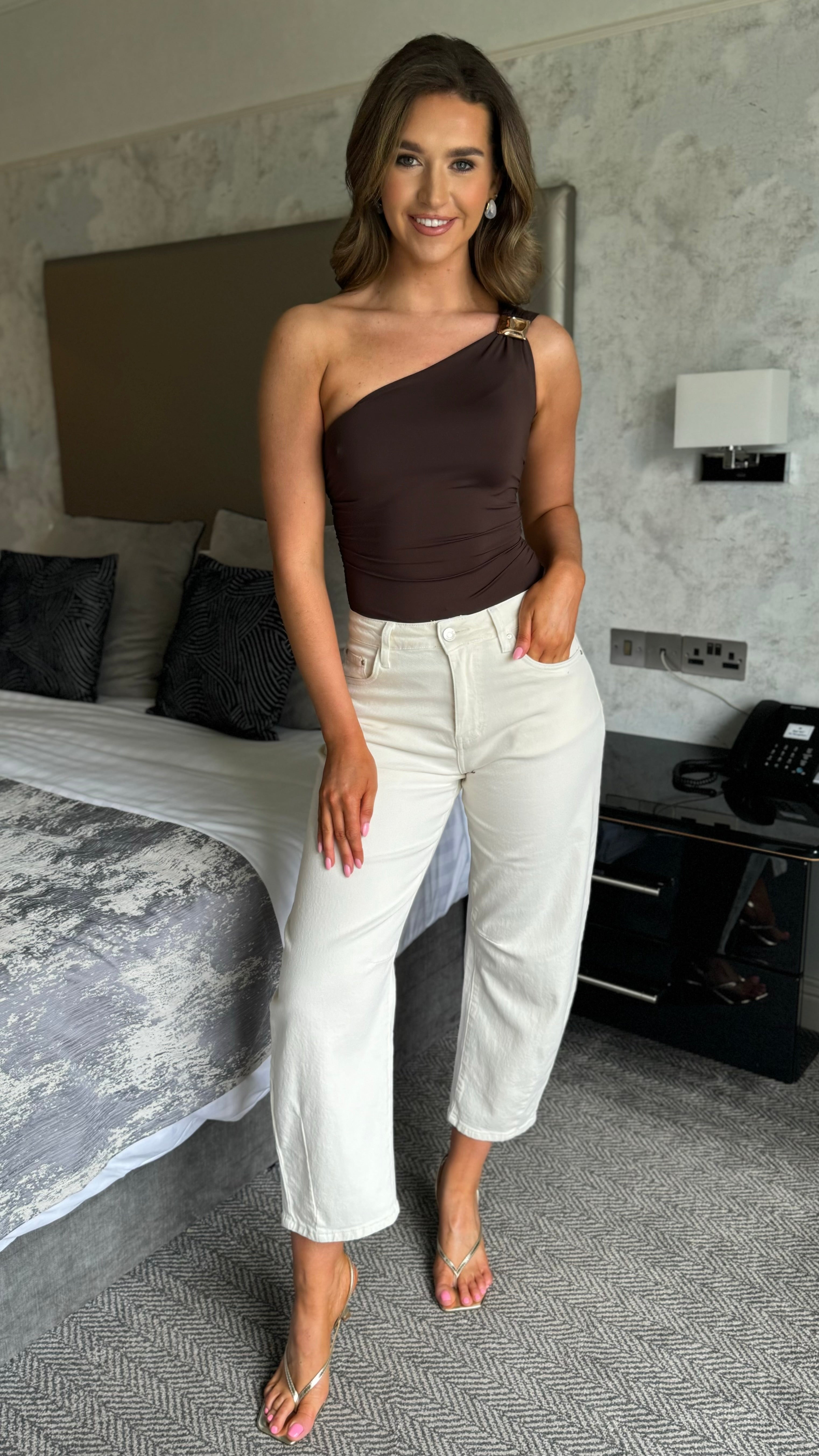 Effortless elegance meets contemporary edge with this one-shoulder bodysuit. Crafted from soft, slinky fabric that drapes beautifully against the body, it features a striking gold detail at the shoulder and a secure clasp fastening for easy wear. Perfect layered under blazers or styled solo for a statement look. The streamlined silhouette flatters and moves with you, making it an essential piece for both day and evening wear.