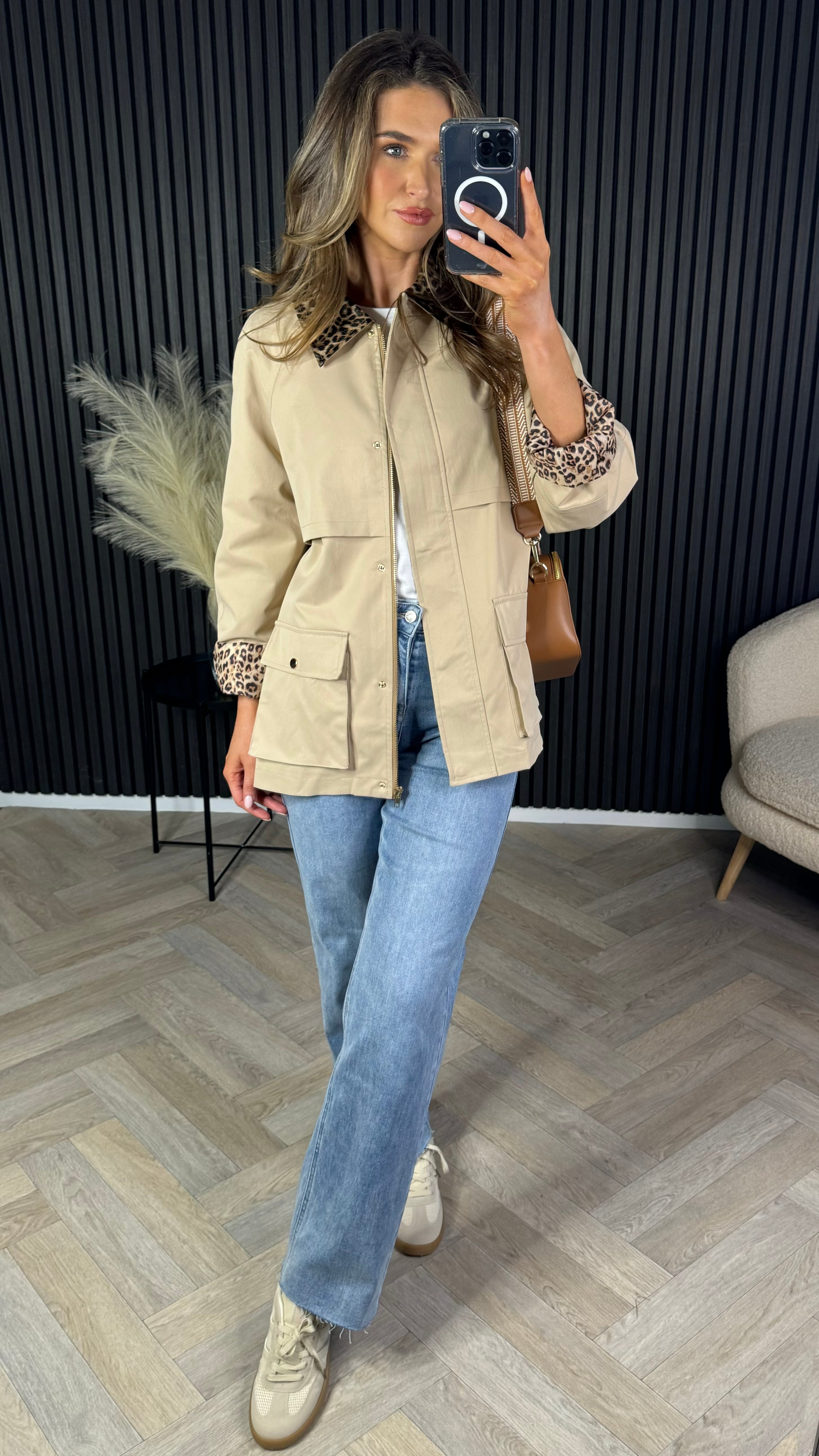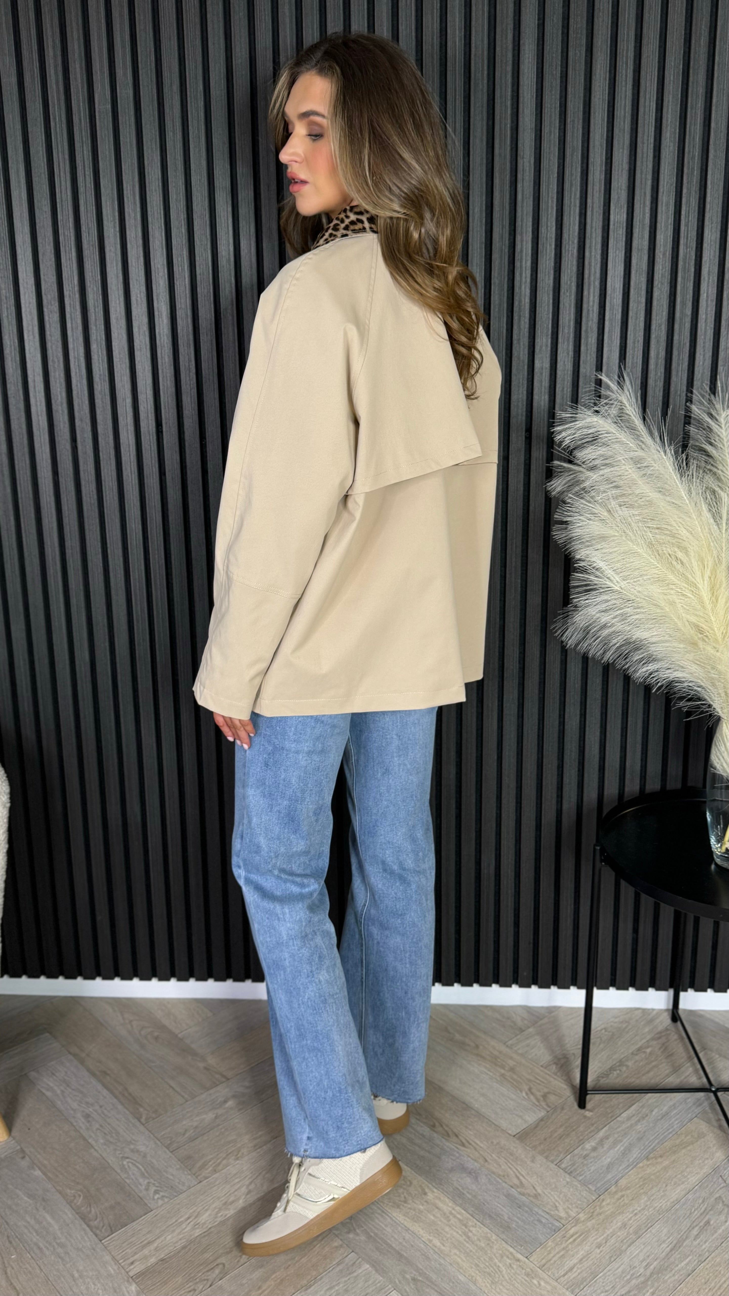 Be the fierce fashionista in our Reya Beige Leopard Collar Oversized Jacket! Featuring a leopard collar and optional cuffs, this jacket elevates any outfit. With a concealed zip and pockets, it's practical and stylish. Unleash your inner wild side!