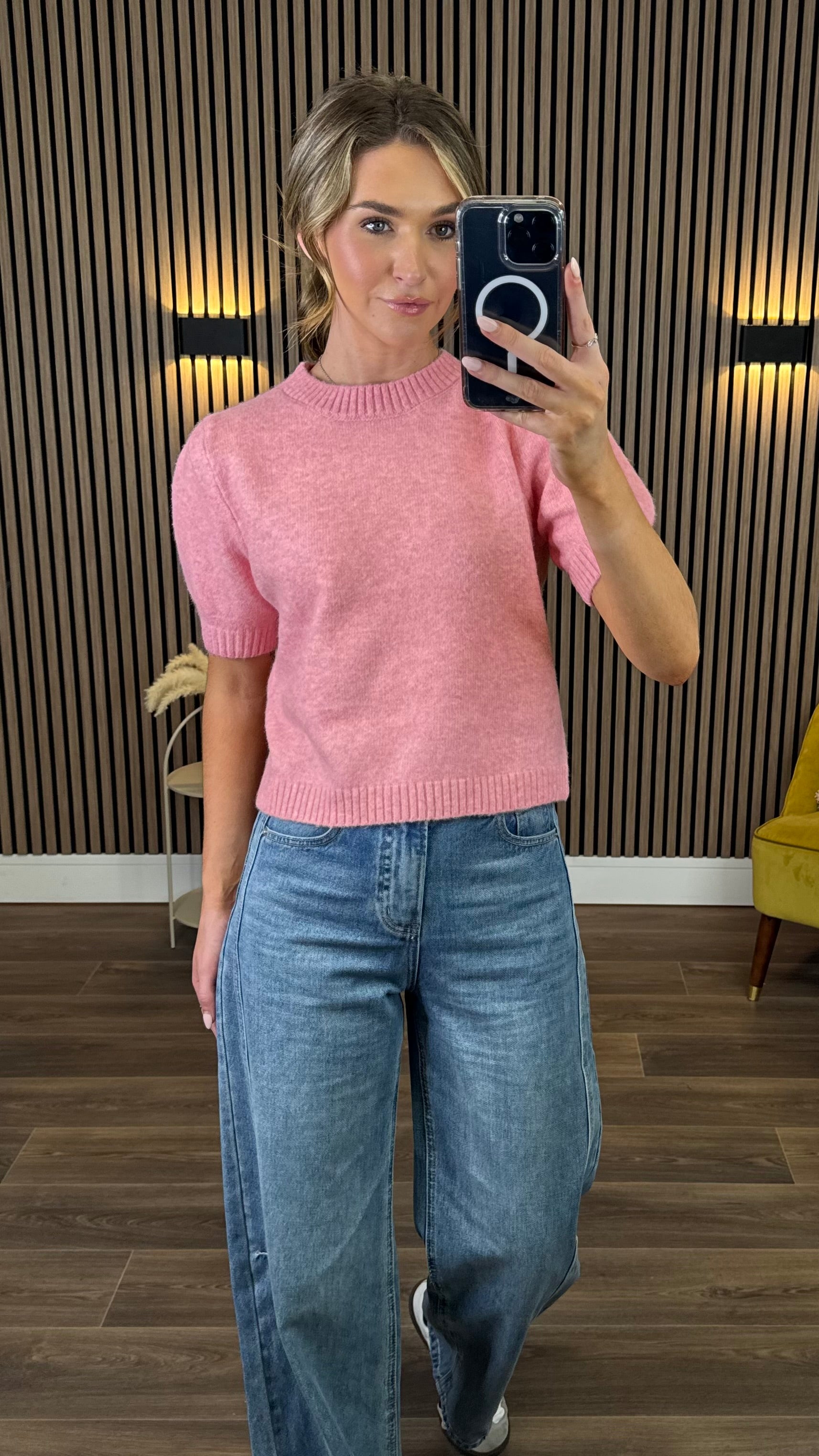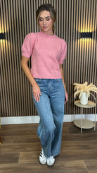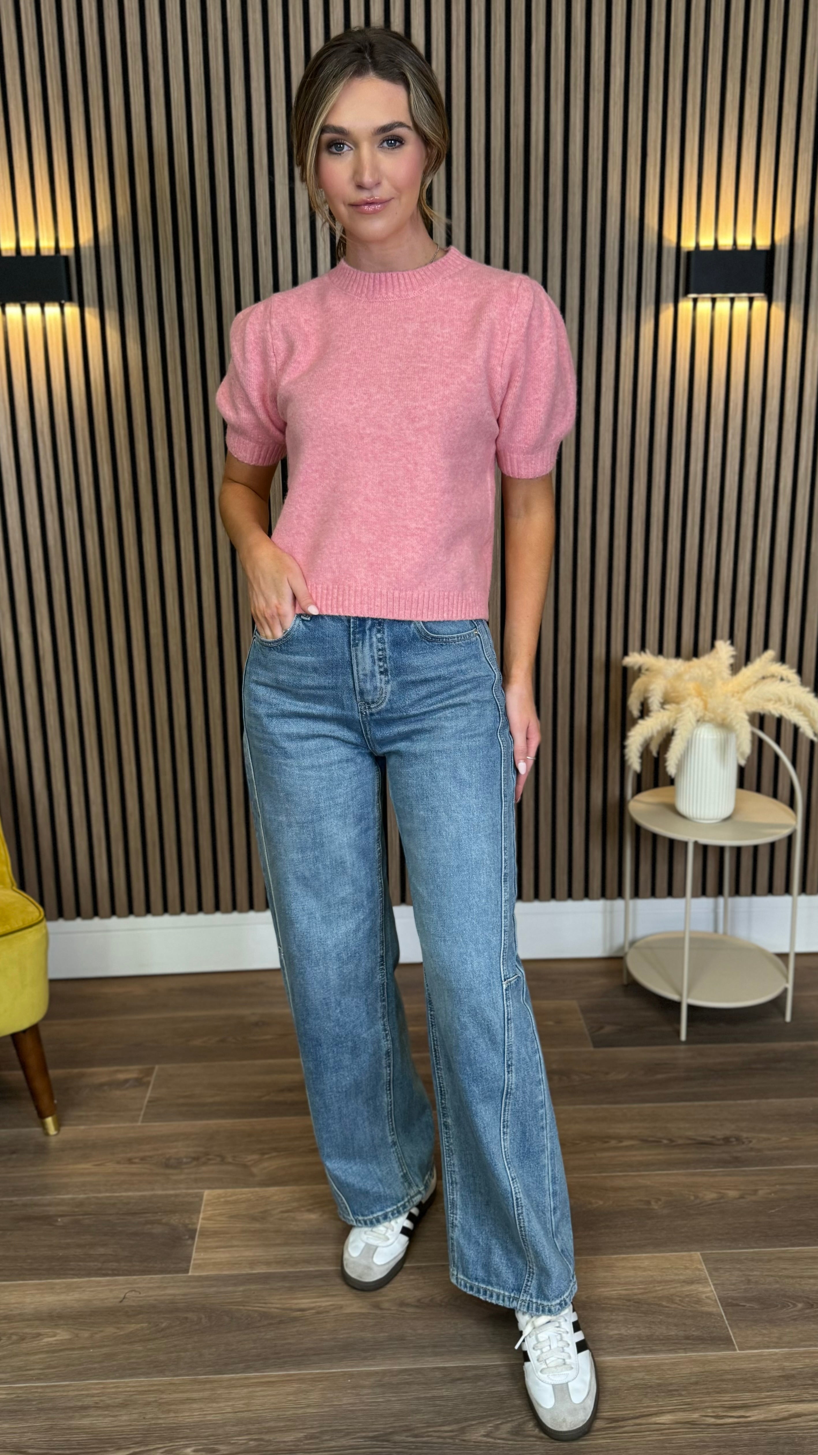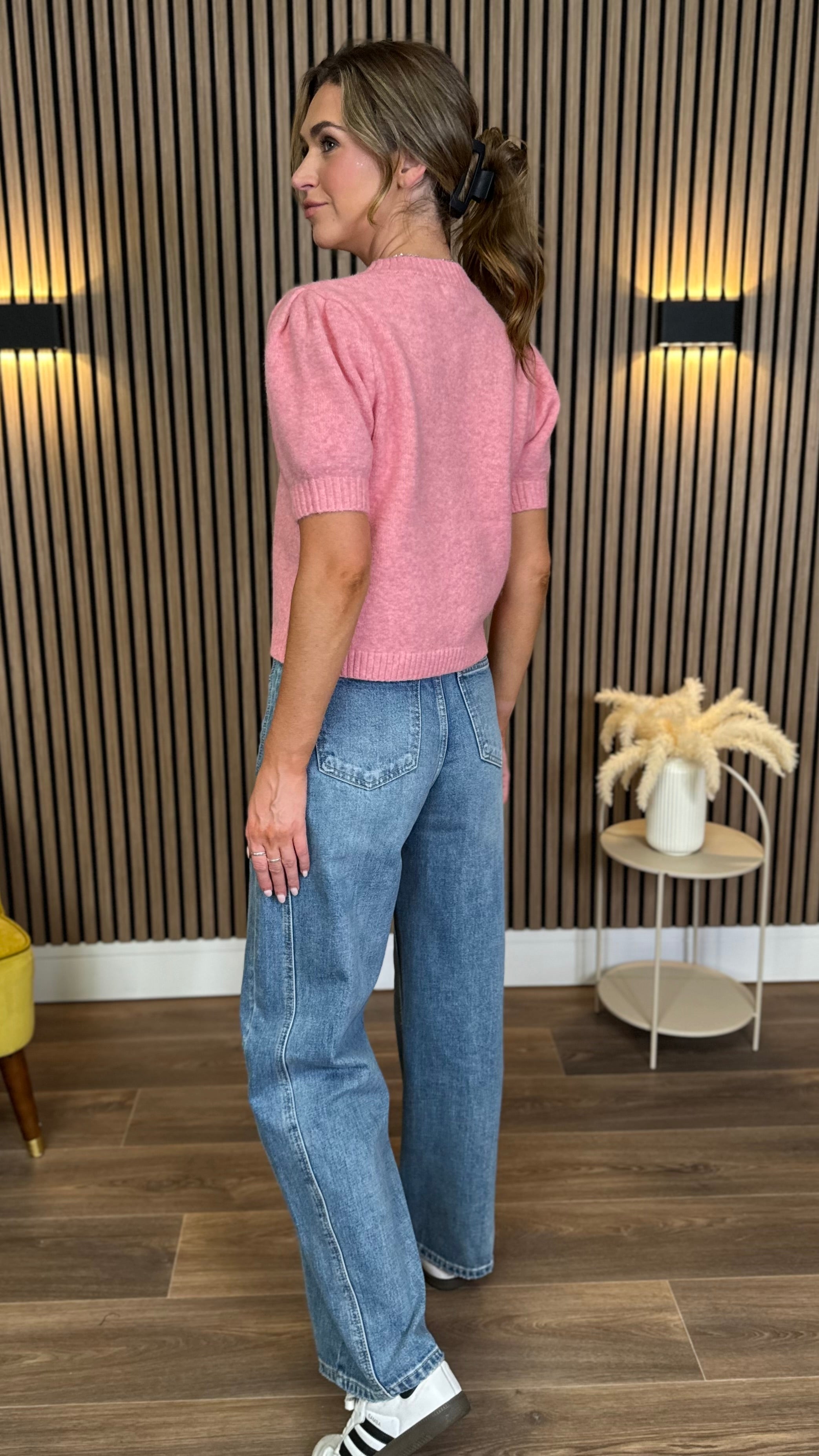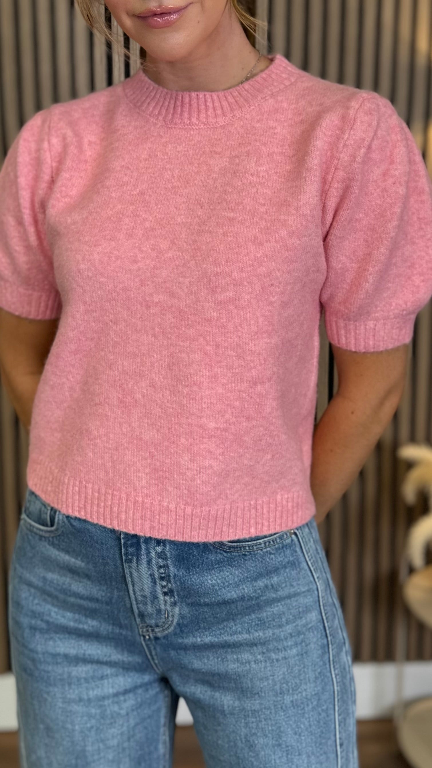 Rylee Pink Short Puff Sleeve Knit Sweater