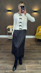 Flirt with fun style in the Salem Black Polka Dot Satin Slip Skirt. Its high-waisted fit with an elasticated waistband ensures comfort that moves with you, while the delicate lace trim adds a cheeky touch of elegance. Perfect for dancing through the day or twirling into the night!