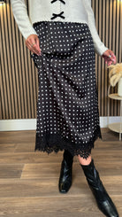 Salem Black Polka Dot Satin Slip Skirt With Lace Trim