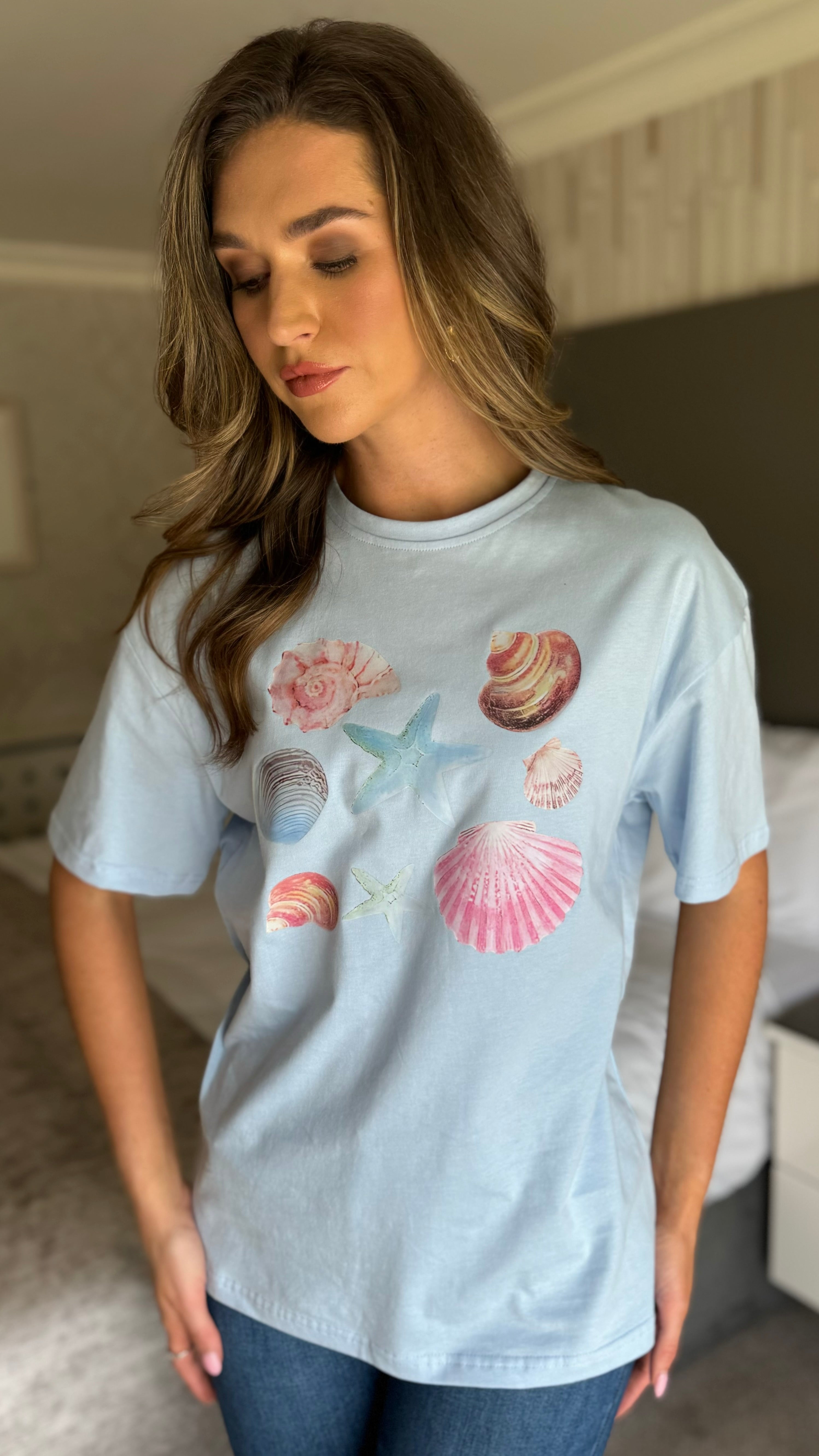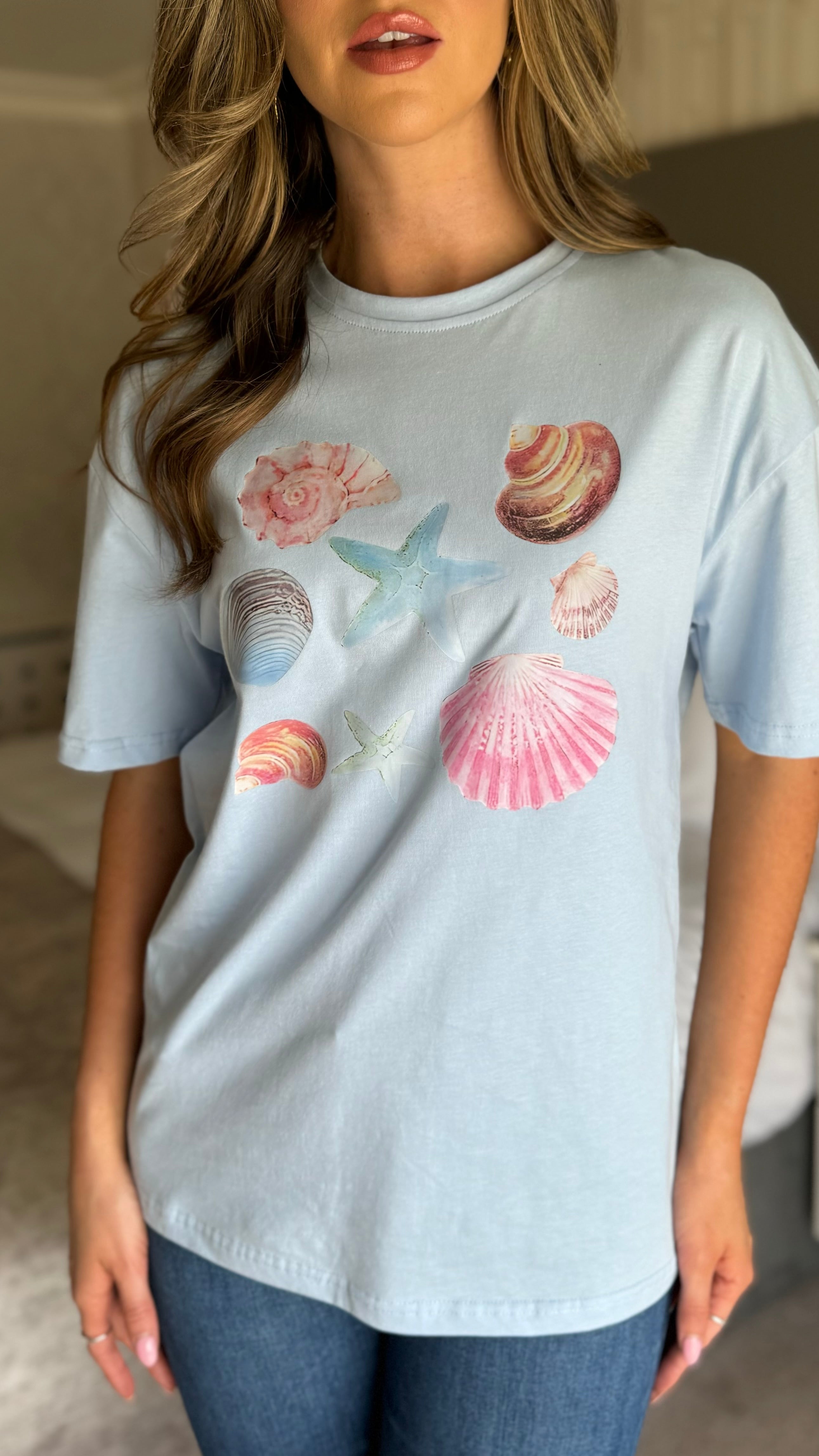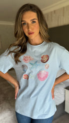 Introducing our Saria Blue Graphic 'SHELLS' Printed T Shirt. Made with premium quality material, this luxurious t-shirt features a stunning graphic design of seashells that adds an artistic touch to any outfit. Stay stylish and comfortable with Saria.