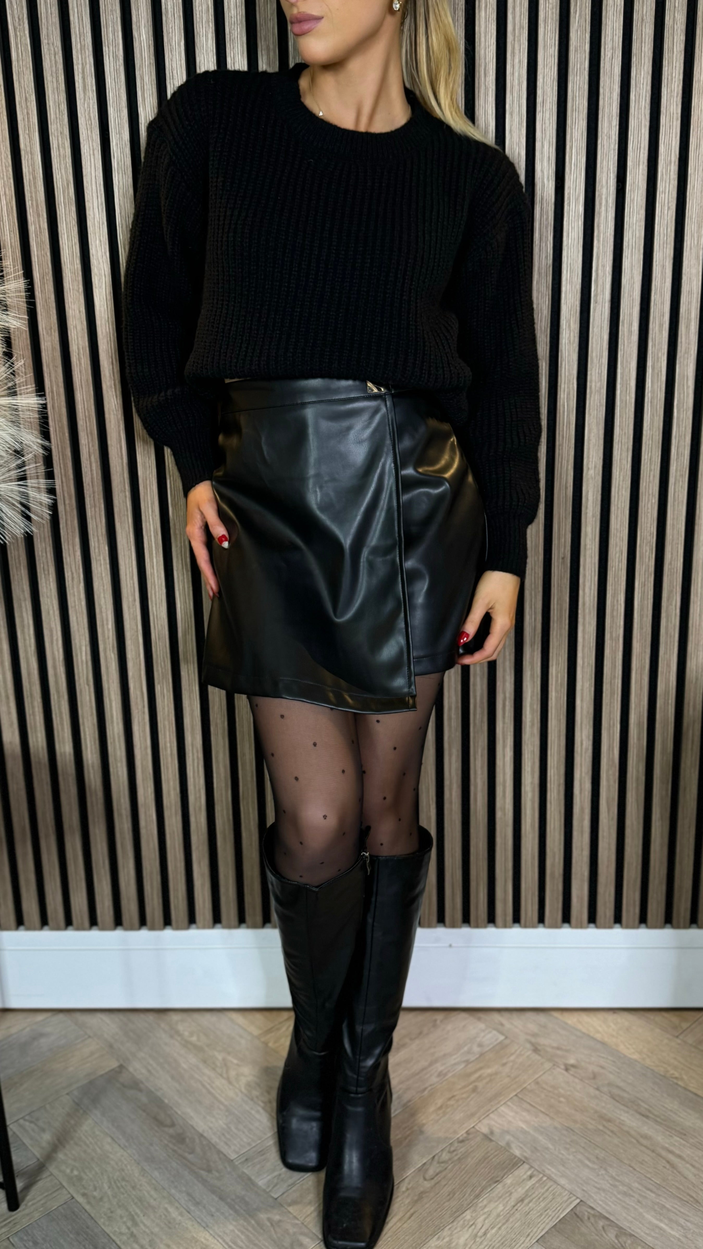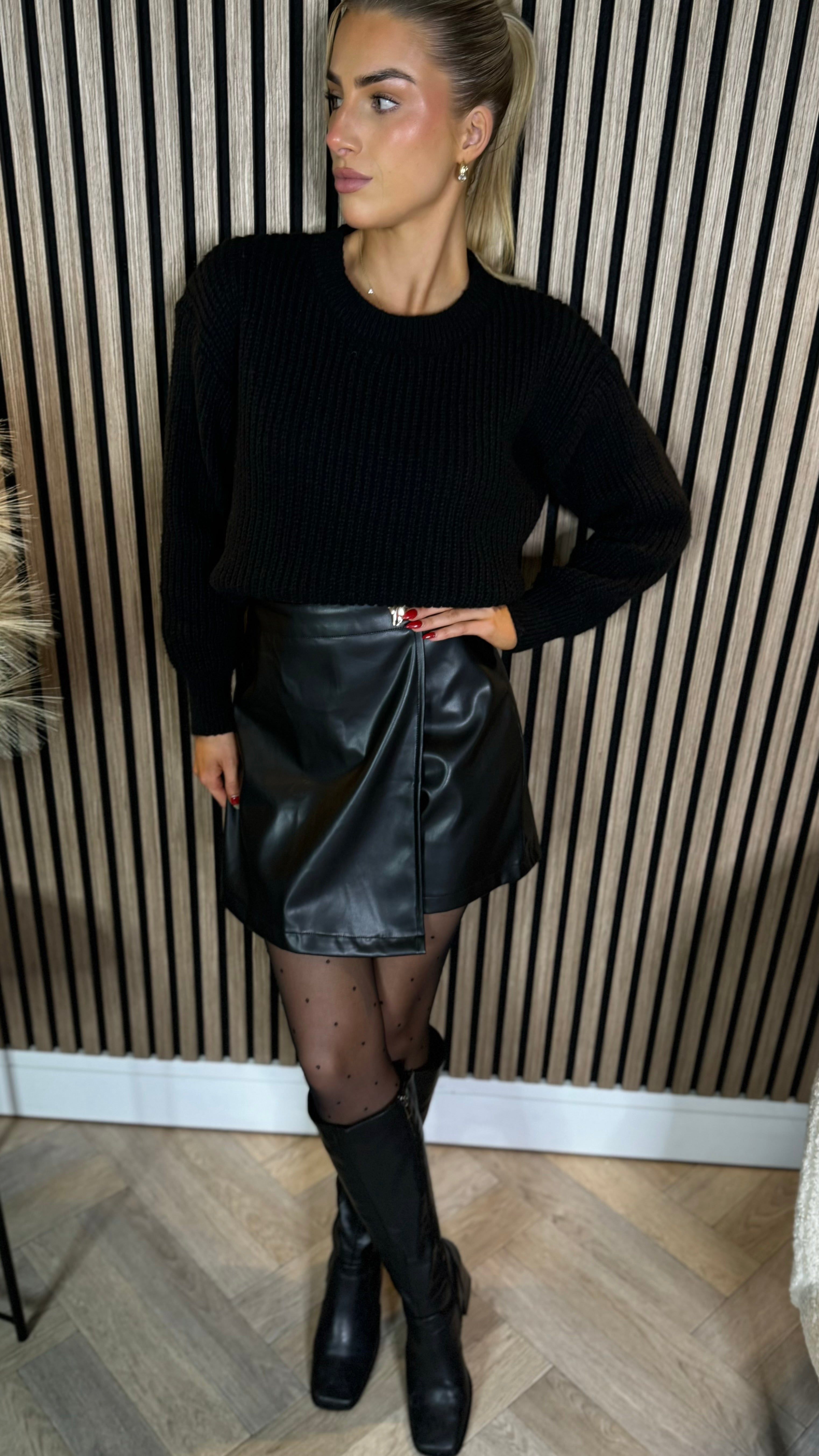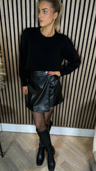 Introducing the Sofia Black Wrap Detail Leather Look Skort - the perfect combination of style and comfort! With its wrap effect design and stunning gold buckle detail, this skort offers the look of a skirt with the ease and mobility of shorts. Upgrade your wardrobe with this versatile piece today! 💃🏼