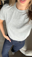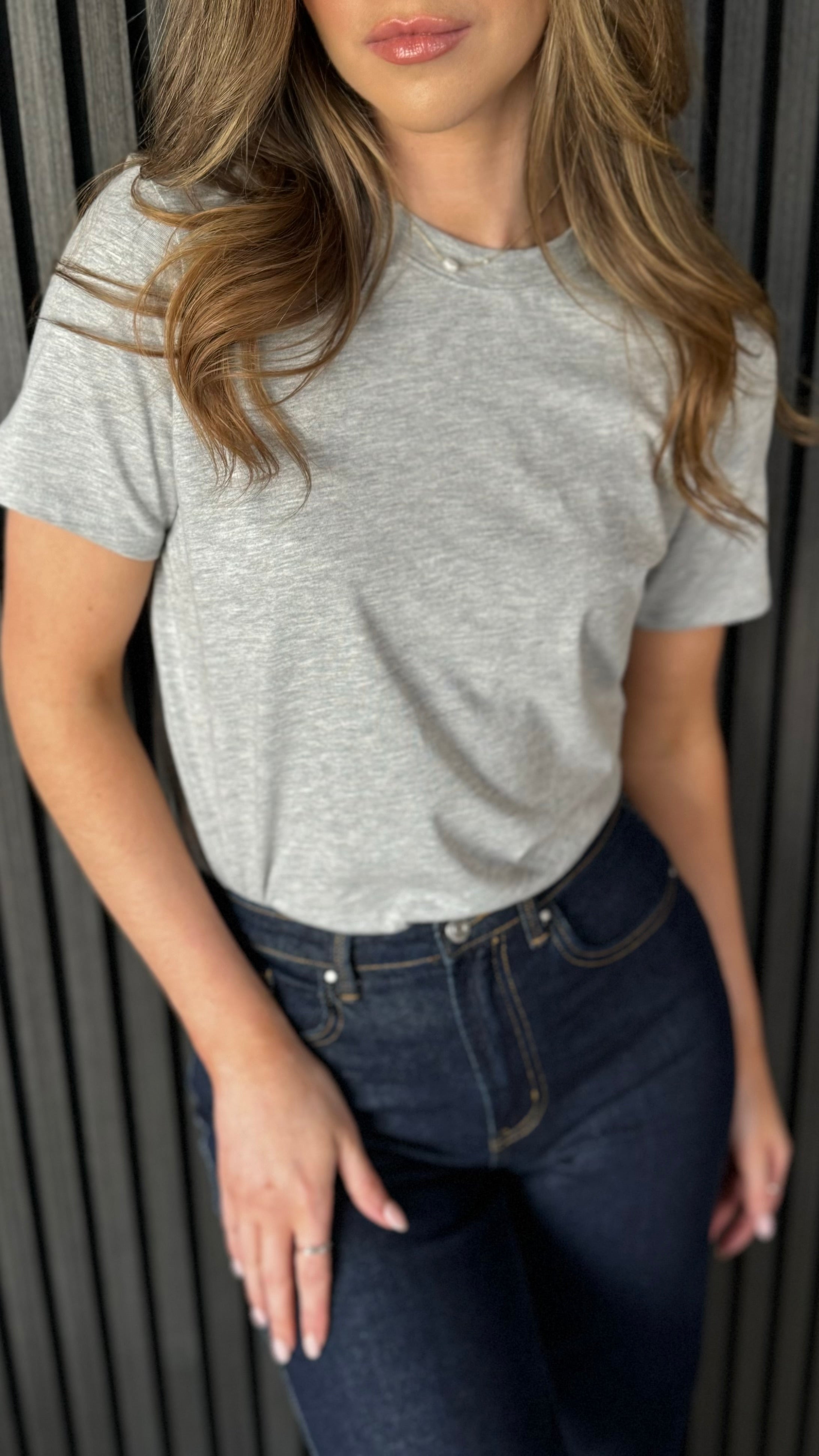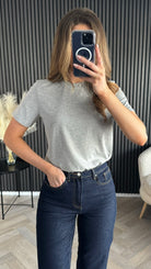 This Sophie Grey Cotton T Shirt is a must-have for any wardrobe. With its classic crewneck and short sleeves, it offers a comfortable and stylish look. Made with high-quality cotton, it ensures a regular fit, making it perfect for everyday wear. A versatile and timeless piece!