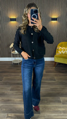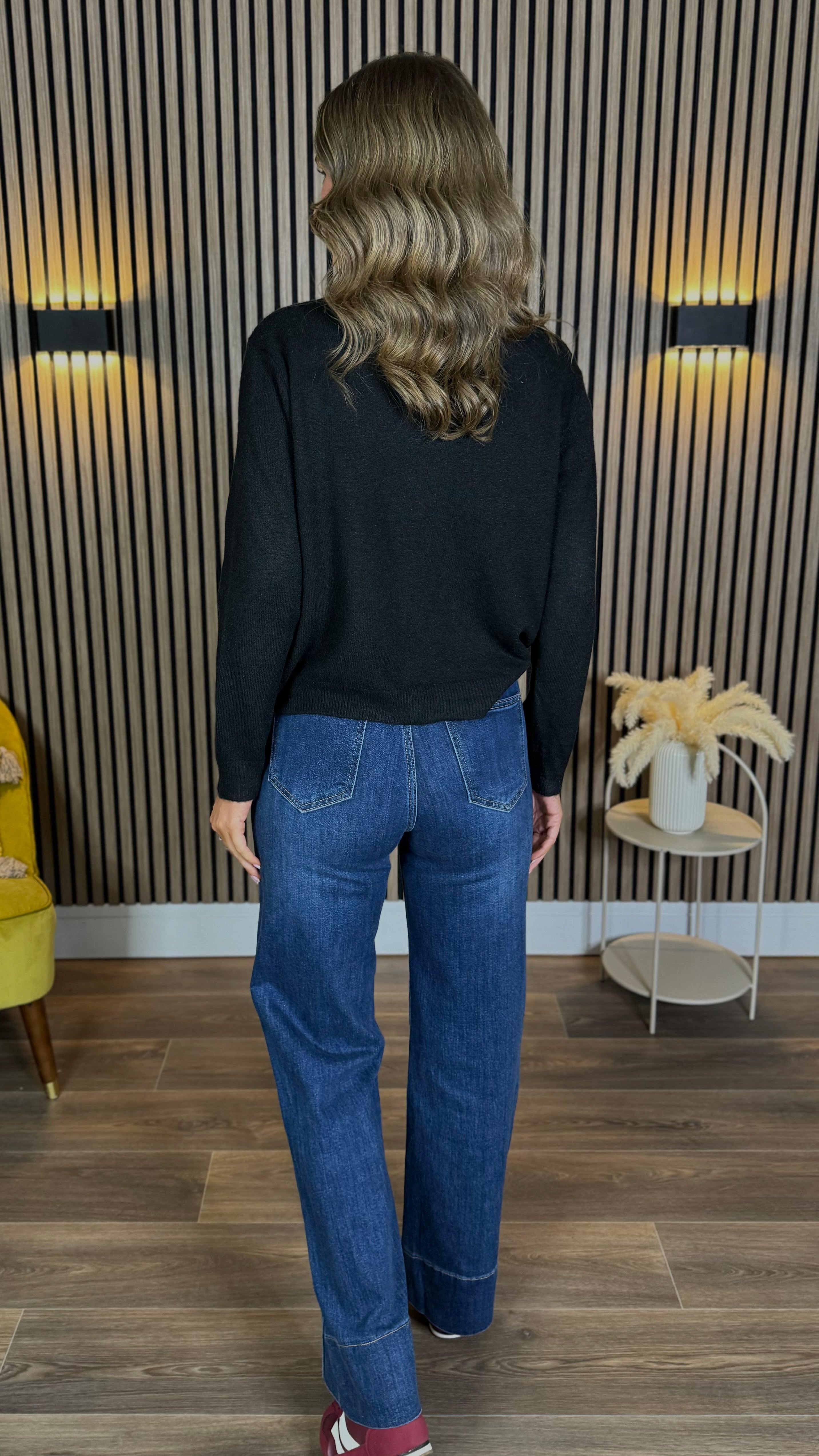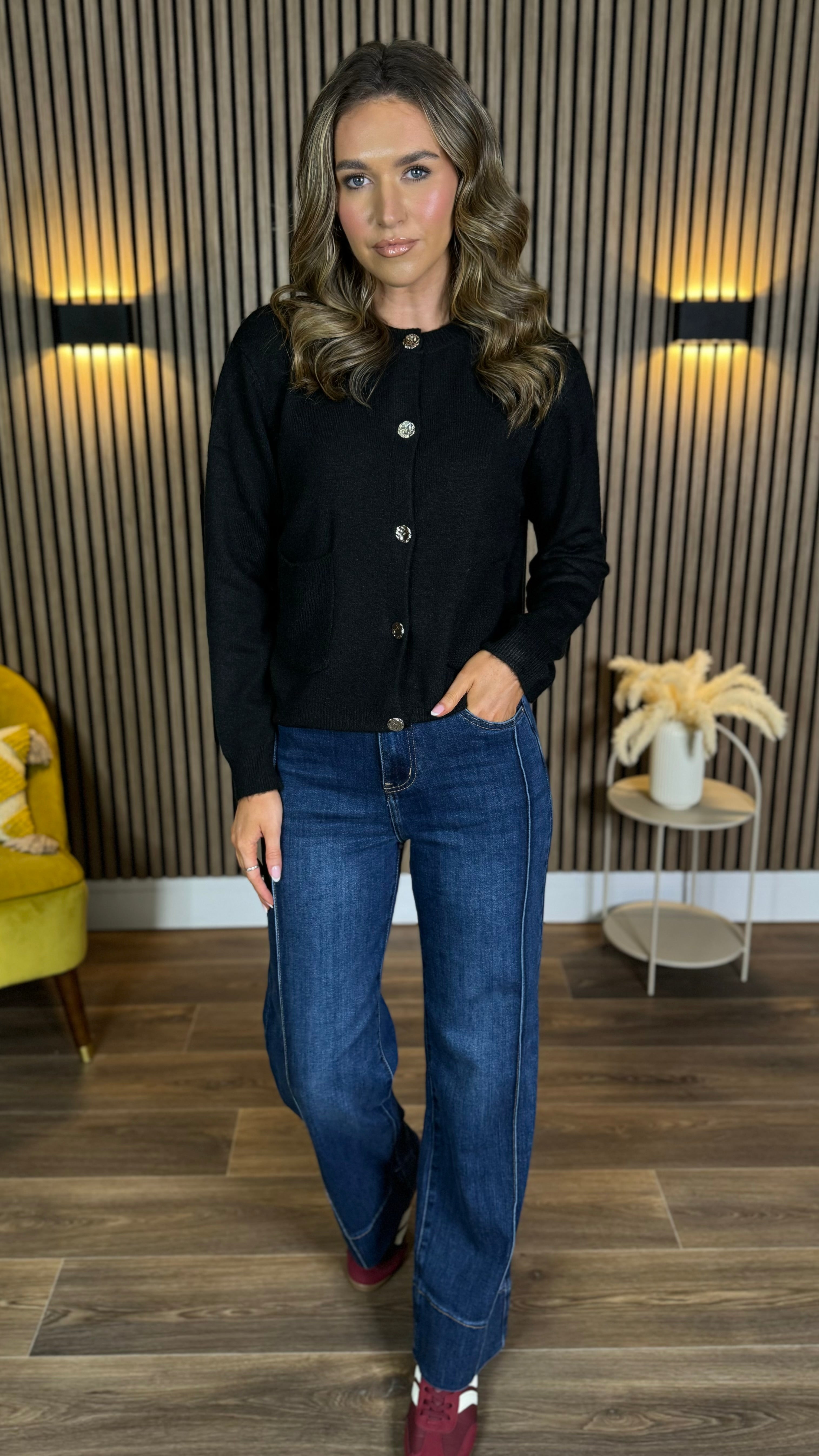 Wrap yourself in cozy charm with the Stormi Black Soft Knit Cardigan. Its soft, fluffy fabric feels like a gentle hug, while sparkling jewel buttons add a touch of sparkle to your day. The round neckline and ribbed hem and cuffs complete the playful yet polished look, making it perfect for layering anytime you want to stay comfy and cute.
