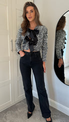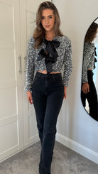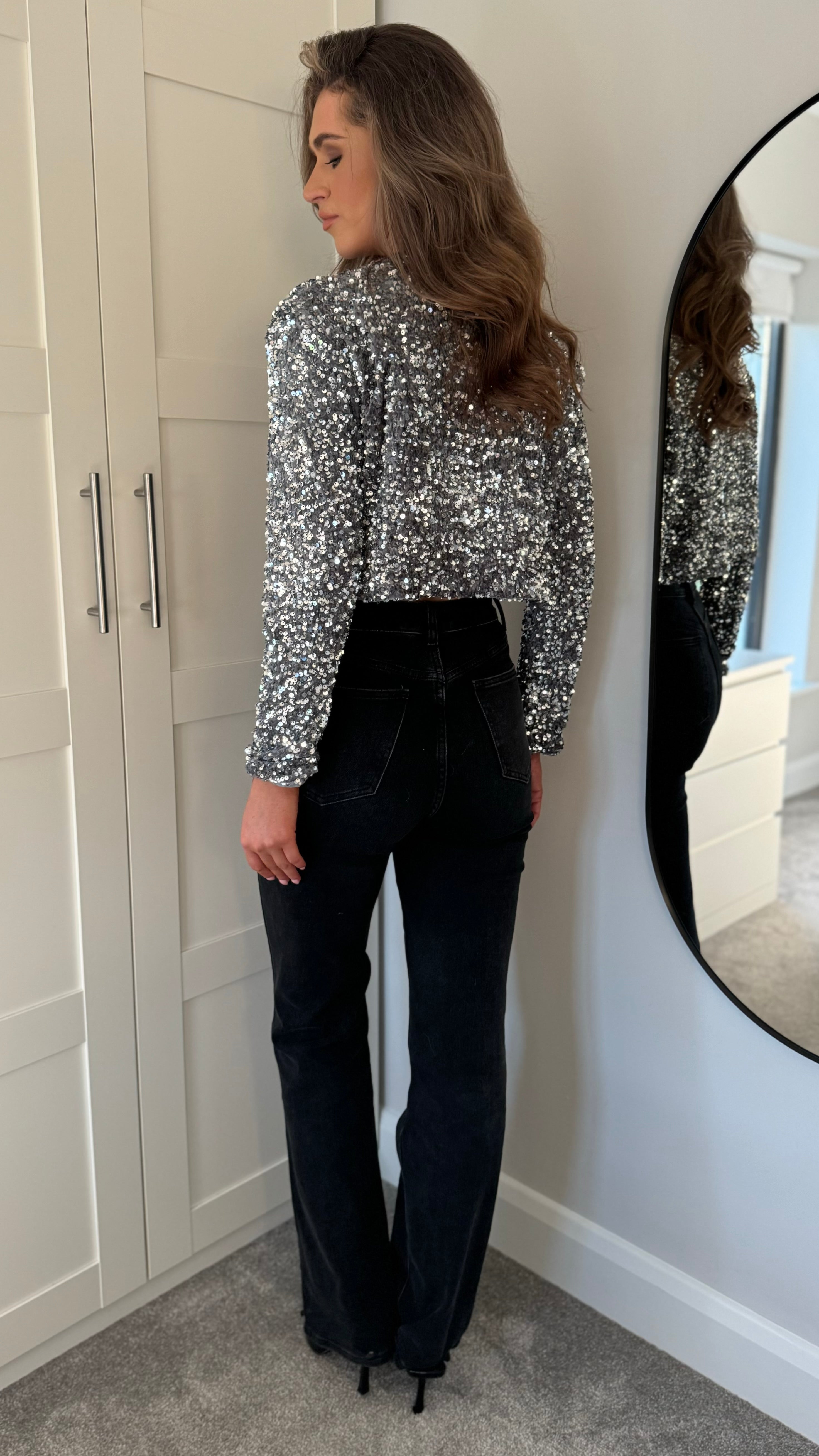 Sparkle and shine with the Tahlia Silver Sequin With Black Bow Detail Top! This playful top features an open sequin design and a unique bow detail closure. Its slight crop length adds a fun twist to any outfit. Get ready to turn heads and make a statement with this quirky and stylish top! ✨🎀