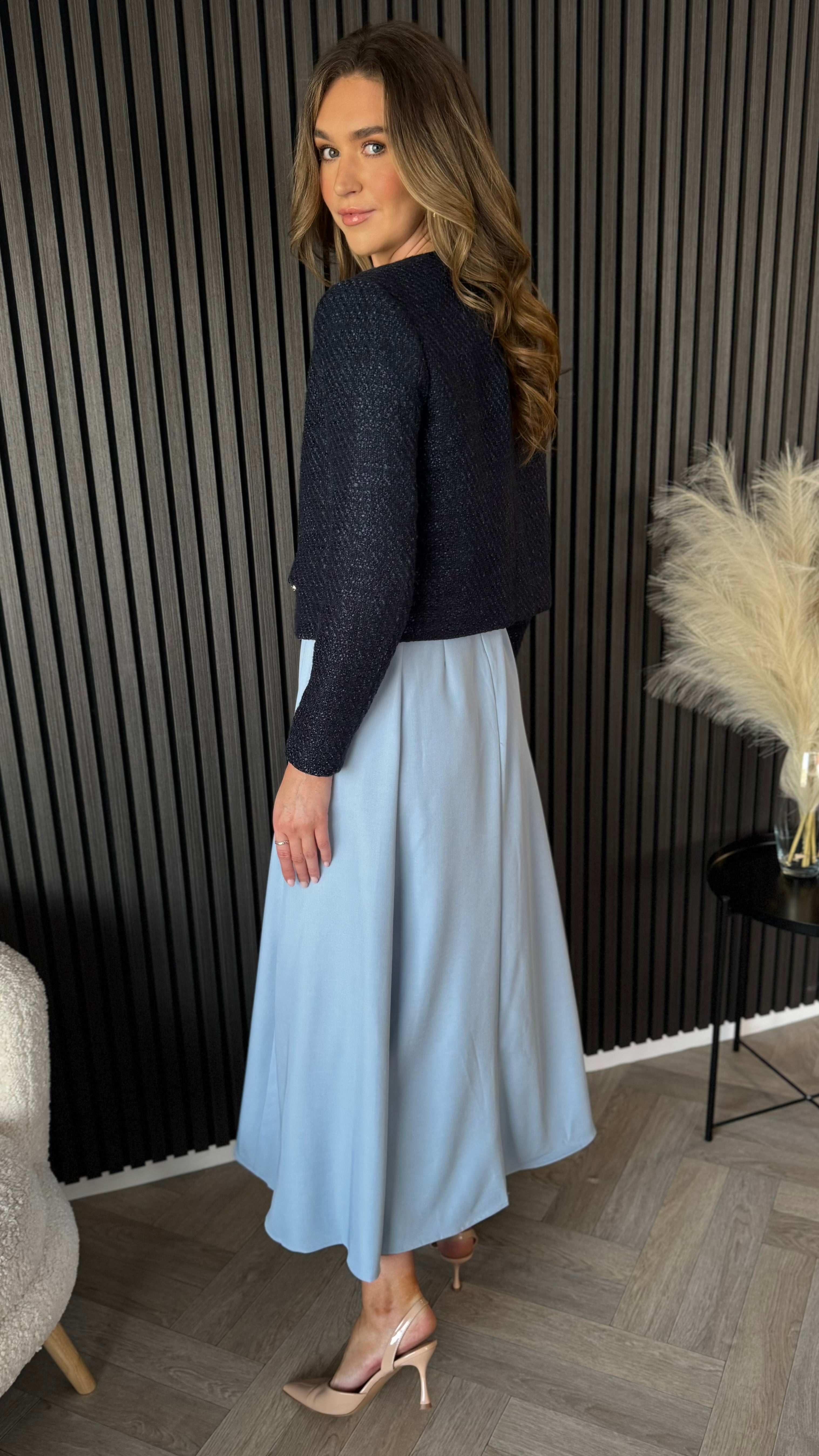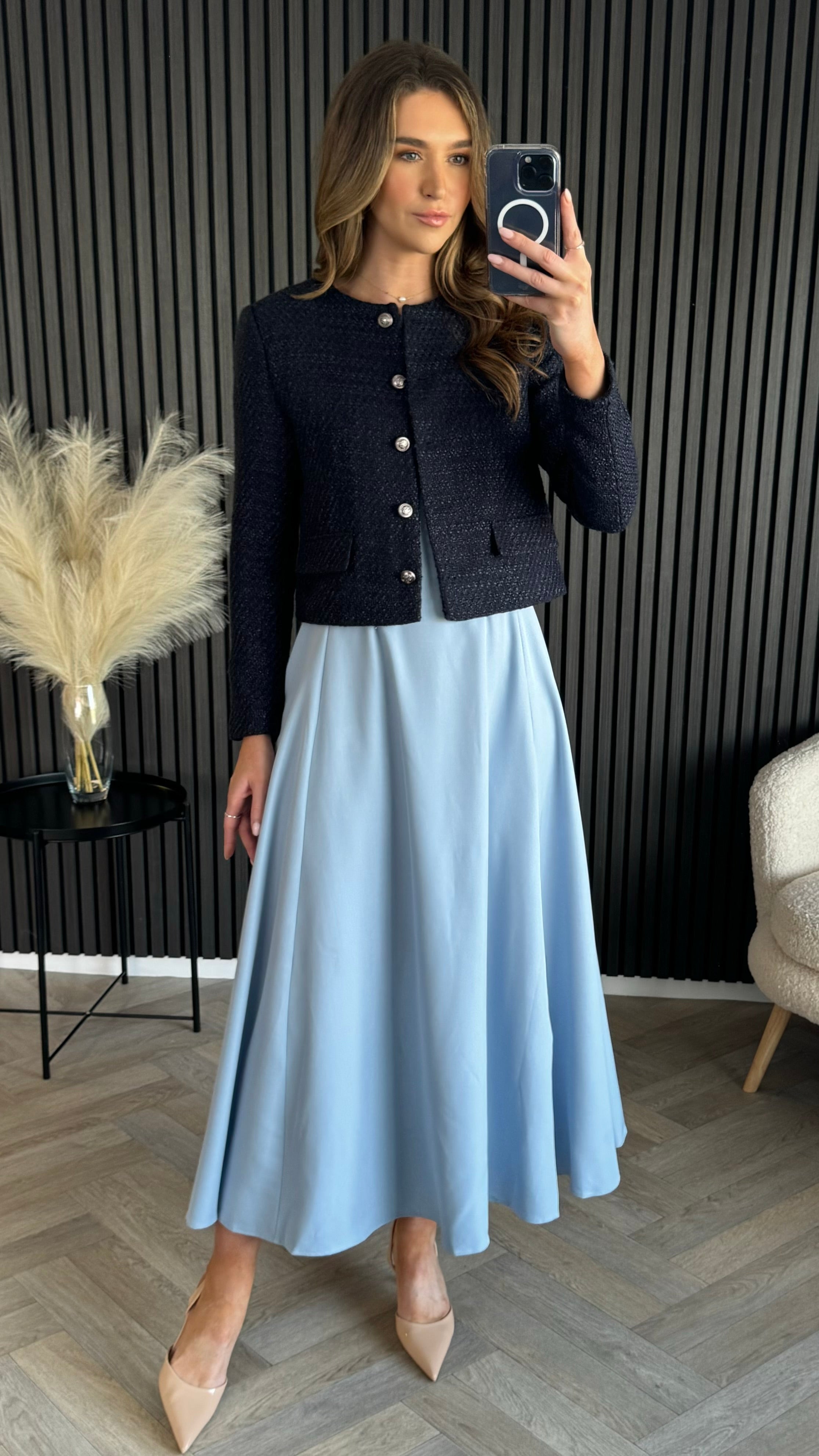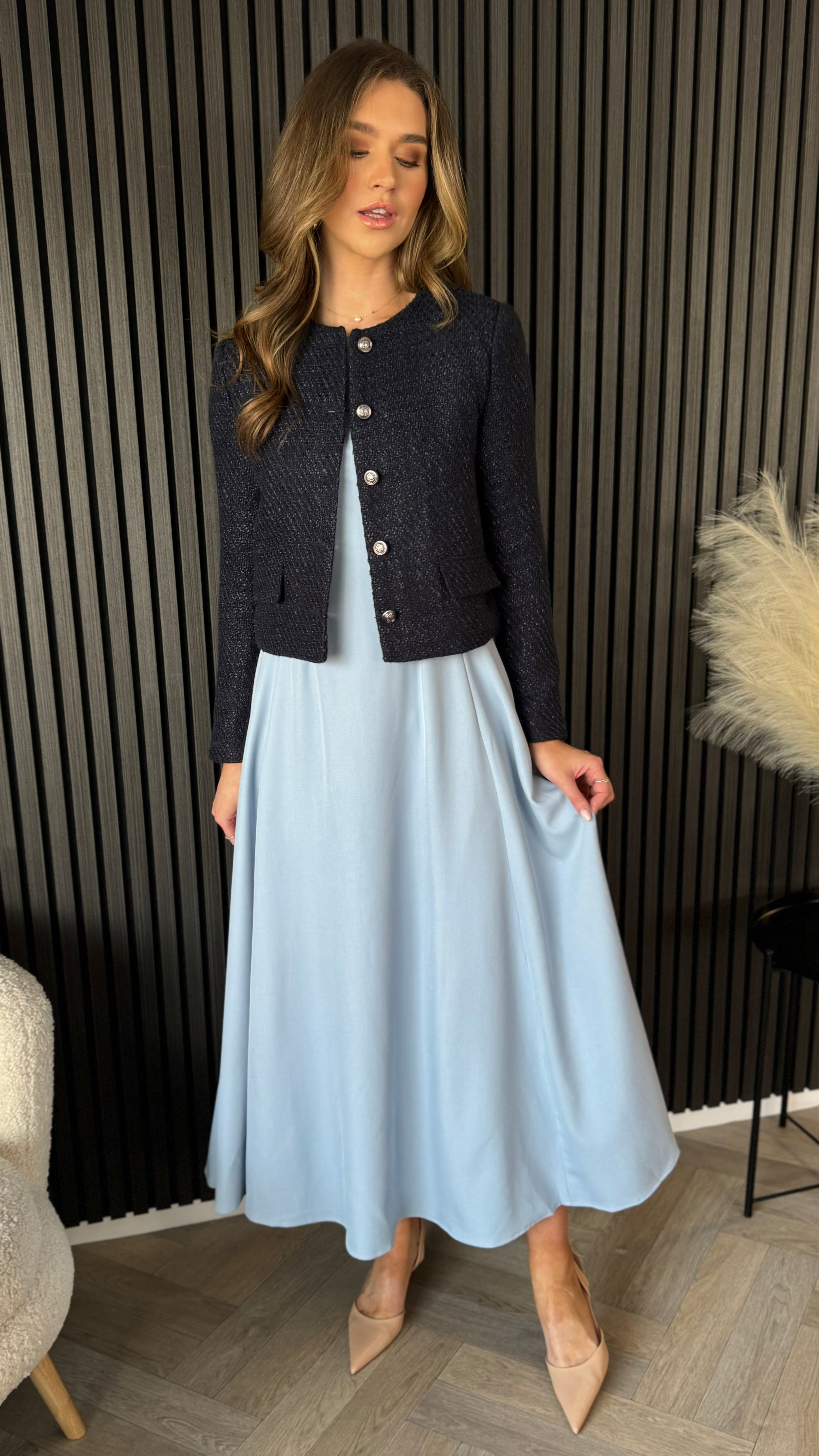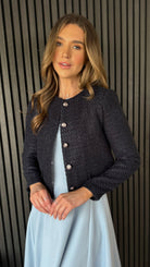 Looking for a jacket that's both stylish and functional? Look no further than our Talia Navy Tweed Effect Fitted Jacket! With its fitted design, button down closure, and faux pockets, this jacket will flatter your figure while keeping you warm. The round neckline adds a feminine touch to this must-have piece.