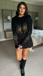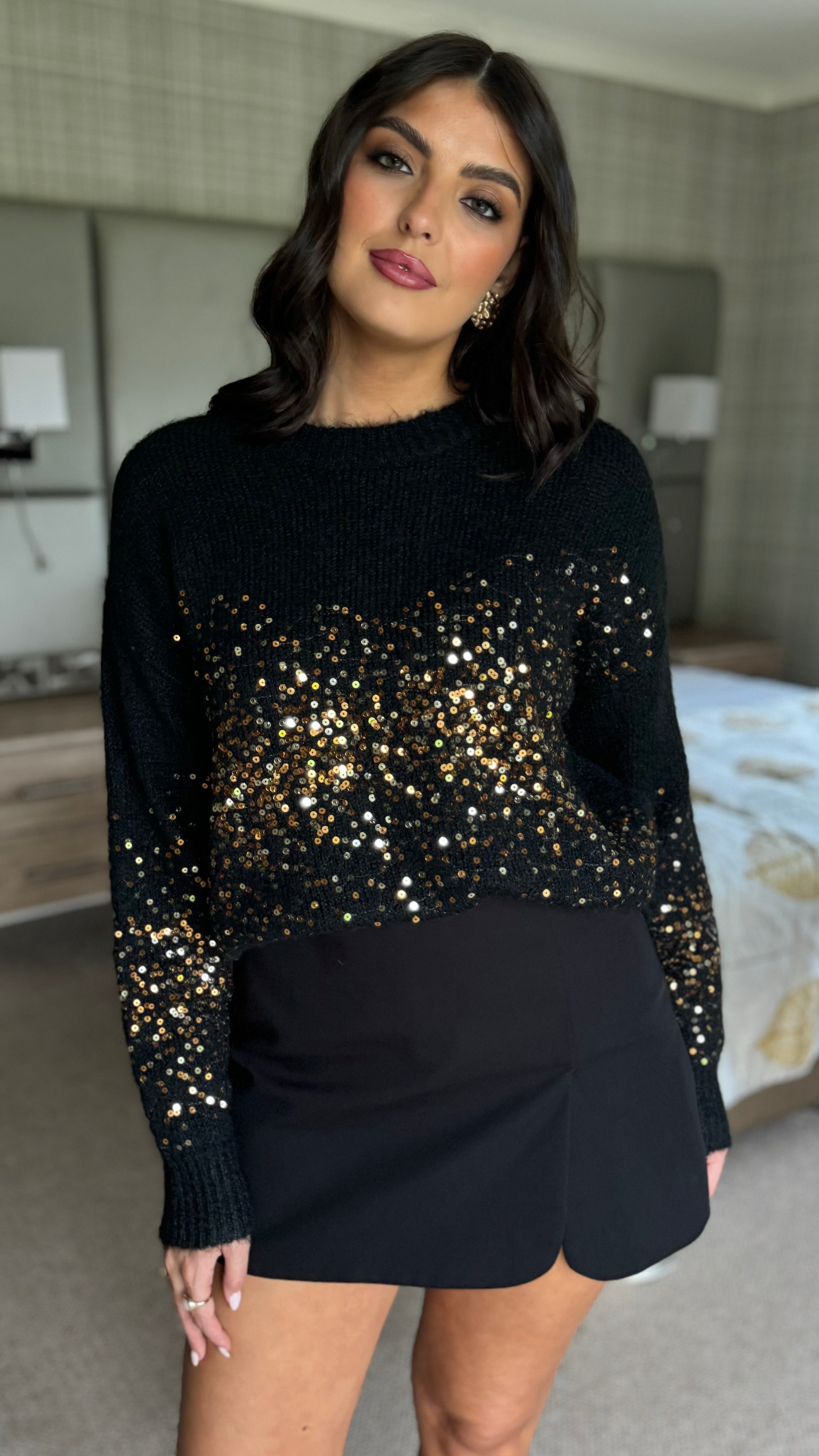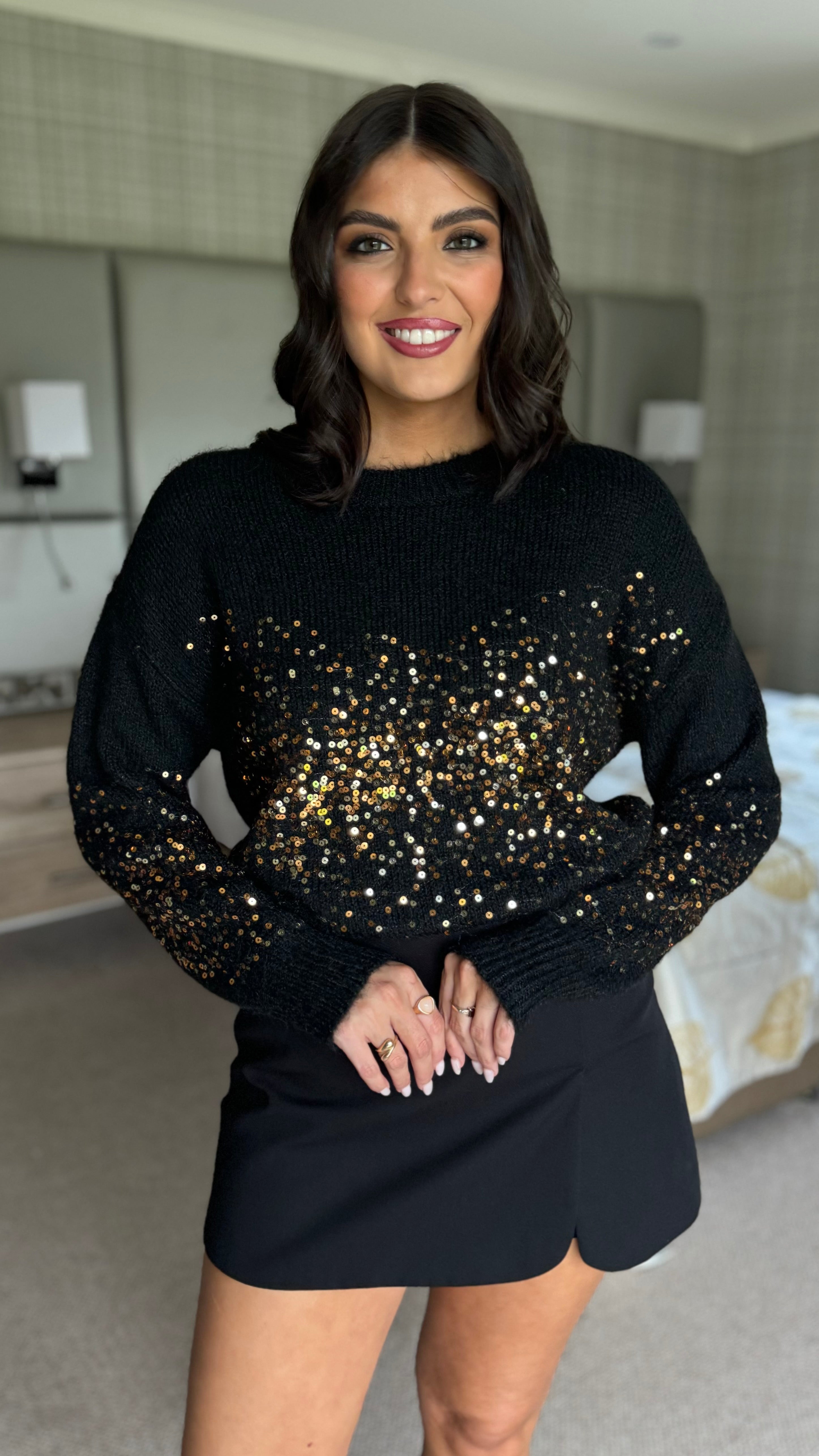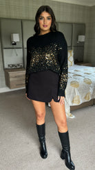 Get ready to sparkle with the Tasha Black & Gold Sequin Detail Jumper! Featuring a chic round neck and shimmering gold sequins, this jumper adds a dash of fun to any outfit. The ribbed cuffs and hem keep things snug, while the soft, cosy fabric makes it your new favourite for chilly days. Perfect for turning heads and staying comfy all at once!