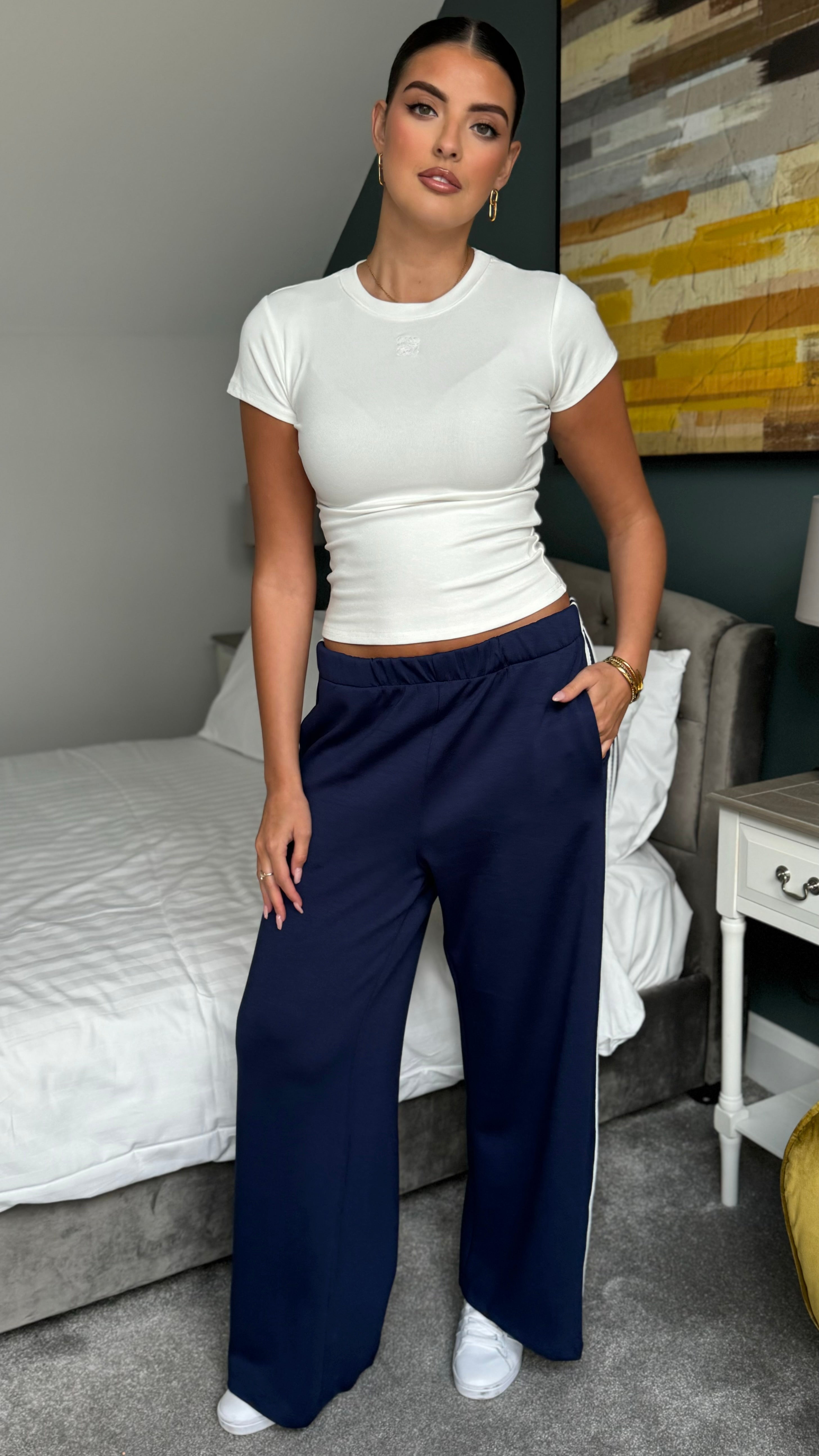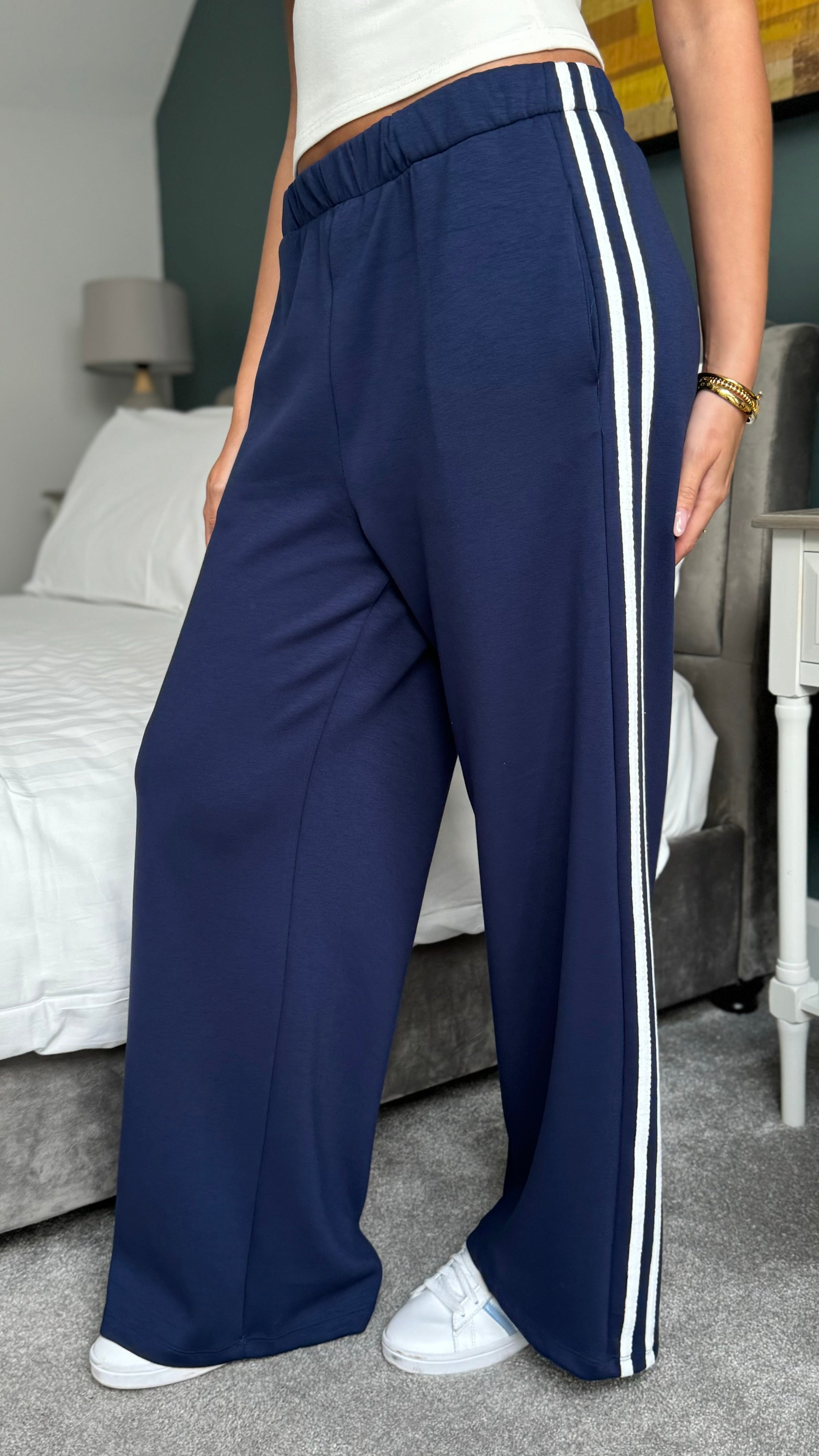 Tilly Navy Stripe Detail Joggers feature a comfortable drawstring waist and elasticated waistband for an adjustable, secure fit. The wide-leg silhouette offers relaxed movement and a contemporary cut, perfect for effortless everyday wear. Crafted with attention to detail, these joggers combine practicality with modern style for versatile layering and casual comfort.