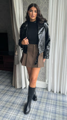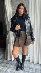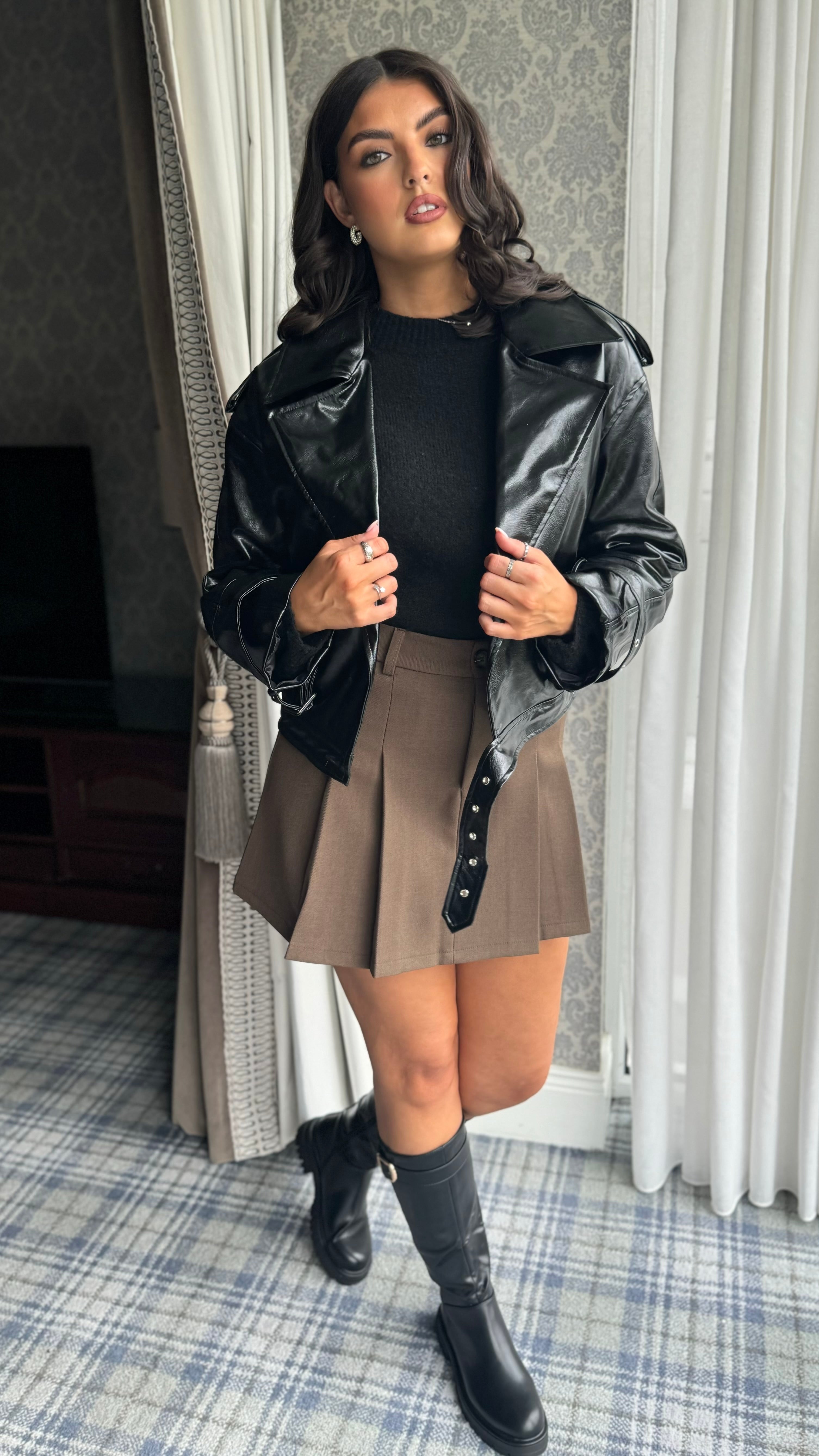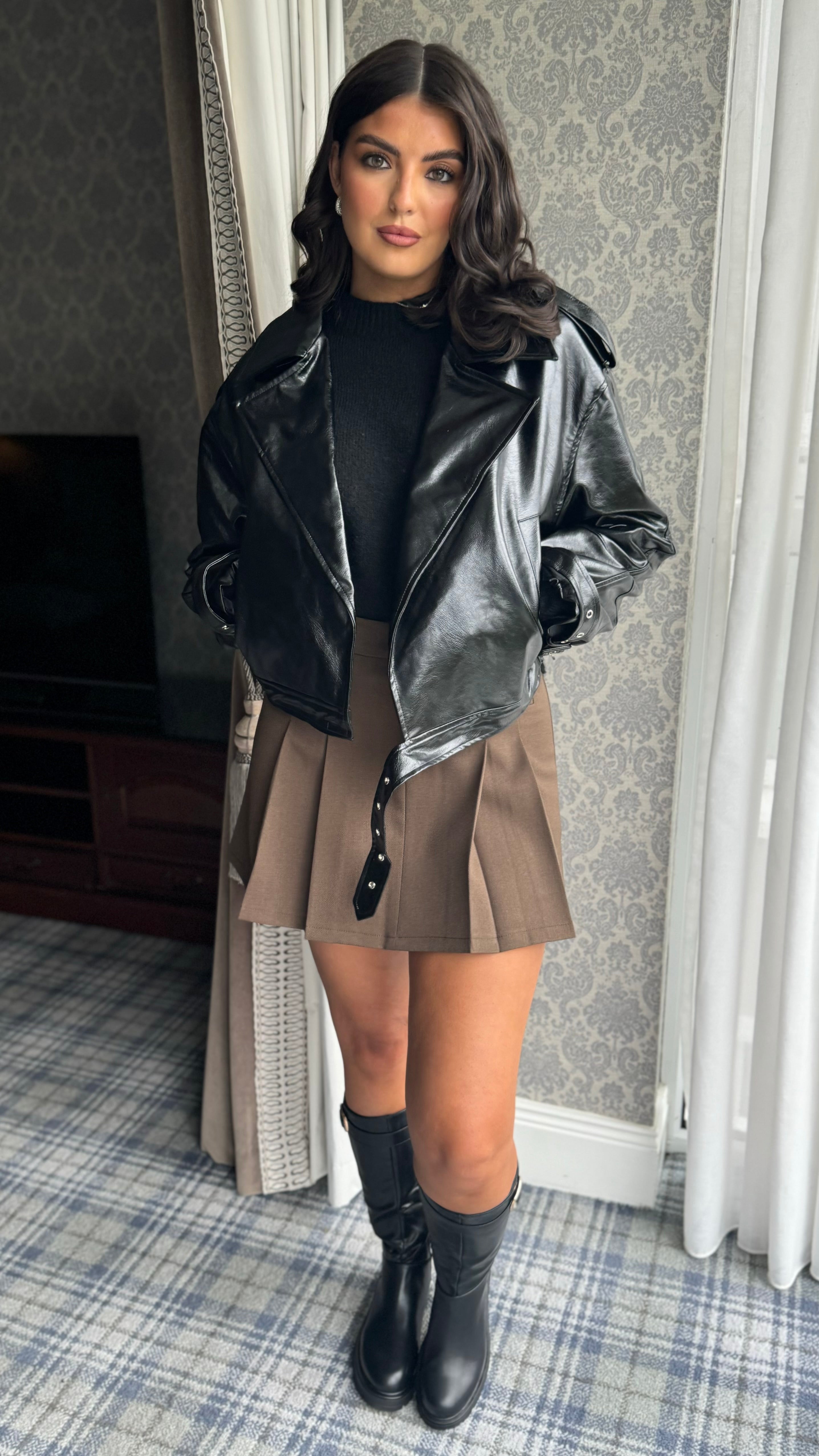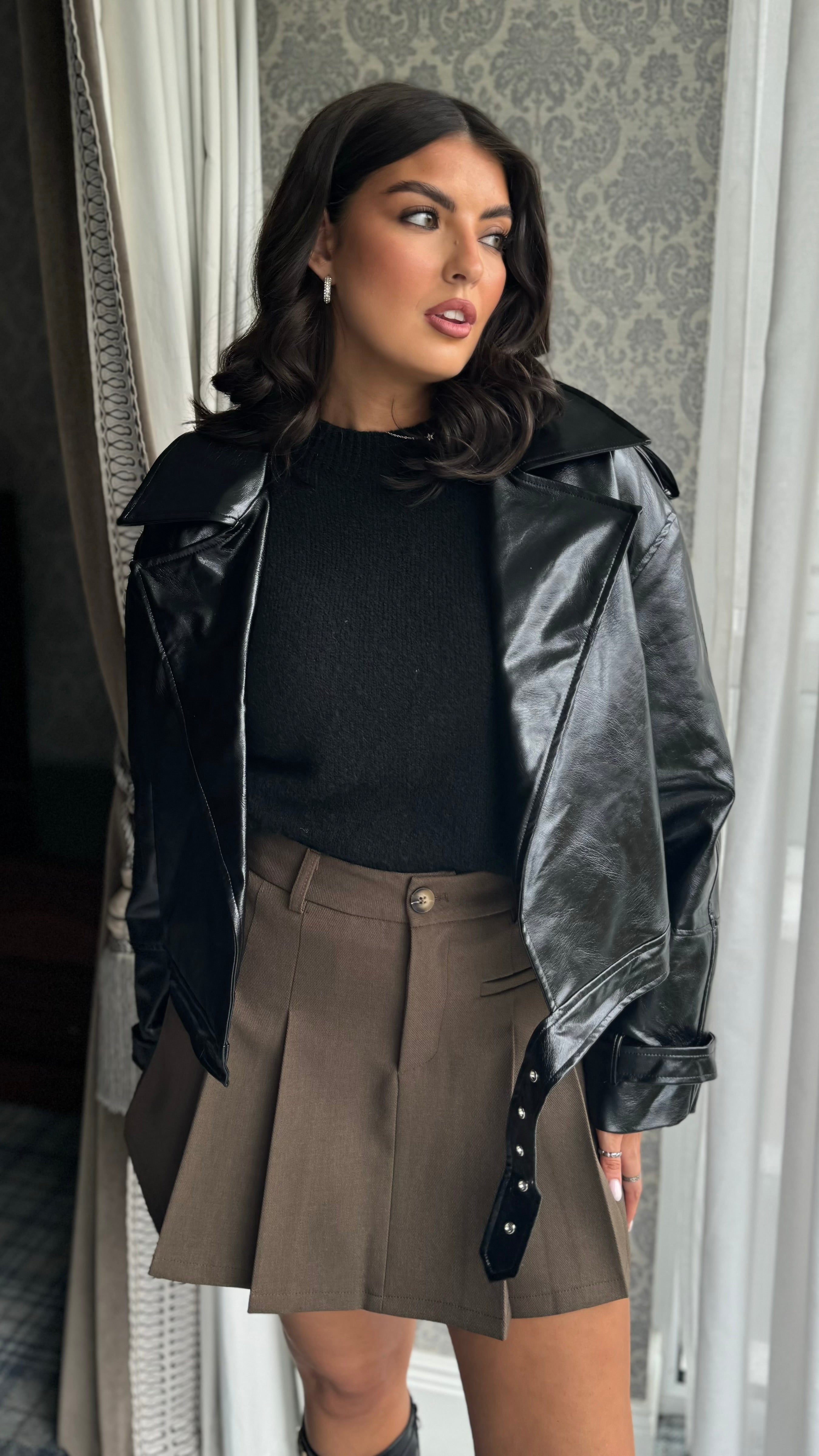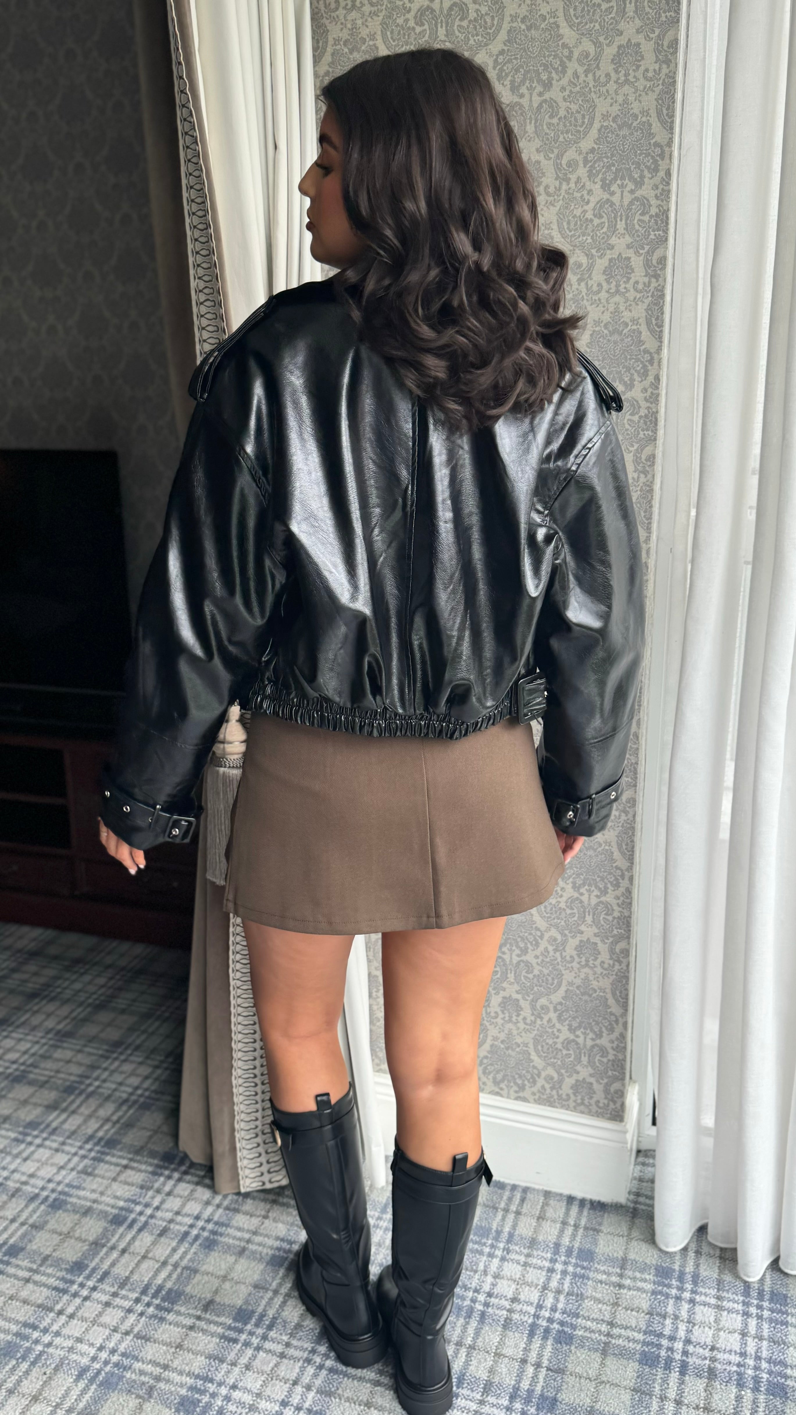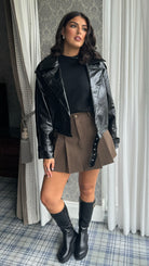 Make a bold statement with the Ursula Black Faux Leather Oversized Biker Jacket. Featuring shiny silver hardware and a cool collar detail, this jacket combines edgy style with a comfy oversized fit. Crafted from smooth faux leather, it’s perfect for adding a touch of rebellious flair to any outfit while keeping you cozy.