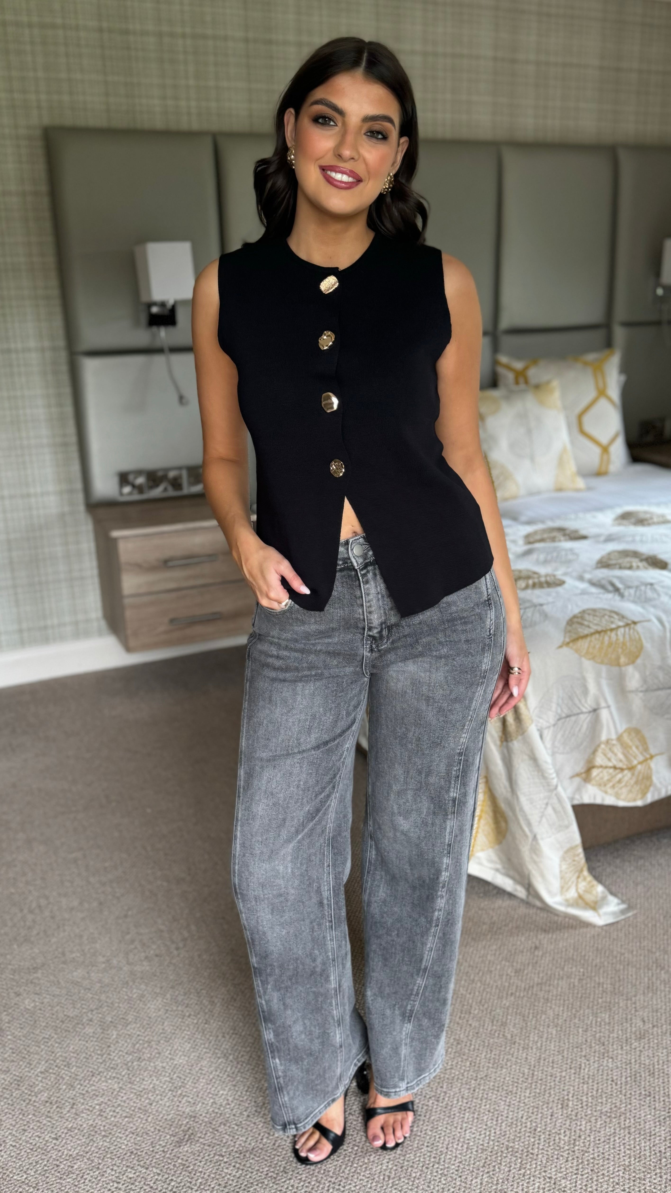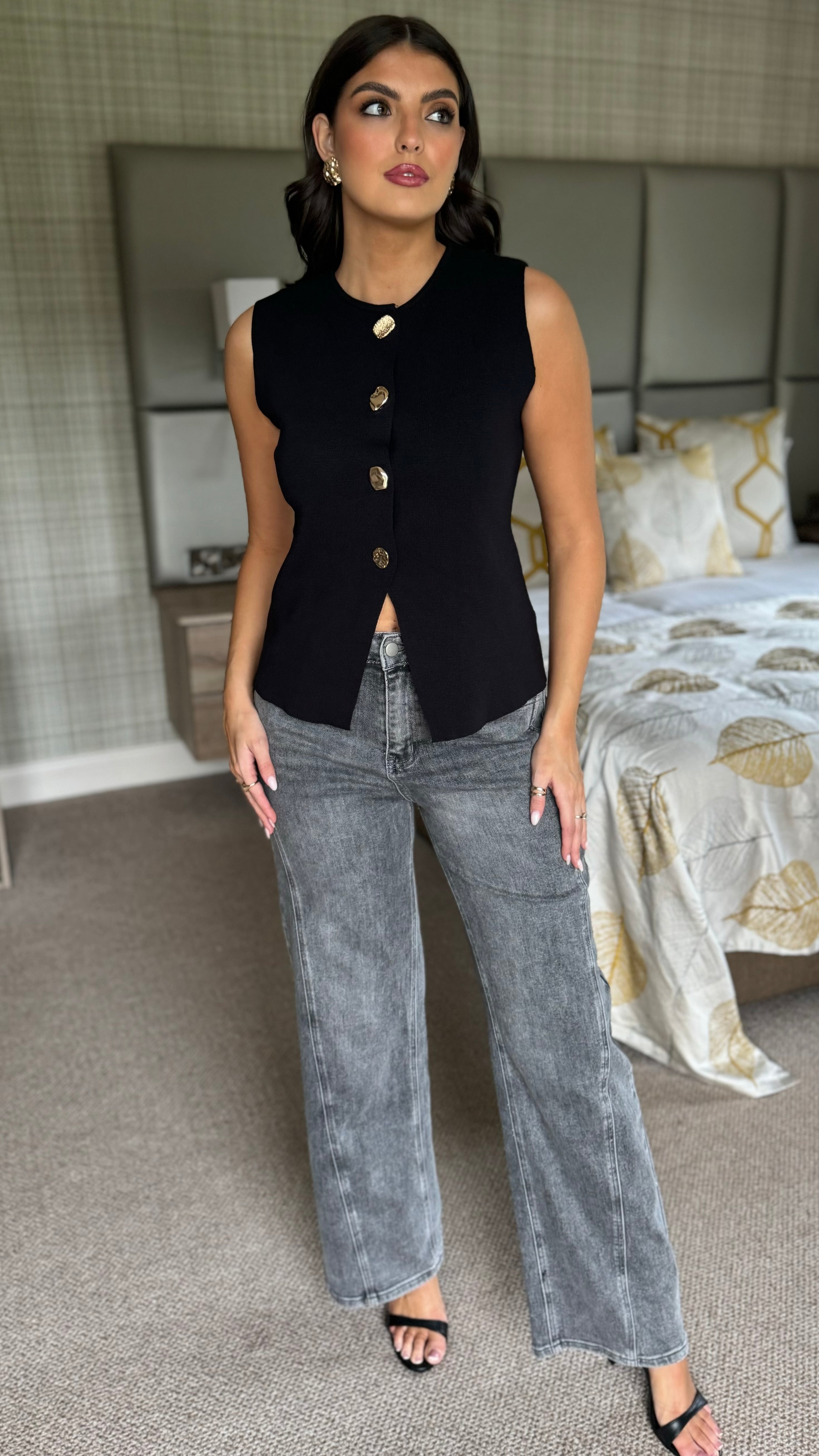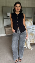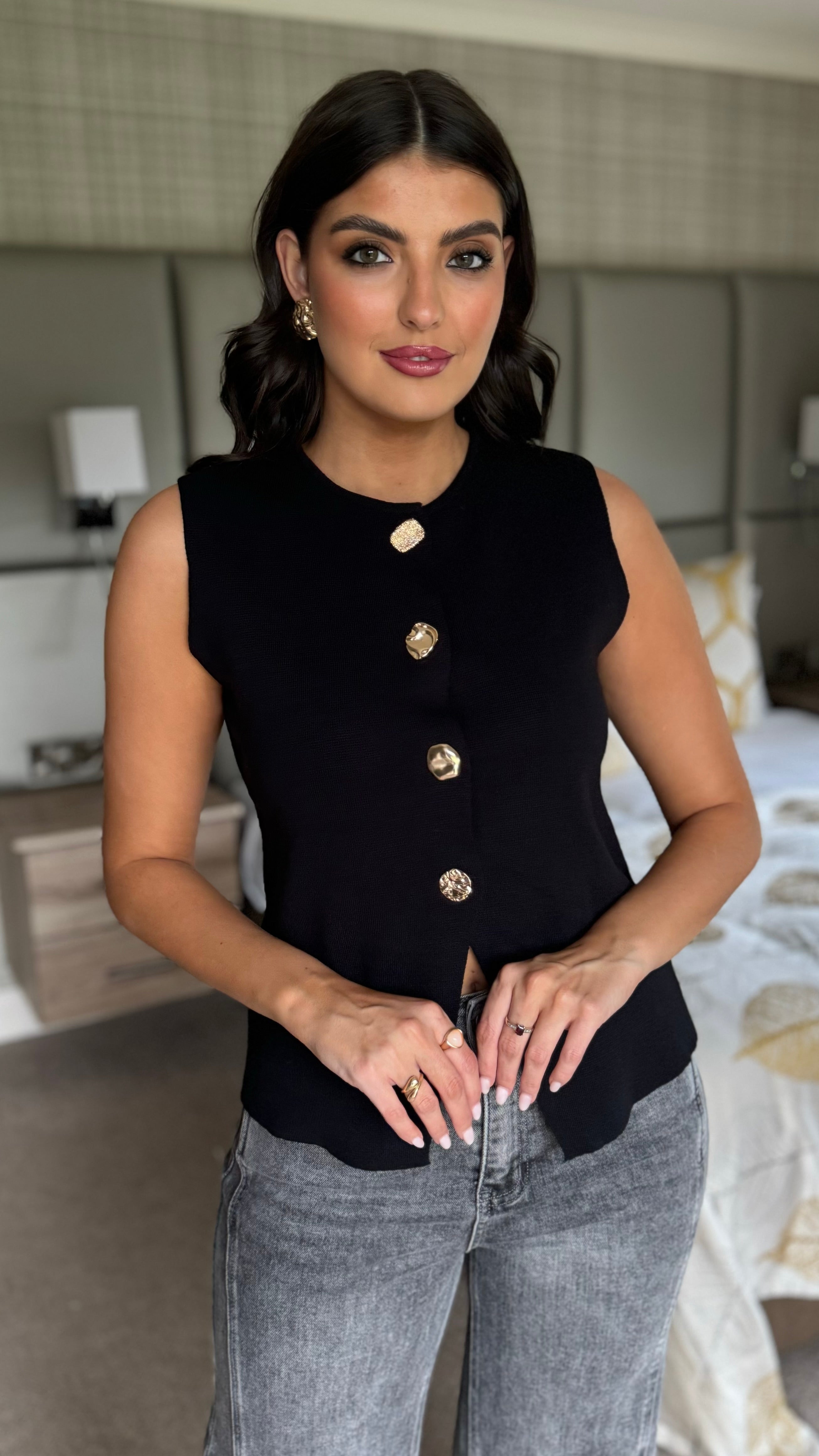 Add a dash of charm to your outfit with the Wednesday Black Knitted Waistcoat. Featuring eye-catching gold buttons and a cozy knitted texture, this waistcoat brings warmth and style together effortlessly. The playful split front adds a flirty twist, making it perfect for layering over your favourite tops or dresses with a fun, fashionable edge.