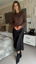 Make an impact in this stunning Yaella Black Midi Skirt. Crafted with a sleek, black fabric, this midi skirt adds a sophisticated edge to any look. Show off your style and confidence with this eye-catching piece! 💃🏻