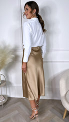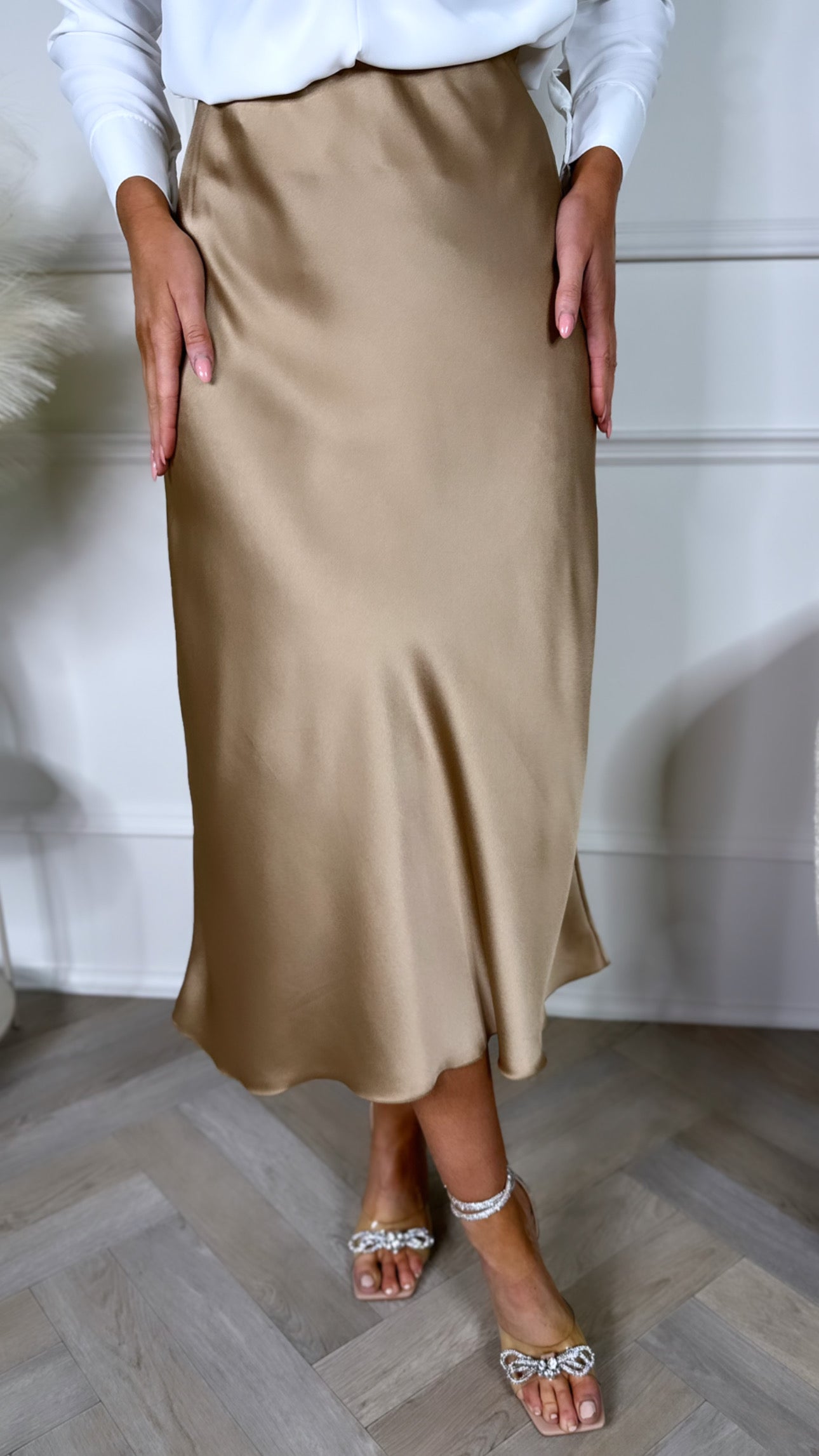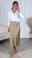Make an impact in this stunning Yaella Camel Midi Skirt. Crafted with a sleek, beige fabric, this midi skirt adds a sophisticated edge to any look. Show off your style and confidence with this eye-catching piece! 💃🏻