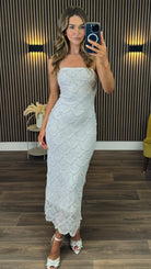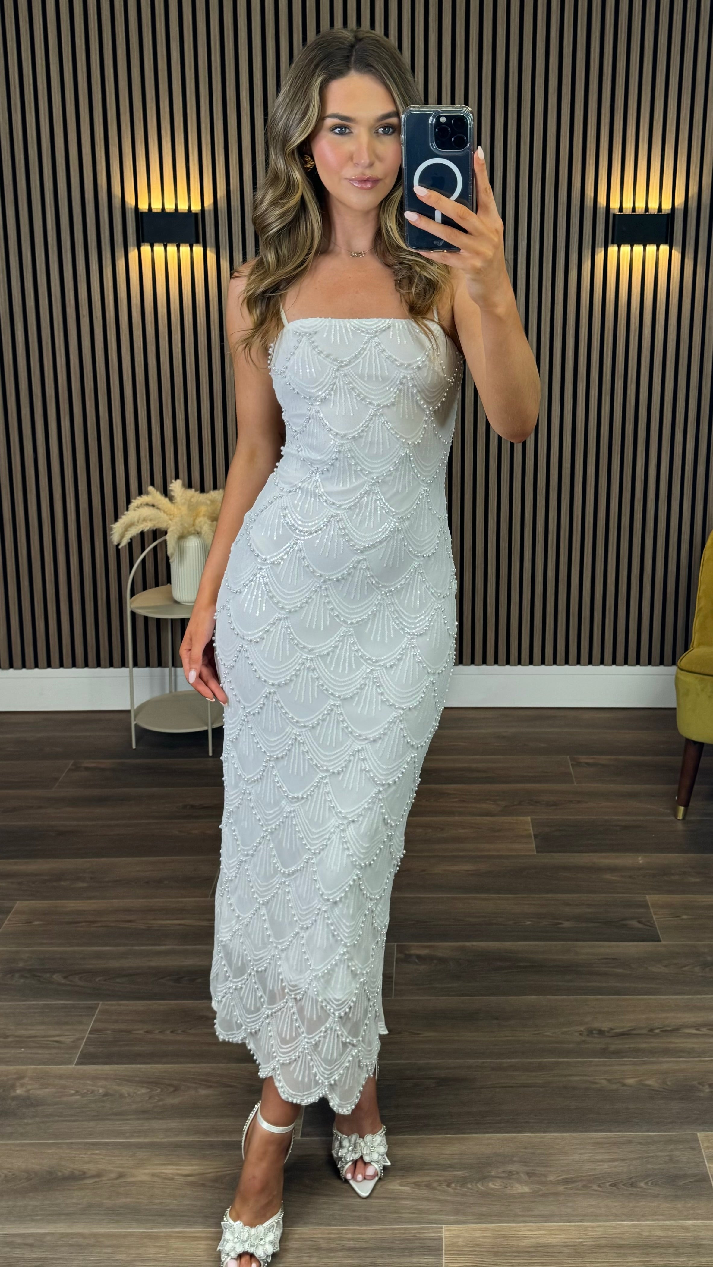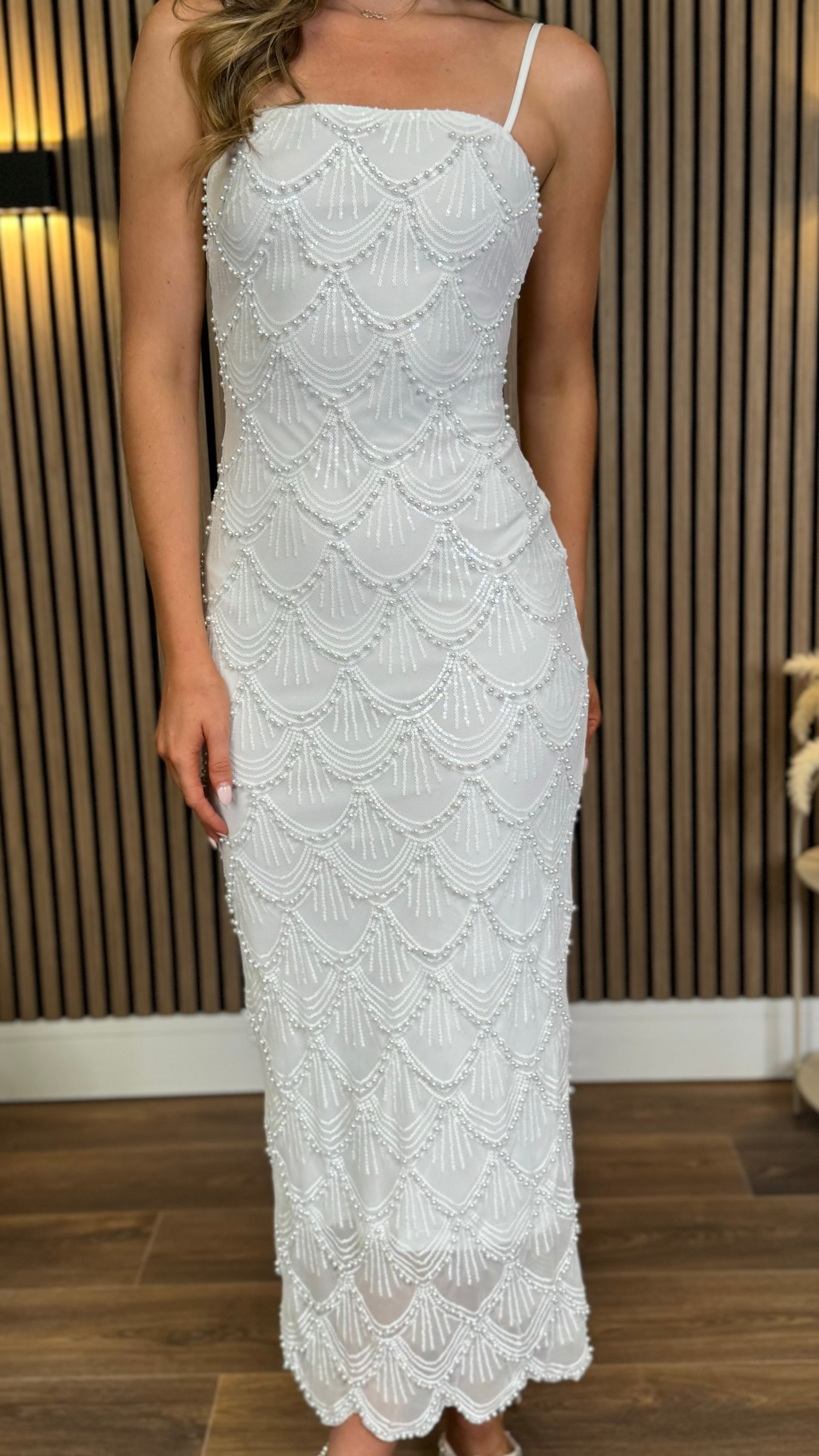Shine bright at your hen party with the Eileen White Sequin Detail Cami Strap Midaxi Dress. Featuring adjustable cami straps for the perfect fit and sparkling sequin accents, this fully lined dress combines comfort with festive flair.