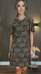 Step out in style with the Isabelle Beige & Black Leopard Print Mini Dress! 🐆 Featuring flirty flutter sleeves and a comfy round neckline, this dress adds a splash of fun to your look. The elasticated waist ensures a perfect fit that moves with you all day long. Perfect for turning heads and feeling fierce! ✨🖤