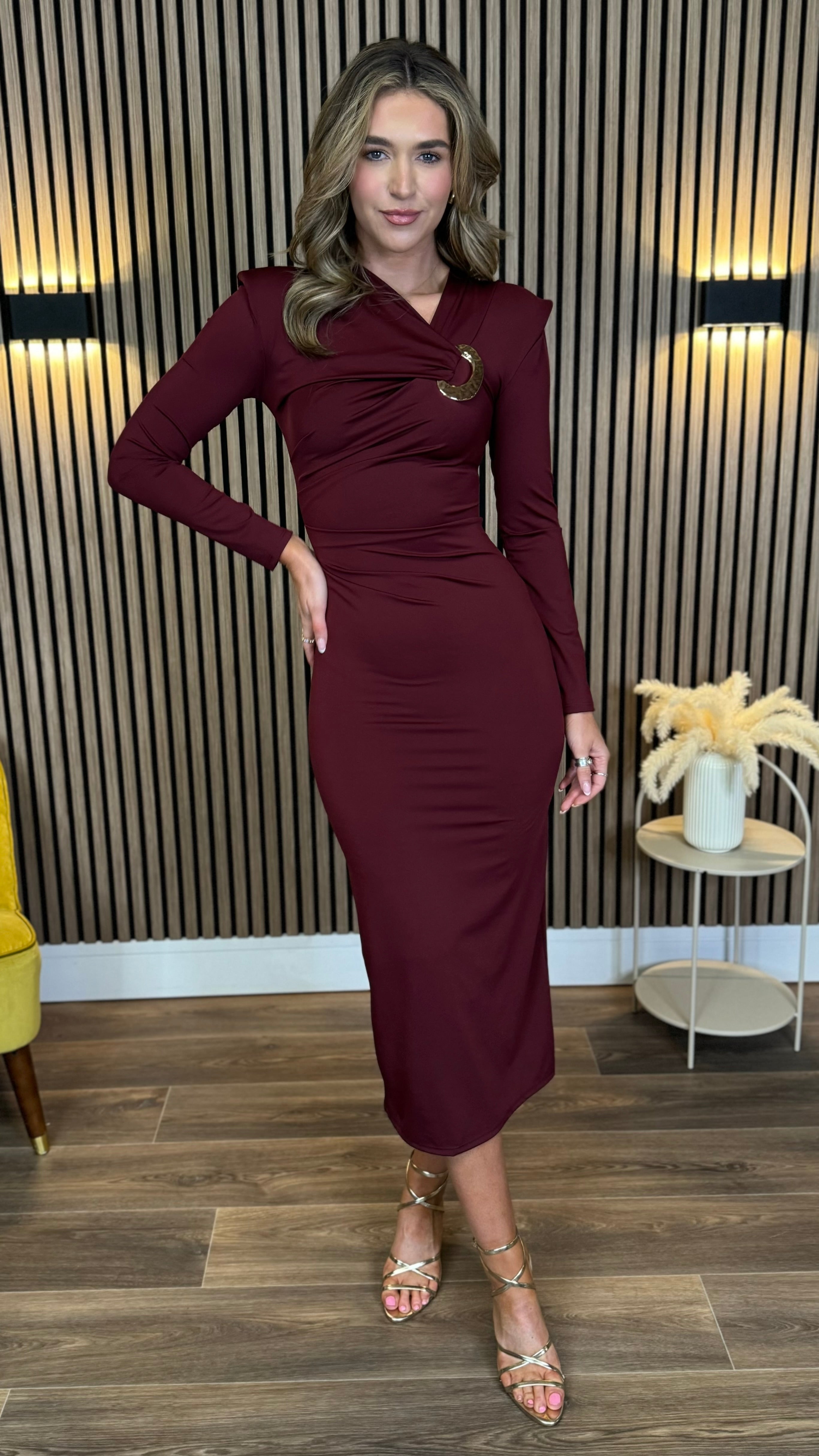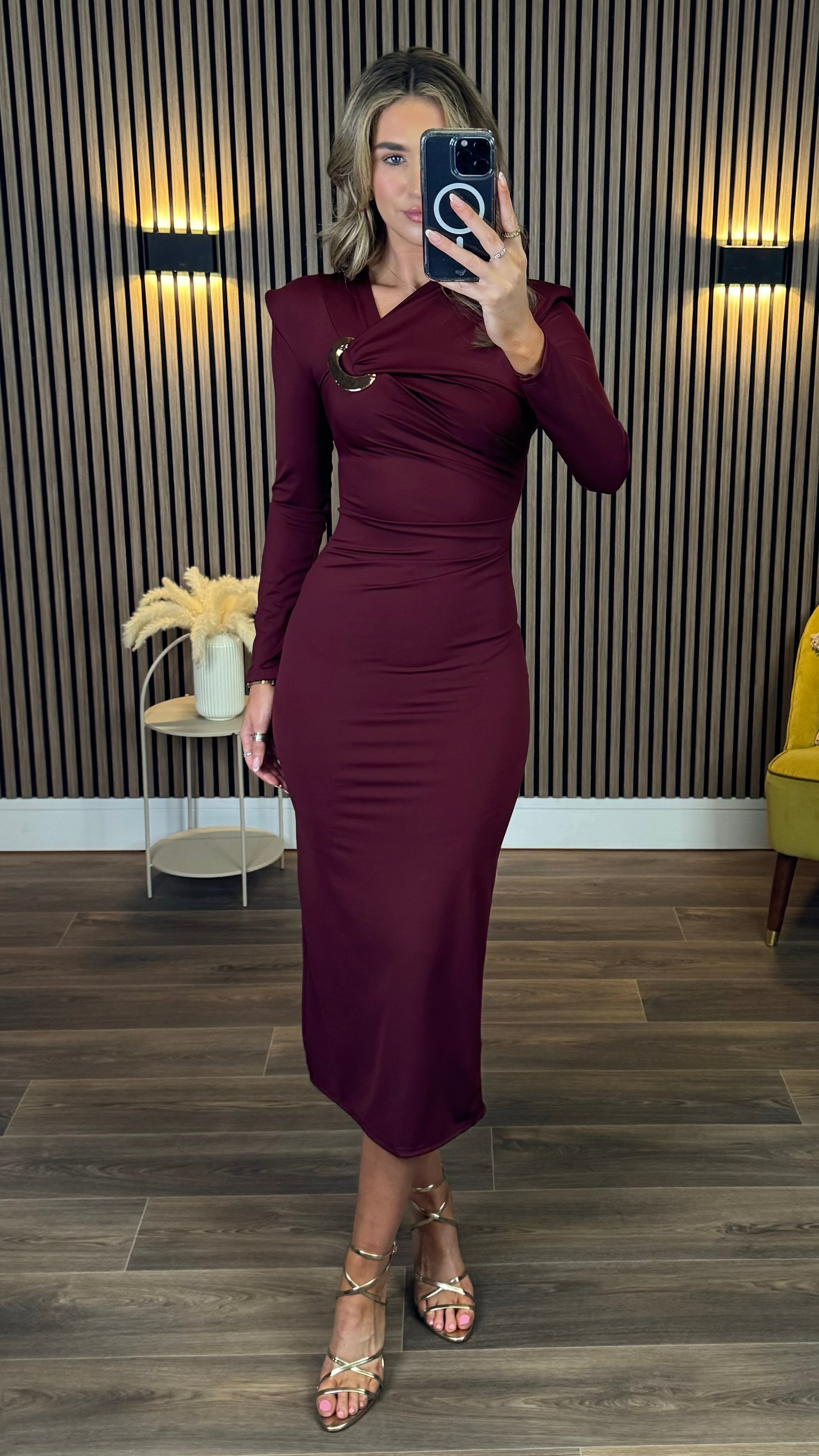 Mary Burgundy & Gold Detail Ruched Midi Dress