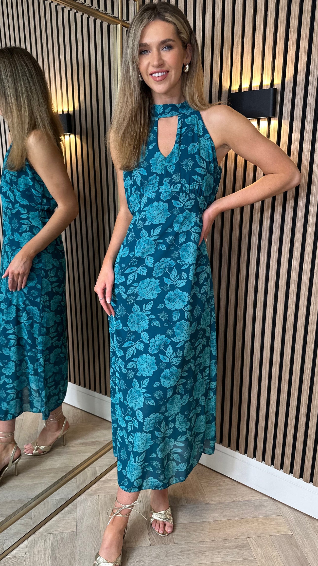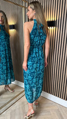 Rosalie Teal Printed Halterneck Tie Detail Midi Dress