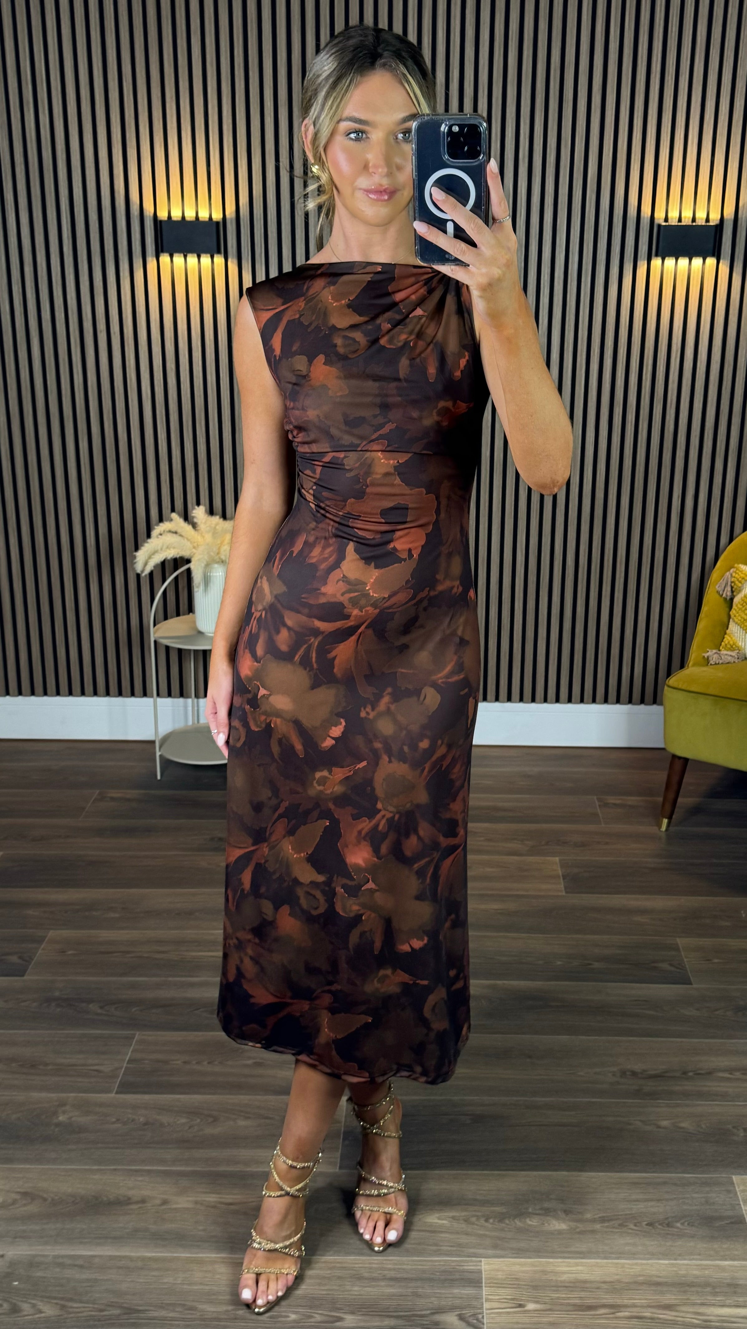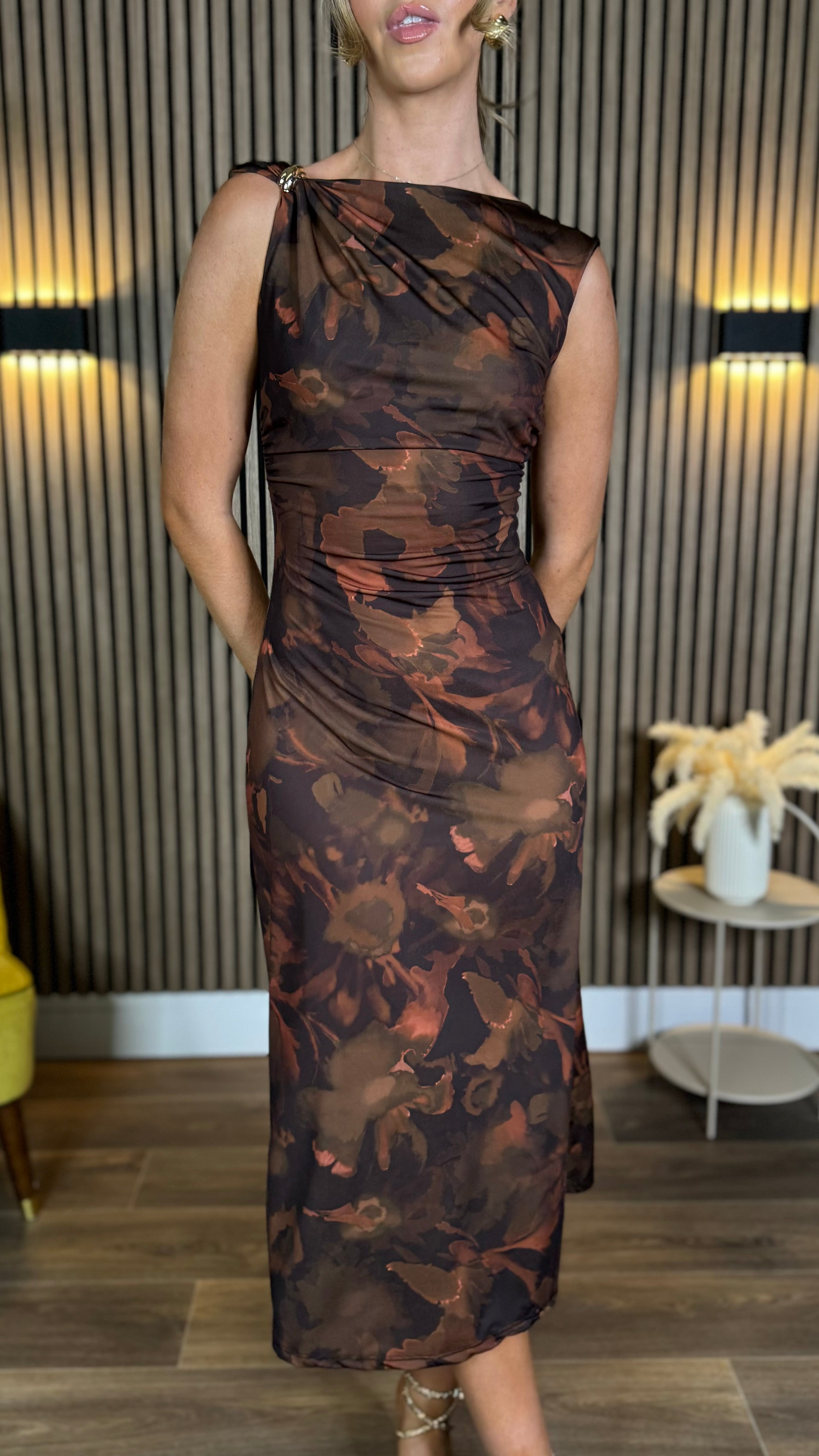 Elevate your wardrobe with the Vanessa Brown Floral Asymmetric Neckline Midi Dress. Featuring a striking asymmetric neckline and elegant gold detailing, this dress draws attention with its twisted shoulder design. The ruched details enhance the silhouette for a figure-flattering fit, while the midi length offers a perfect balance of sophistication and style.