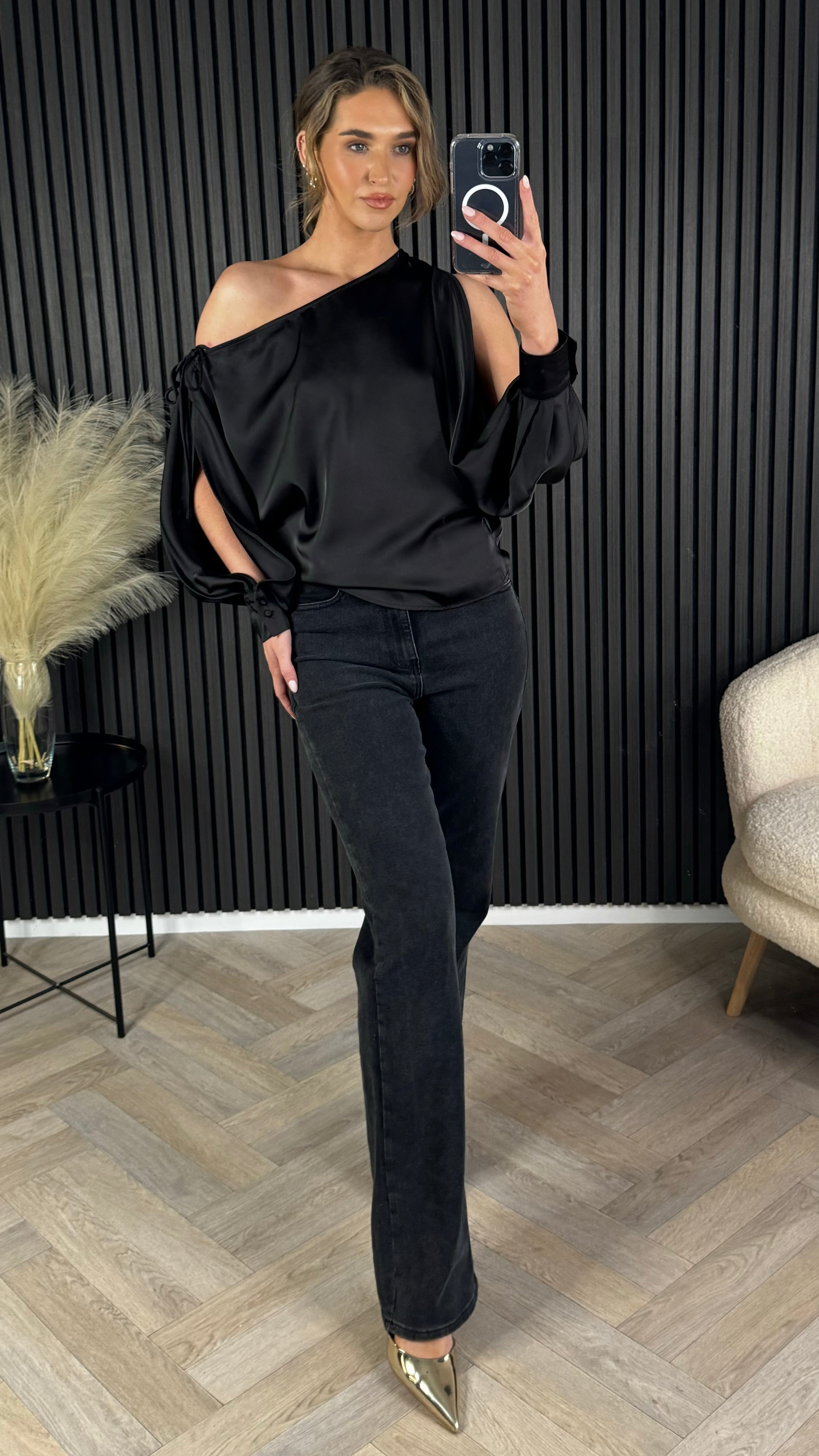 Turn heads in the Billie Black Asymmetric Long Sleeve Top! Showcasing open sleeves and the perfect balance of one shoulder and one tie detail shoulder, this top adds an edgy twist to any ensemble. Complete with cuffed sleeves, it's the ultimate blend of style and practicality.