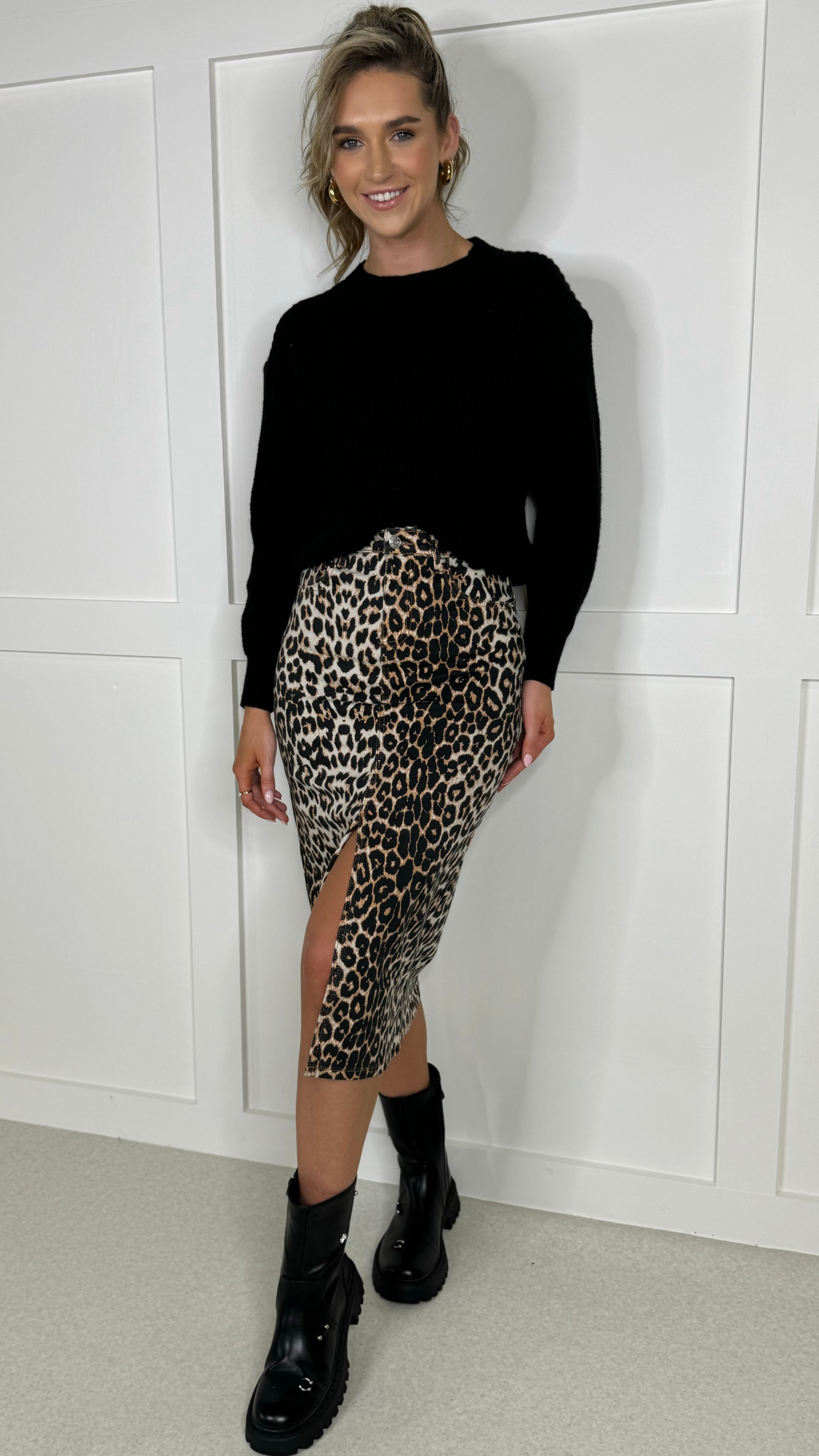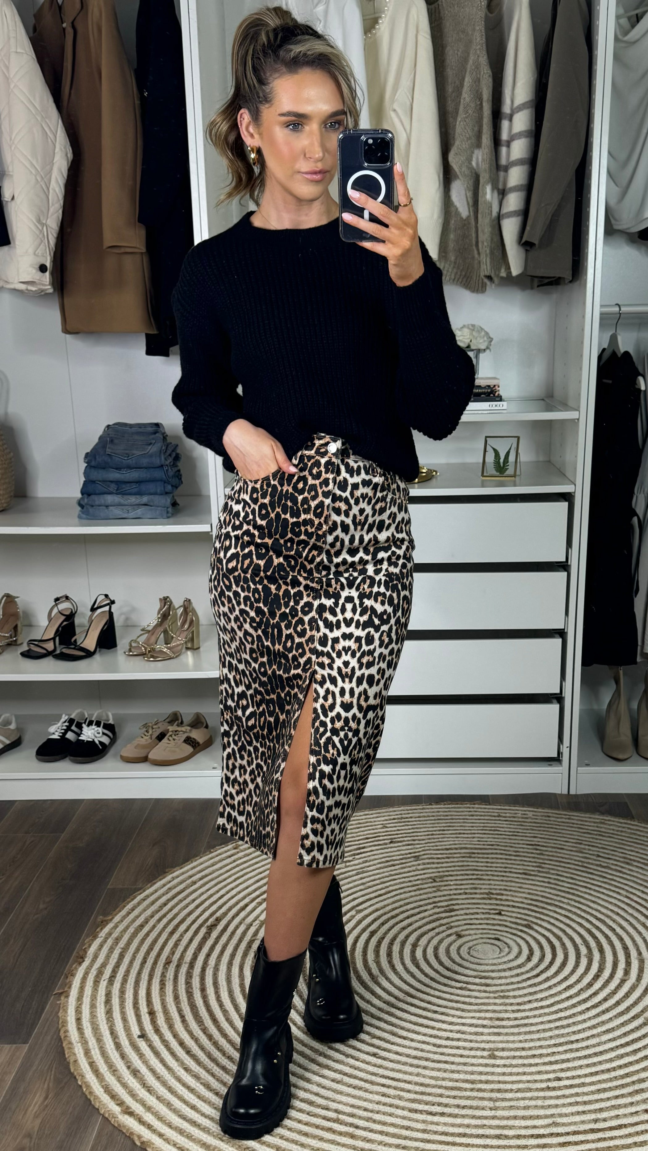 Kirbie Beige & Black Leopard Print Denim Midi Skirt