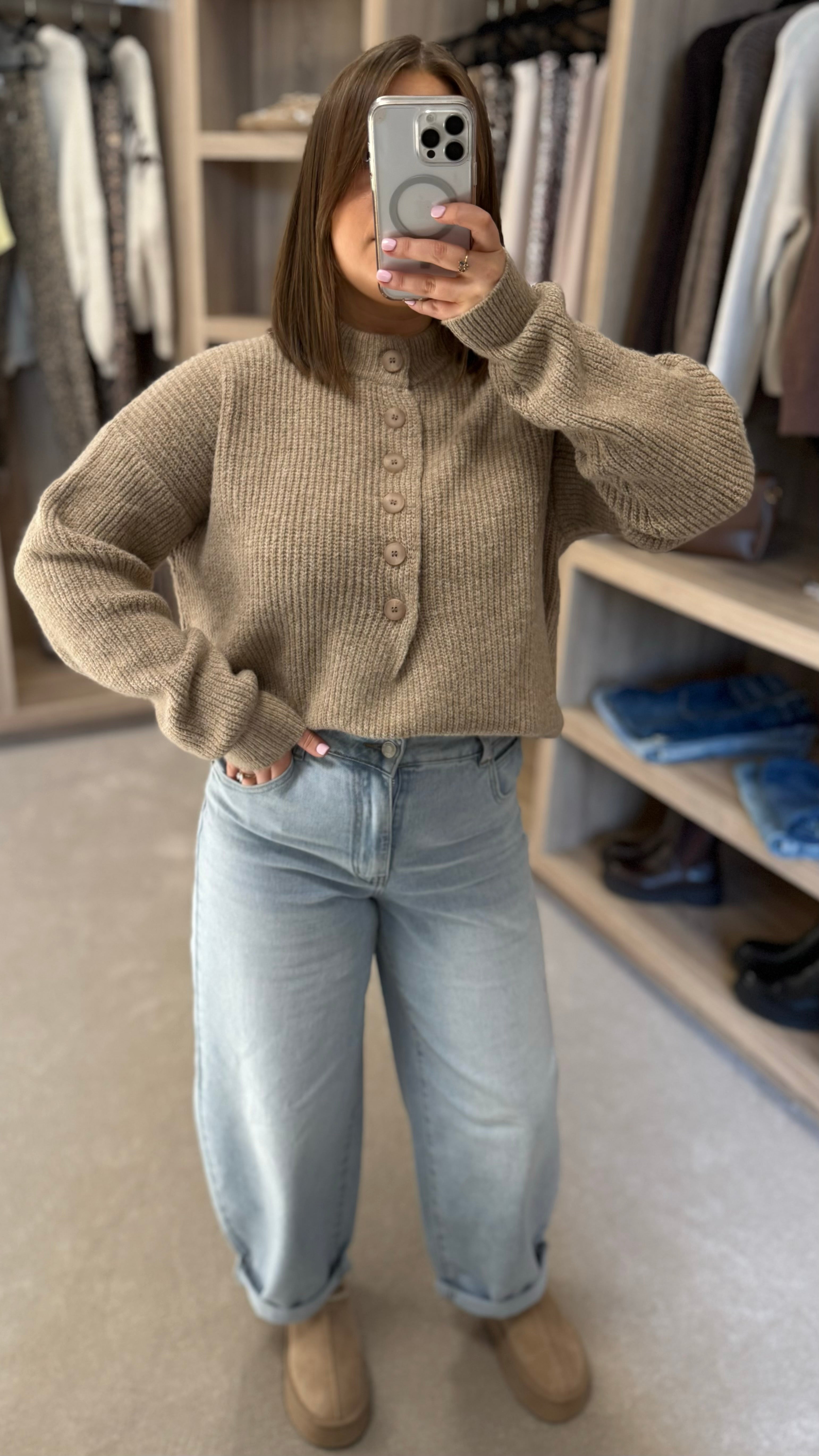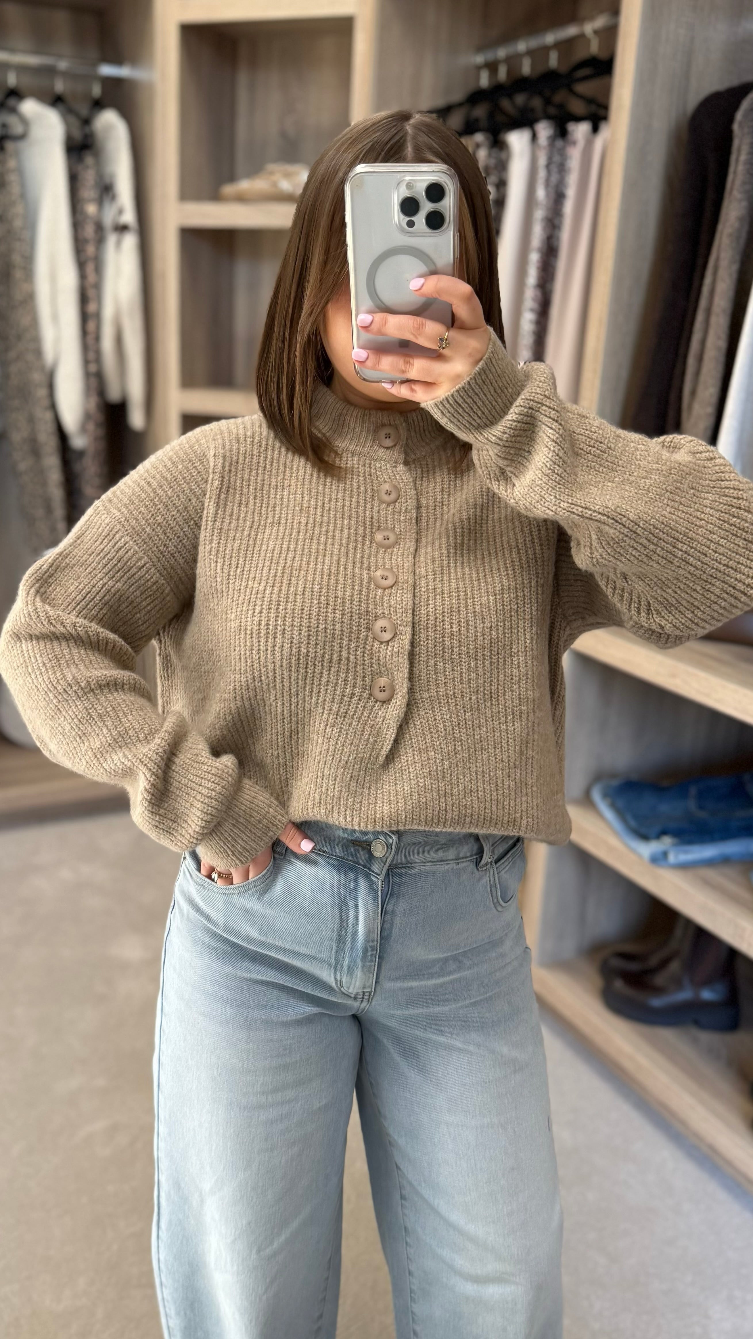 Emerson Taupe Button Detail Ribbed Jumper