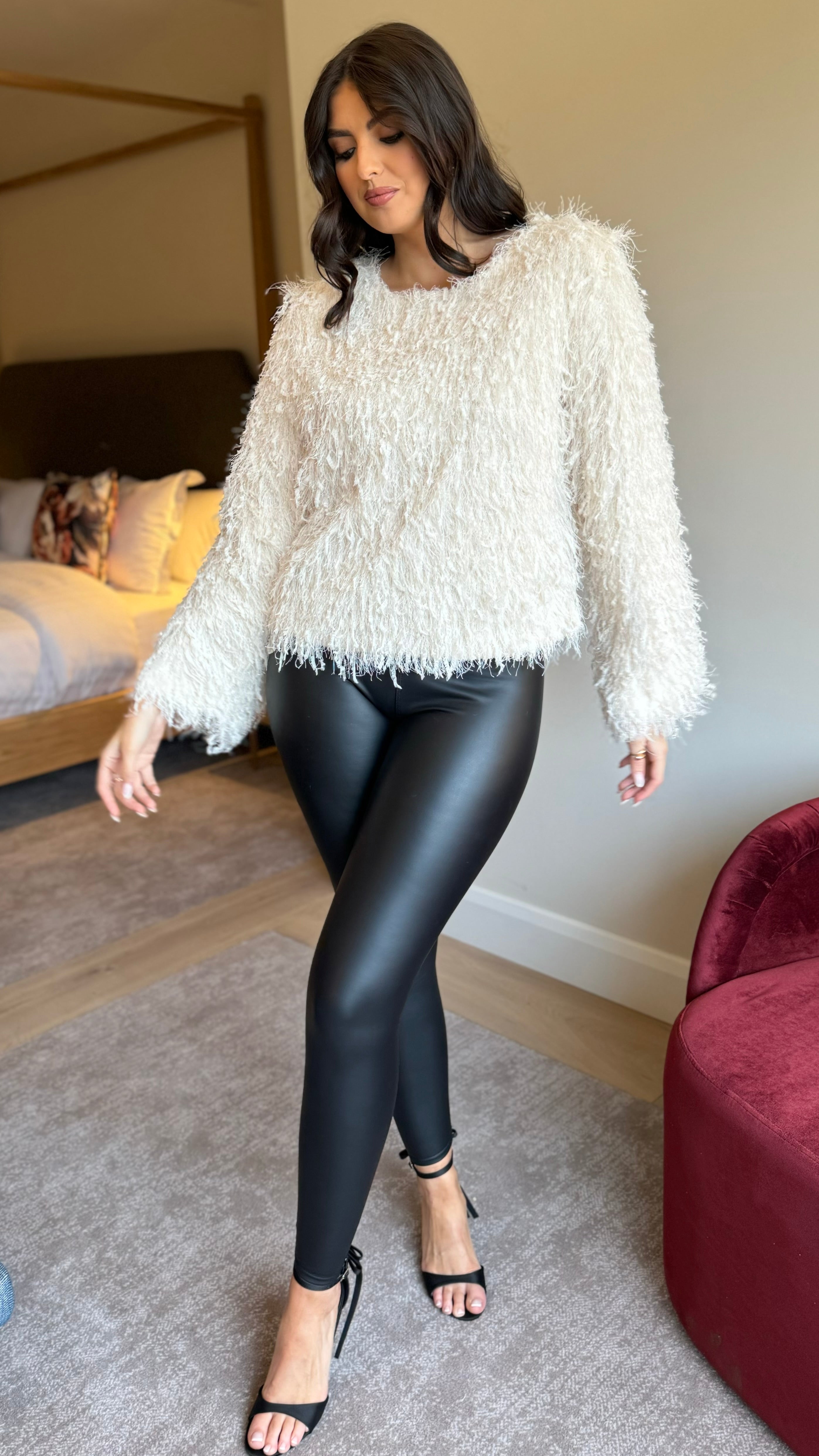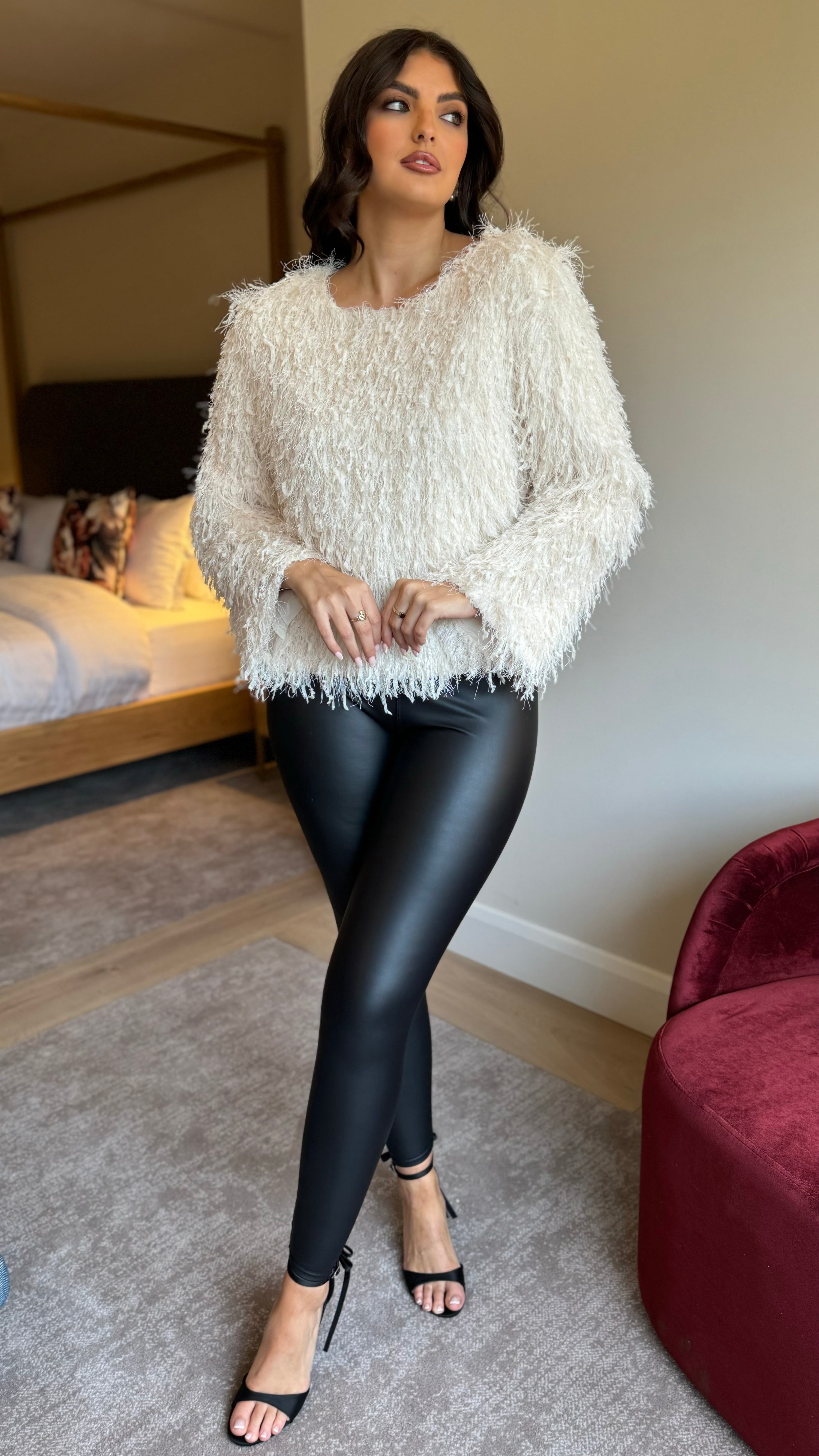 Elevate your everyday style with this fabulous fawn cream glitter textured top that catches the light beautifully. Designed with a relaxed, loose fit that flatters every figure, it features a charming round neckline and long sleeves for effortless sophistication. The practical button closure at the back adds a cheeky twist, while the soft lining ensures comfort all day long. Perfect for dressing up casual looks or adding sparkle to your weekend wardrobe—this top is your new go-to piece for making a subtle statement.