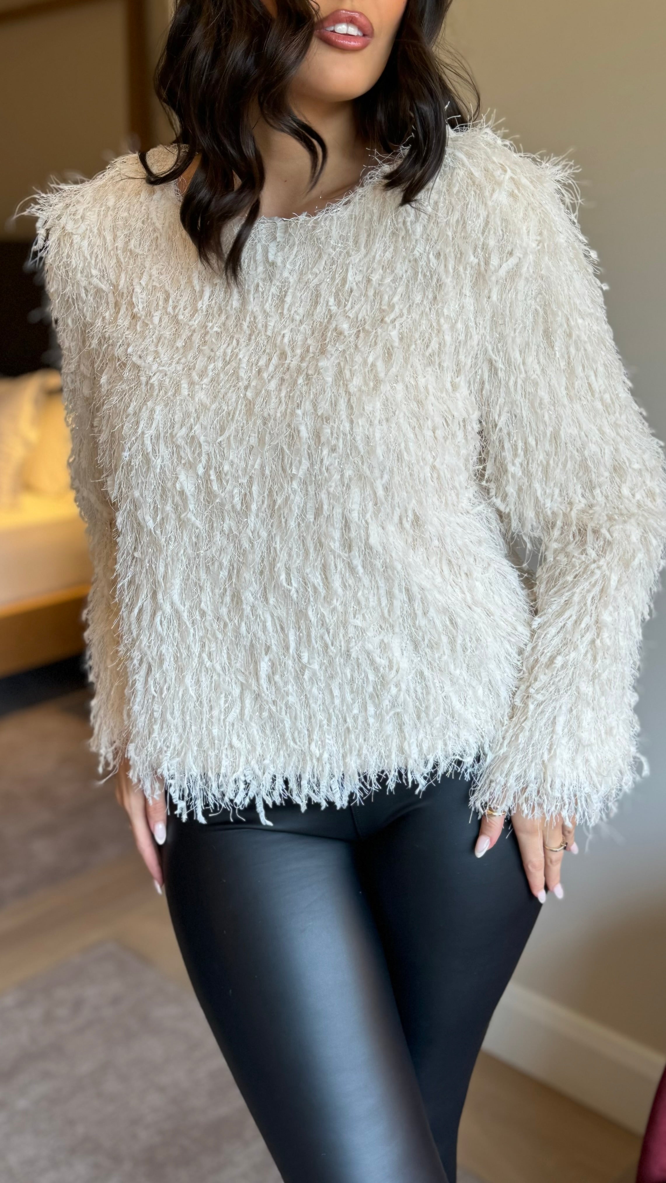 Fawn Cream Glitter Textured Round Neck Top