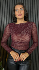 Elevate your style with the Fletcher Top—a playful piece that refuses to play by the rules. Rock it off-the-shoulder for an effortlessly chic vibe or wear it on-shoulder for a more polished look. The asymmetric hem adds an unexpected twist, while strategic ruching details create flattering dimension. Crafted from delicate mesh with long sleeves, this burgundy and leopard print beauty strikes the perfect balance between bold and wearable. One top, endless styling possibilities.