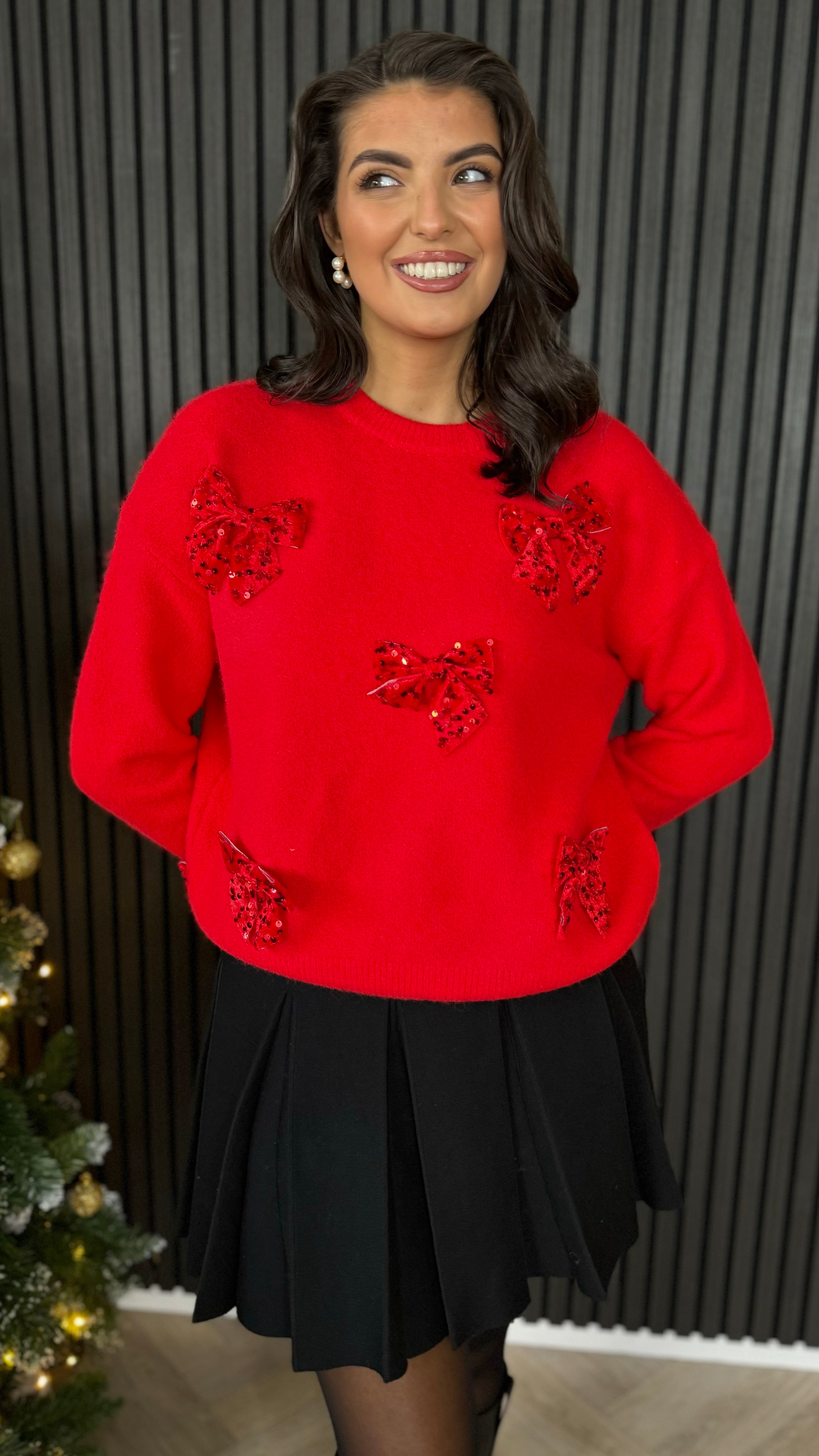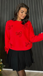 Flossie Red & Sequin Bow Detail Jumper Get ready to turn heads with this playful red jumper featuring the cutest 3D sequin bows attached for that extra sparkle! The soft, cosy round neckline wraps you in comfort, making it perfect for cosy nights in or standing out at your next gathering. Those dimensional sequin bows add a cheeky touch of fun that'll have everyone asking where you got it. Snuggle up in style and let your personality shine through!