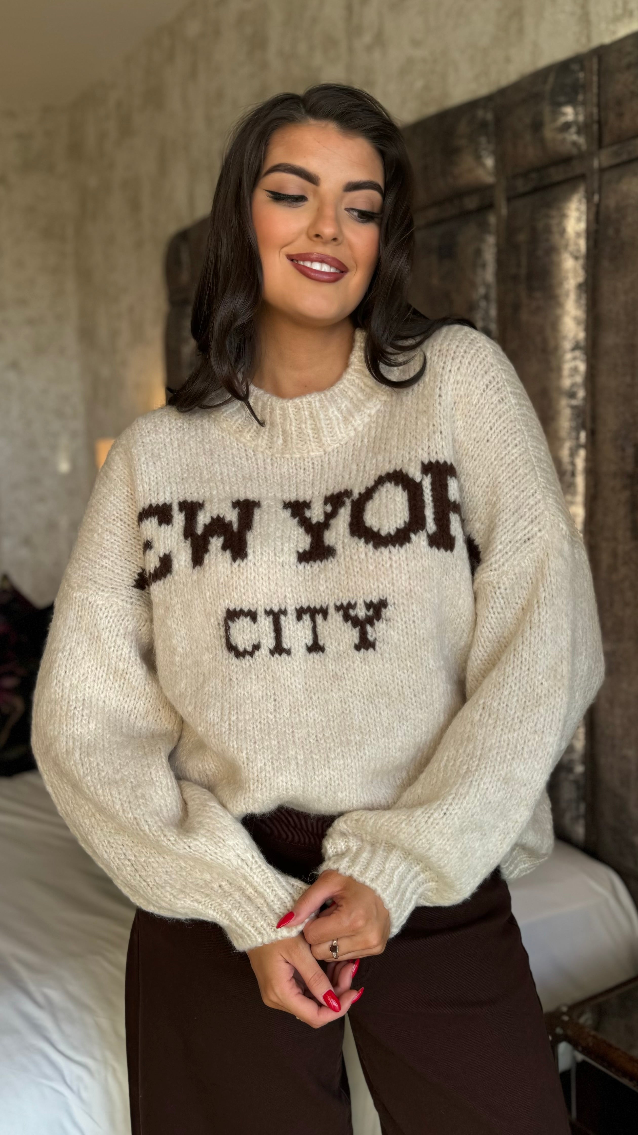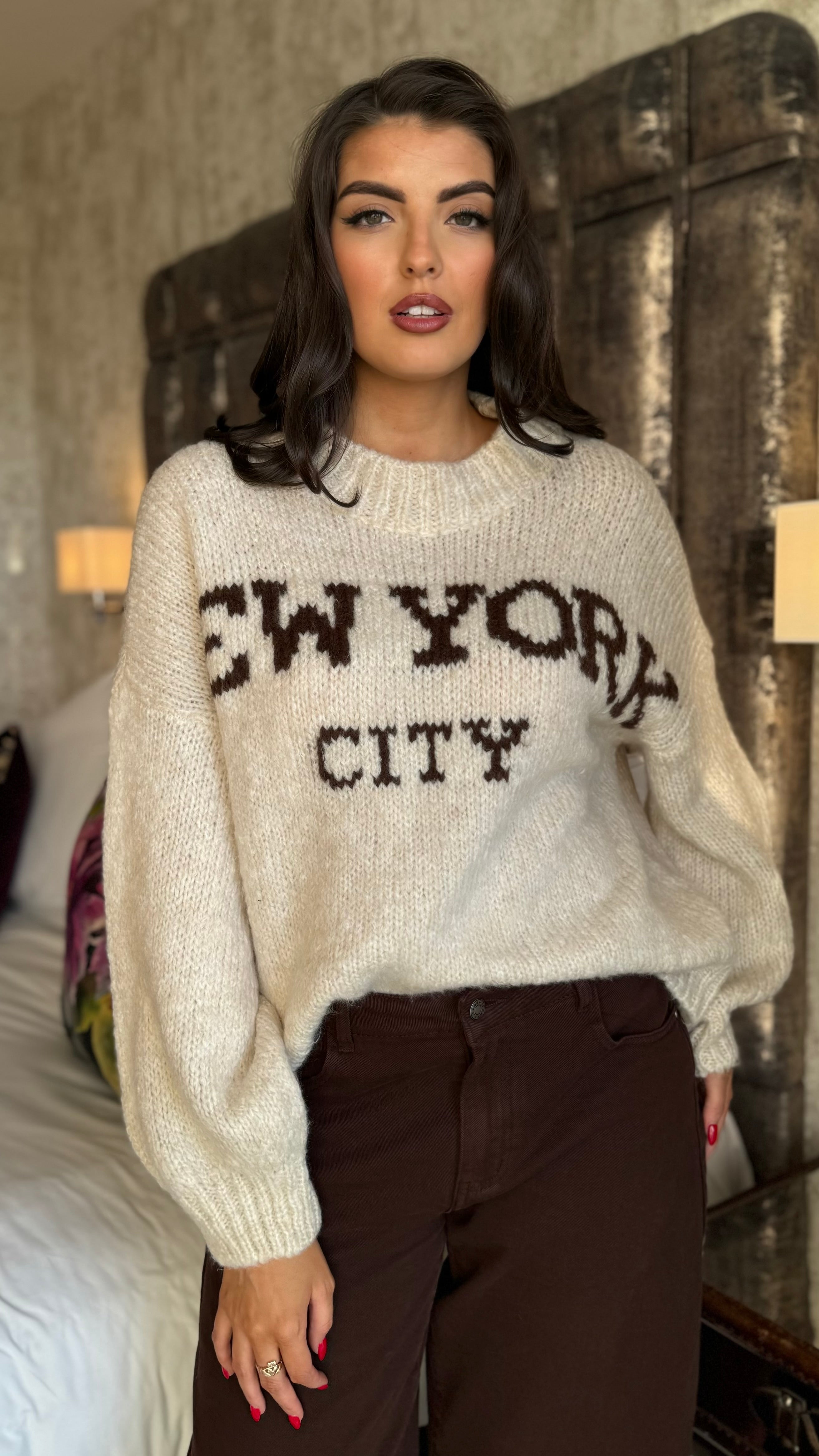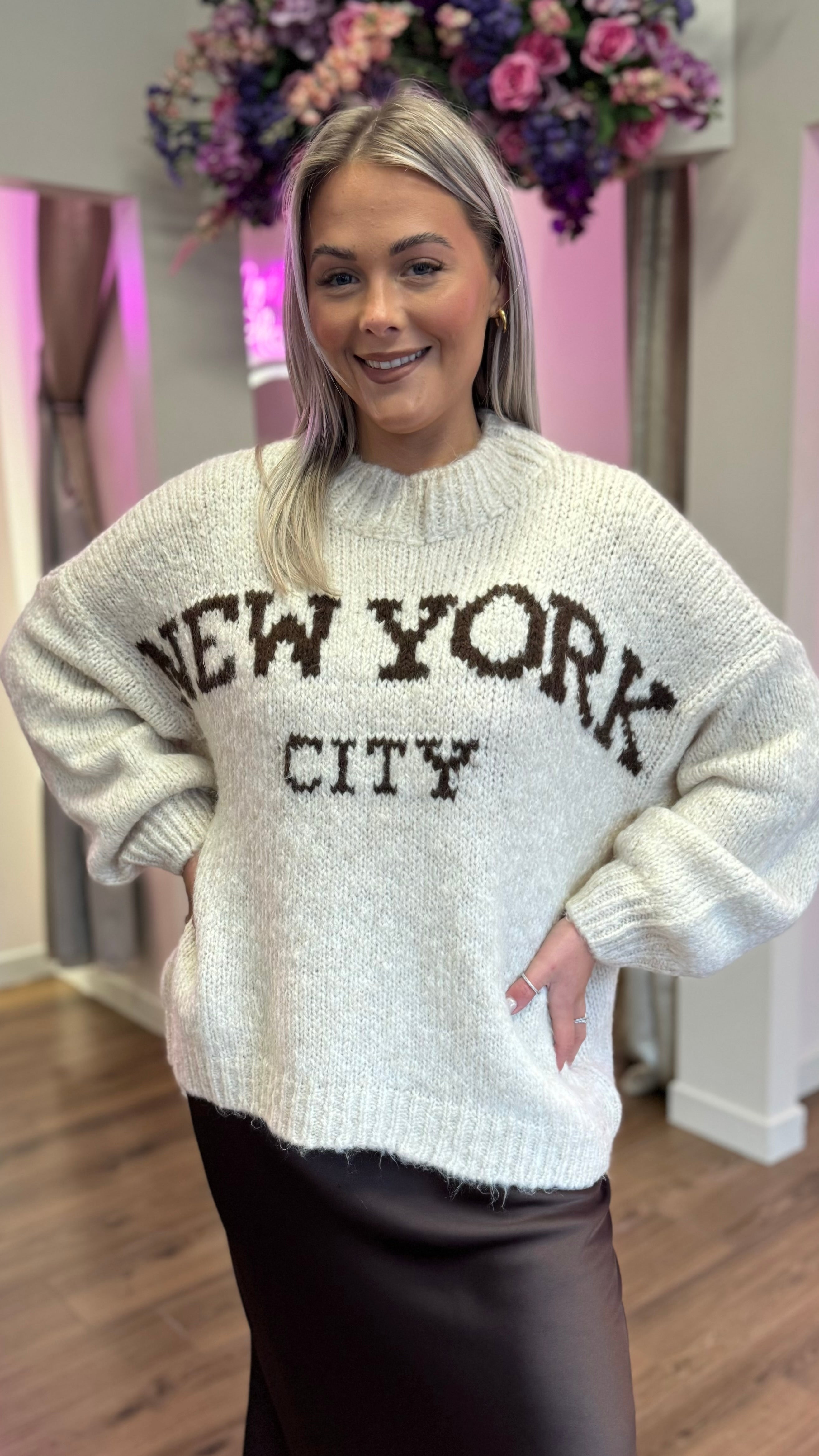 Wrap yourself in effortless style with the Minette 'New York' Beige Slogan Jumper. This cosy knit features a classic round neckline and long sleeves, crafted from soft, touchable fabric that feels as good as it looks. The playful slogan adds a cheeky dose of personality to your everyday wardrobe. Perfect for layering or wearing solo, it's your new go-to piece for comfort without compromising on trend.