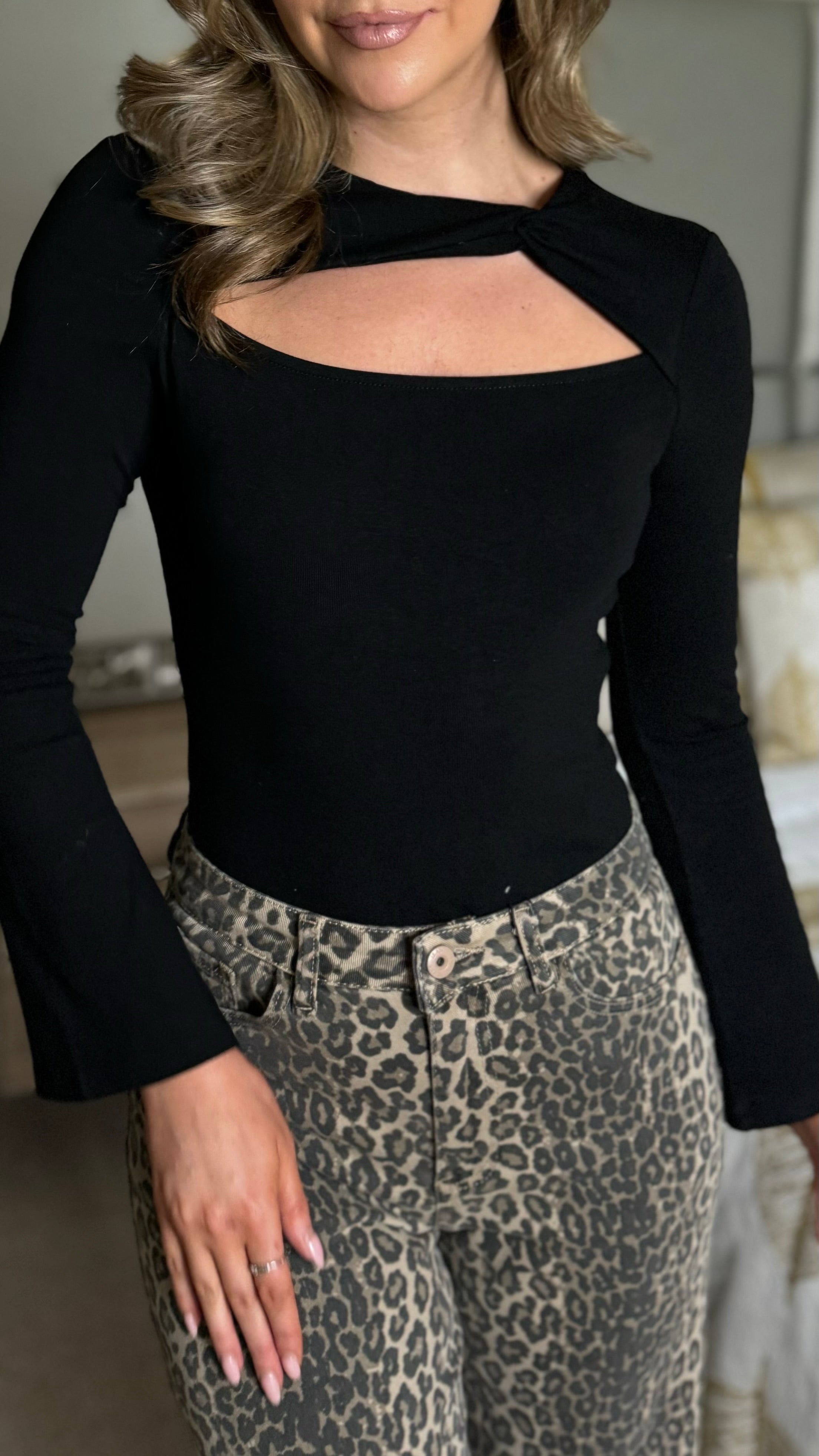 Introducing the Naima Black Cut-Out Long Sleeve Top – your new go-to for effortless style with a cheeky twist! This playful piece features a flattering round neckline and strategic cut-out details that add just the right amount of edge. Crafted from soft, stretchy fabric, it moves with you all day long, while the flare sleeves bring a fun, flirty vibe to any outfit. Perfect for dressing up or down, this versatile top is ready for whatever adventure comes your way.