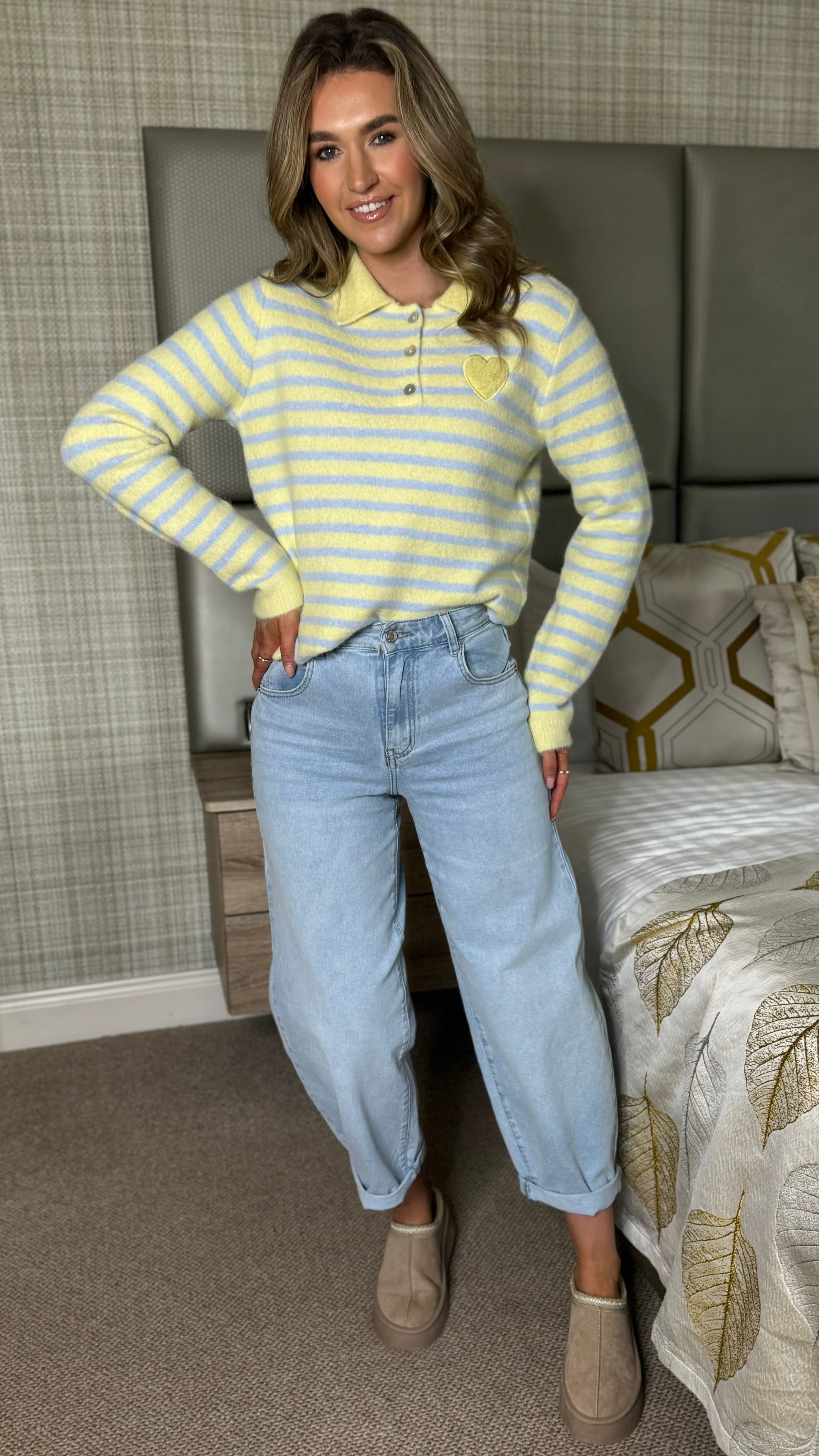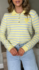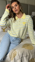 Brighten your wardrobe with this charming Nicolette jumper, featuring cheerful yellow and blue stripes that instantly lift any outfit. The playful heart detail adds a touch of whimsy, while the contrast collar and cuffs in complementary tones create a polished, put-together look. Button detailing at the neckline brings extra character to this cosy knit. Perfect for layering or wearing solo, it's the ideal piece for adding personality to your everyday style.