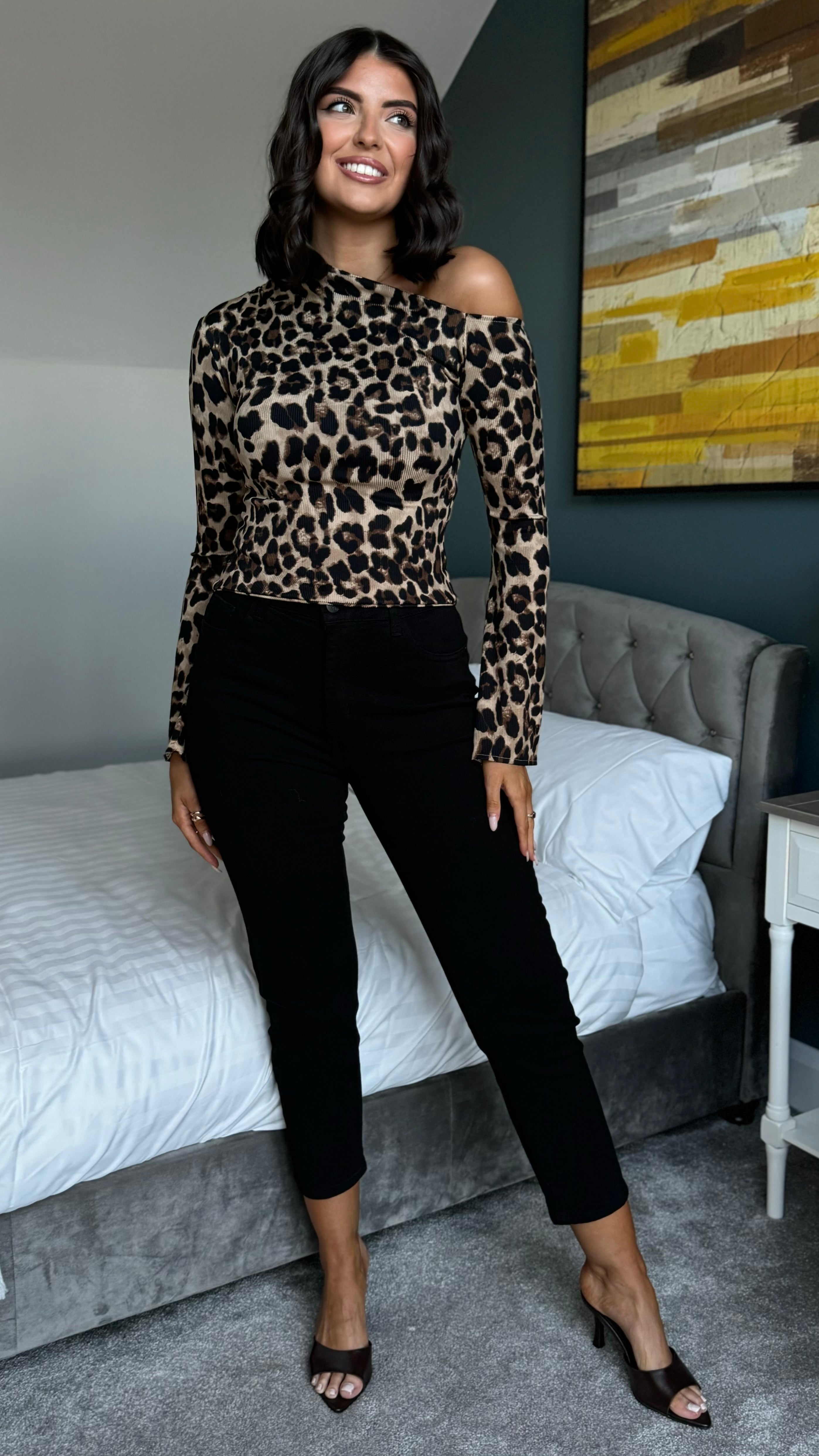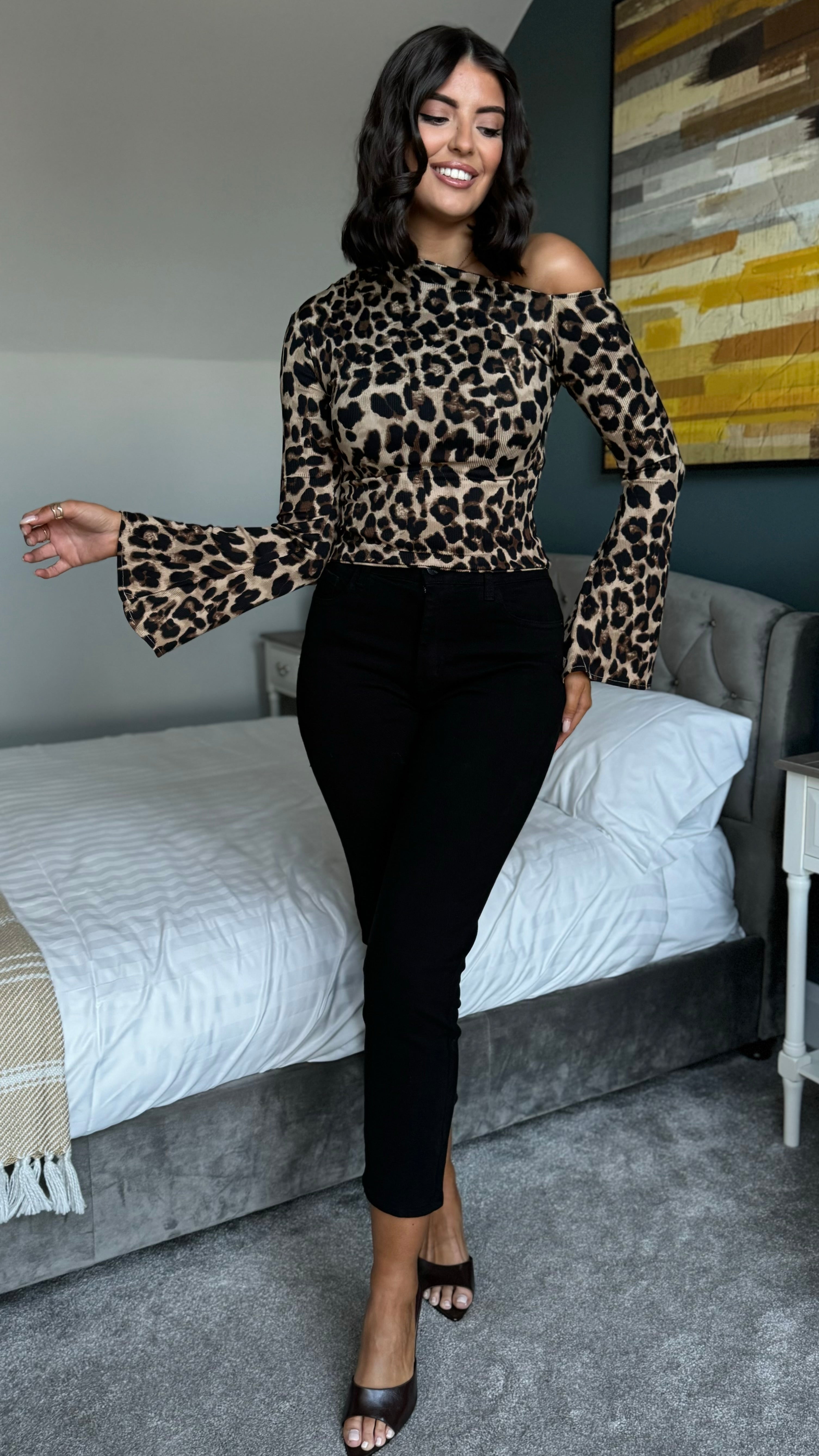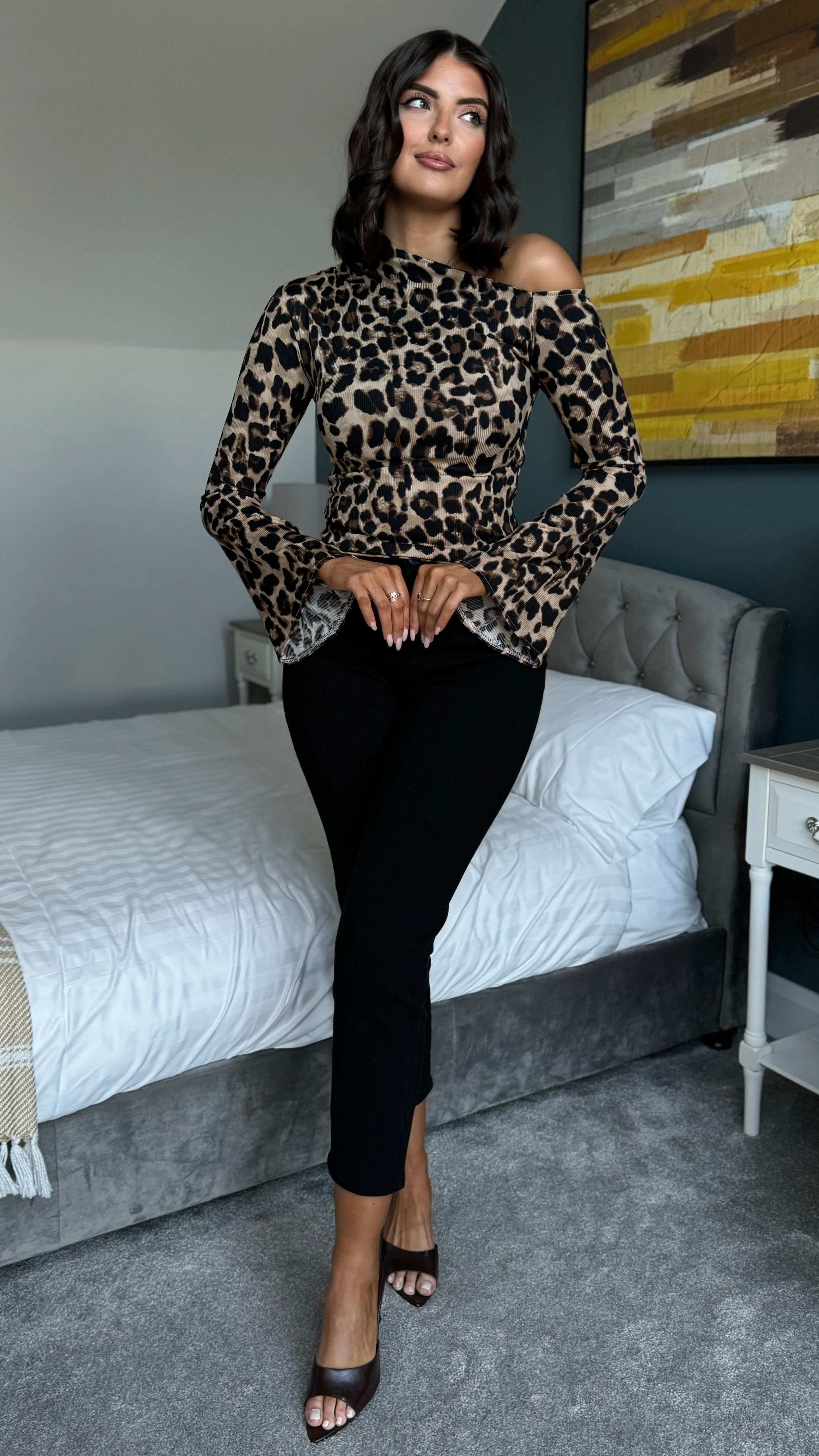 Unleash your wild side with the Priya Leopard Print Asymmetric Long Sleeve Top! This playful piece features a chic asymmetric neckline that adds instant edge, paired with flattering bell sleeves for a touch of retro flair. Crafted from soft, stretchy fabric, it moves with you all day while the bold leopard print makes a statement. Perfect for dressing up or down, this versatile top brings attitude and comfort together in one fabulous package.