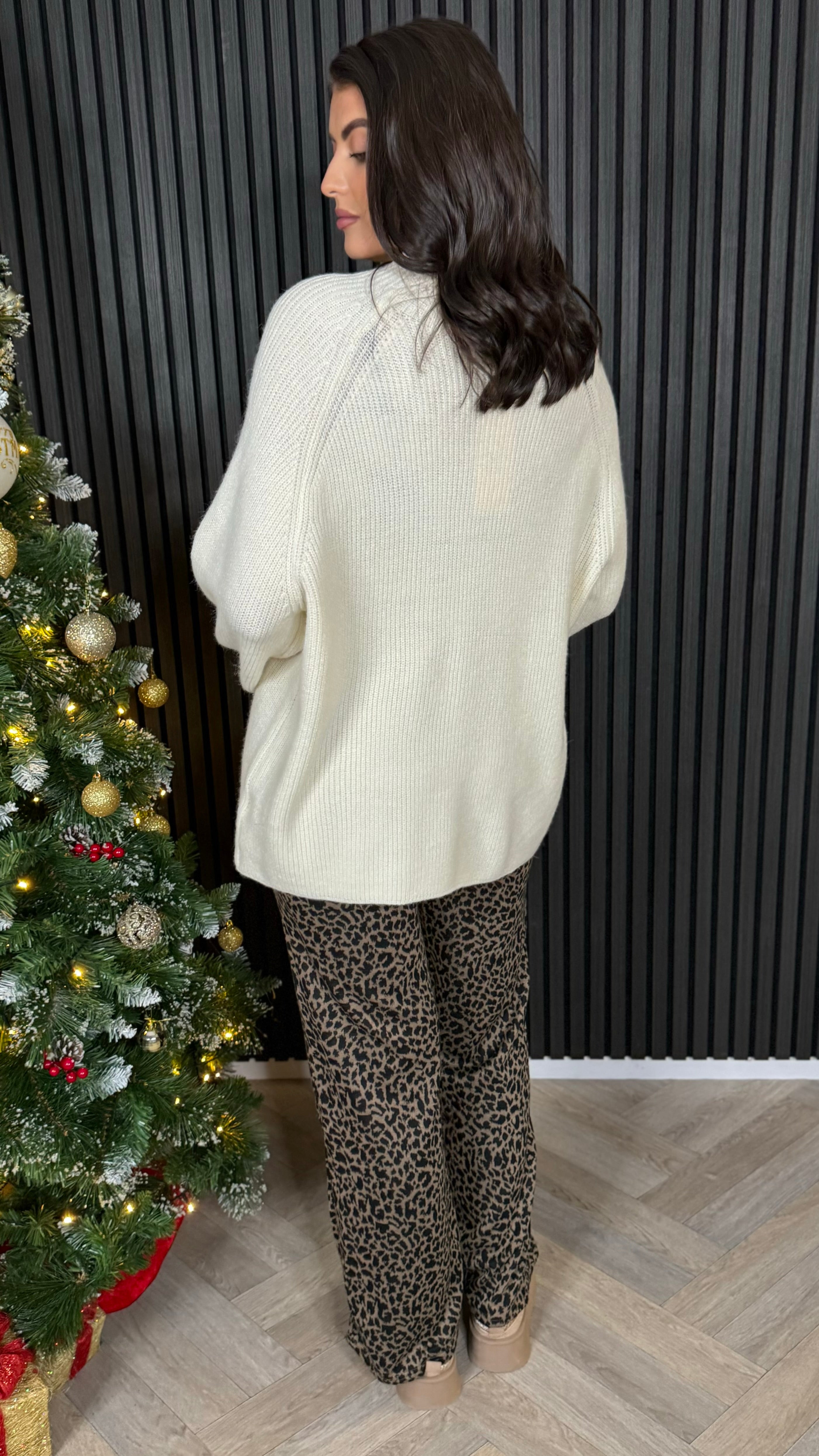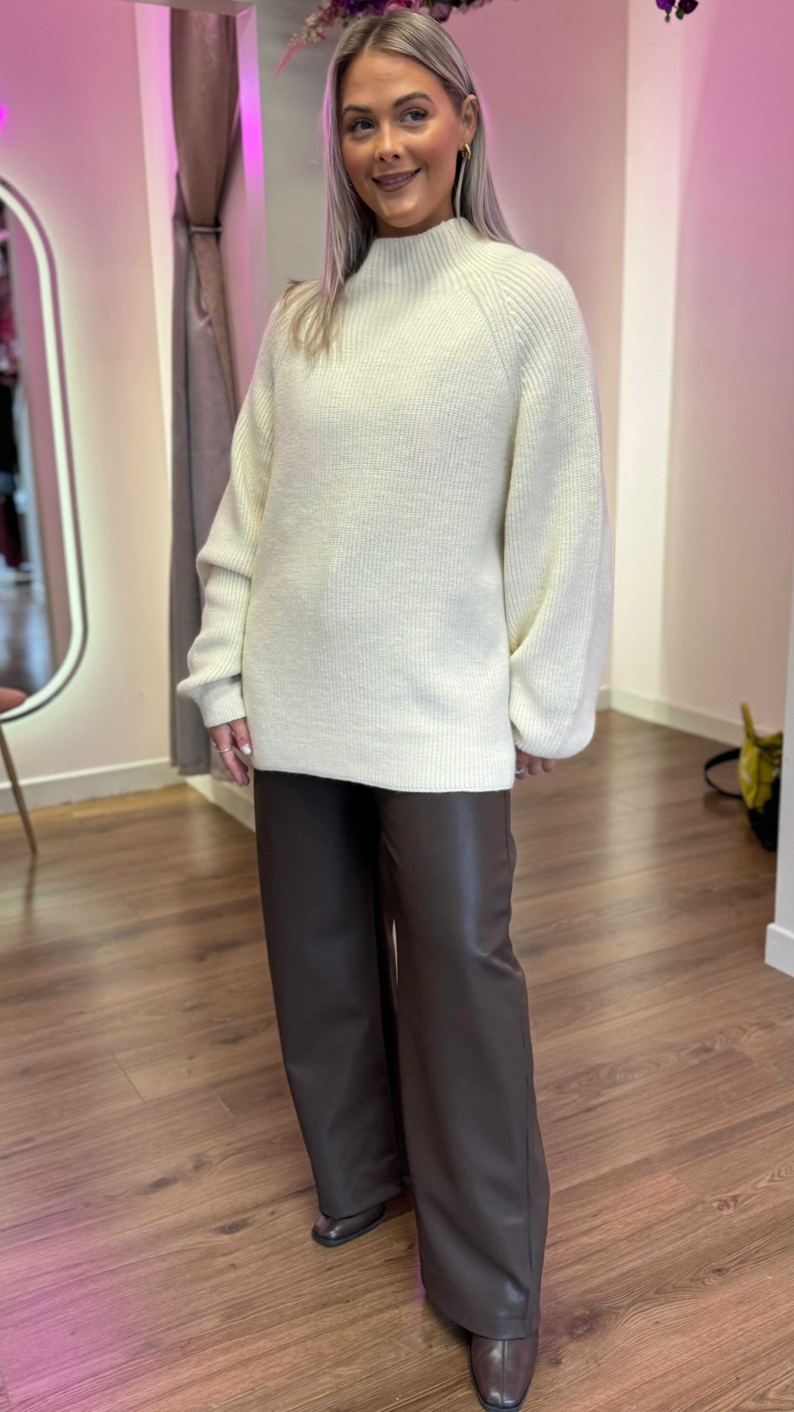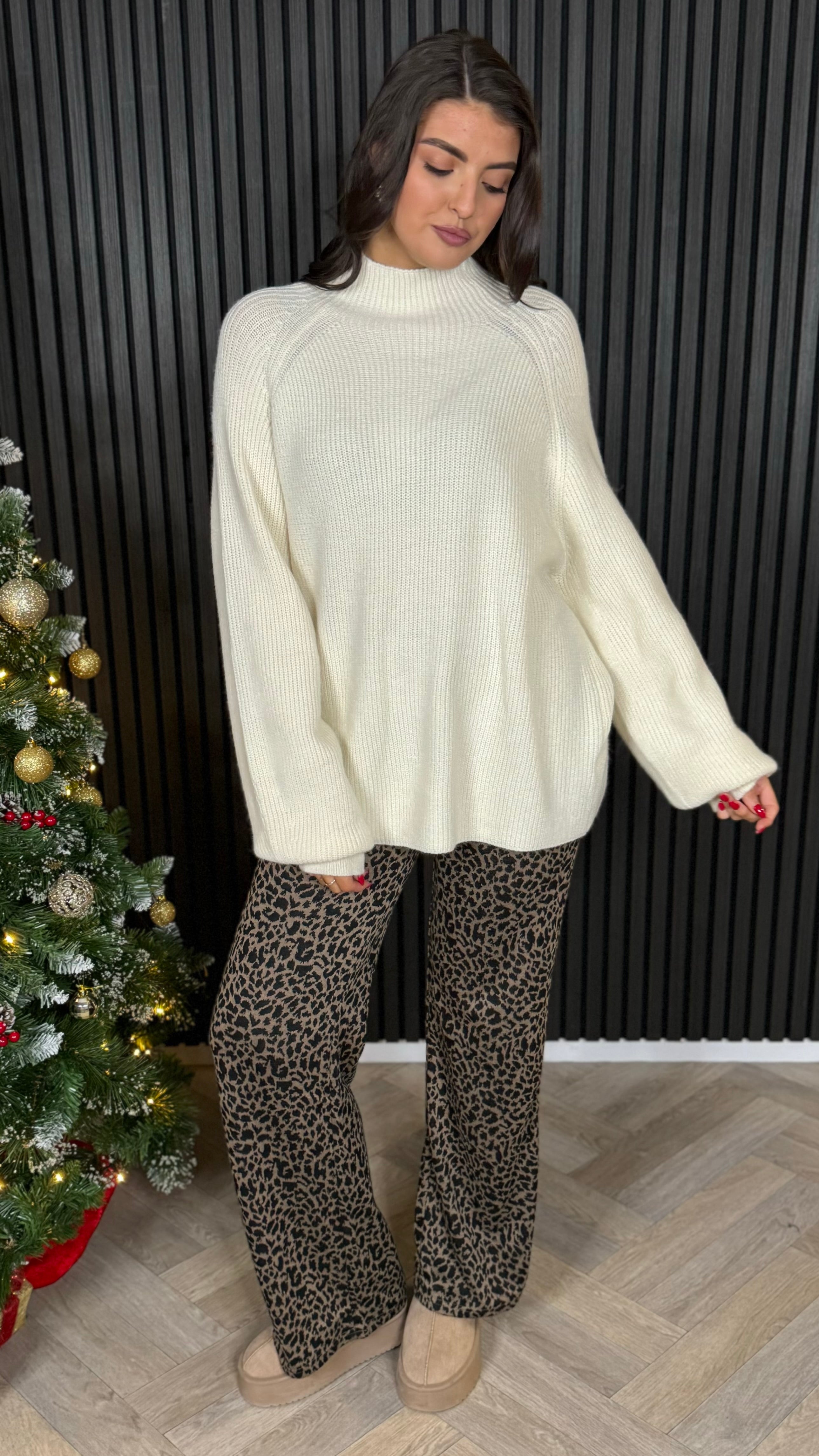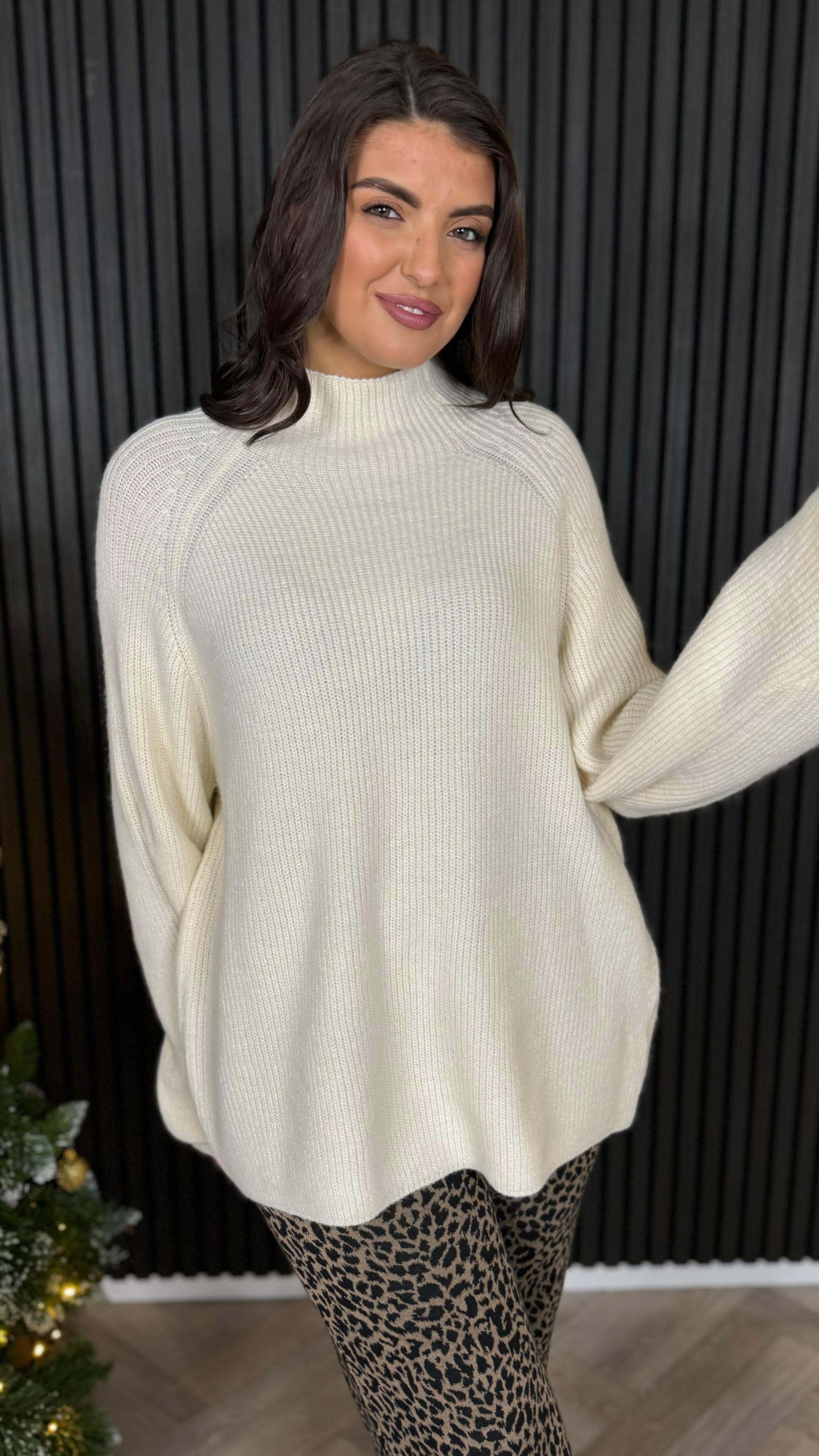 Introducing the Roxanne Ivory Oversized Knit Jumper – your new go-to for effortless, cosy vibes. This playful piece features a relaxed oversized silhouette that's perfect for layering or wearing solo, paired with a chic high neckline for extra warmth and style. The ribbed cuffs and neckline keep everything snug and polished, while the soft knit fabric wraps you in comfort. Whether you're lounging at home or out and about, this ivory beauty strikes the perfect balance between laid-back and put-together. Elevate your everyday wardrobe with timeless appeal.