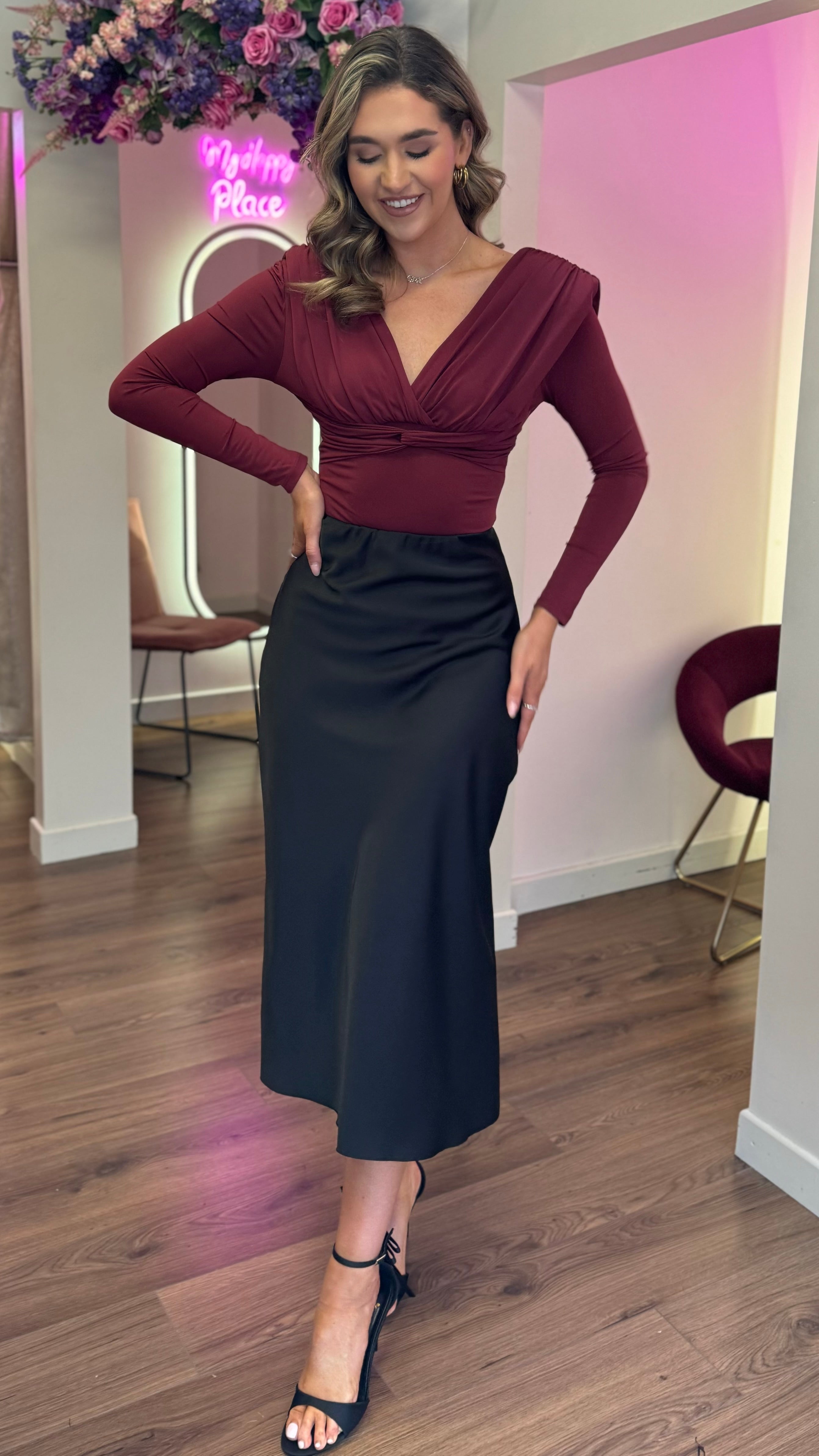 Meet your new go-to top that's equal parts drama and comfort! The Taryn features a chic crossed neckline and bold shoulder pads for that effortless statement look. Wrapped in stretch fabric that moves with you, it boasts a gorgeous deep wrap-effect at both front and back, cinched with a gathered knot at the waist for a flattering silhouette. Long sleeves complete the vibe—perfect for layering or wearing solo. Style it with everything from tailored trousers to your favourite jeans.