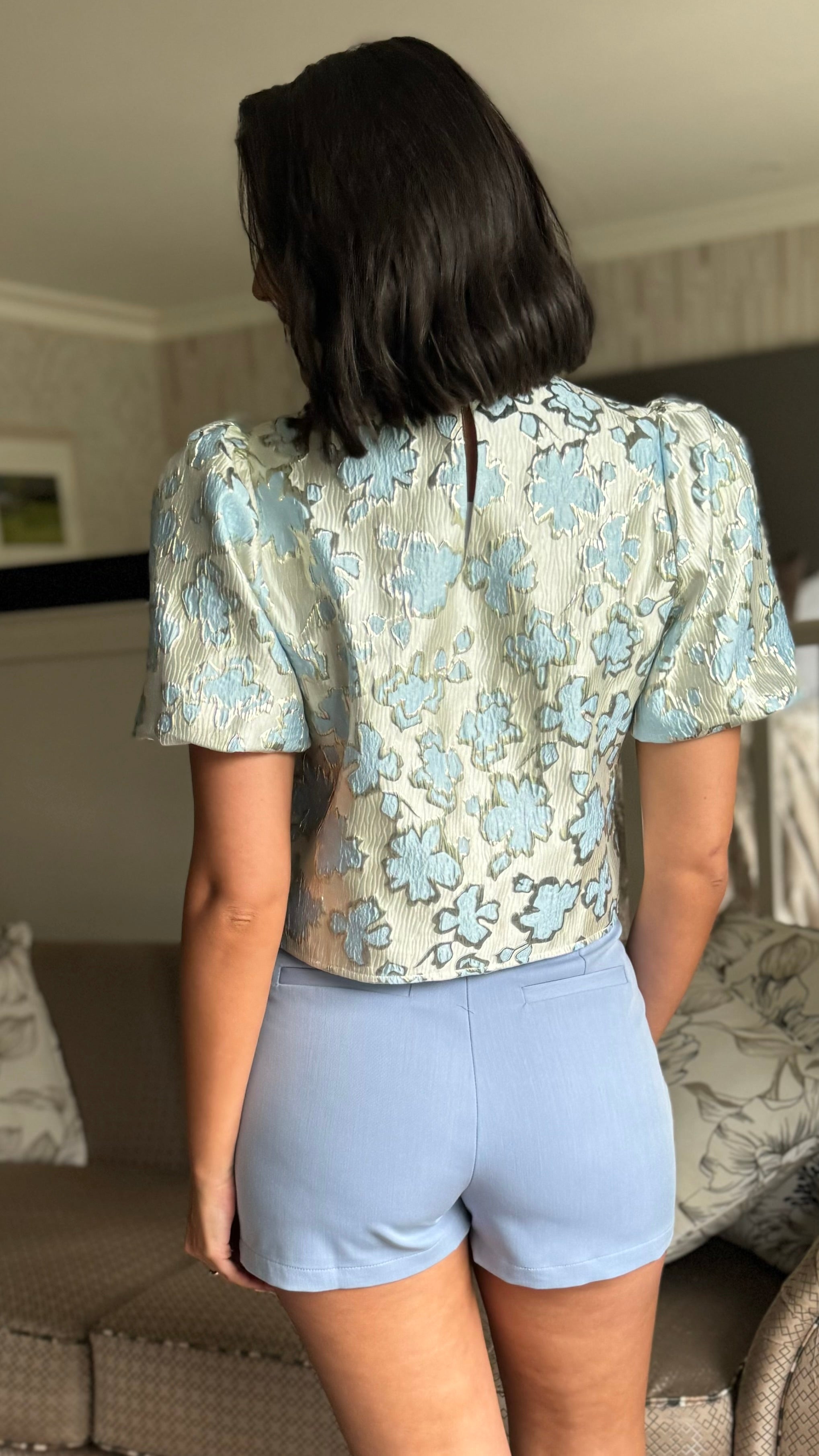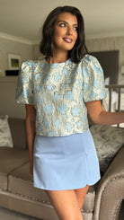 Jayla Blue Floral Brocade Puff Sleeve Top