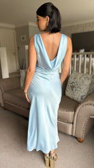 Elevate your everyday wardrobe with this sky blue satin midaxi dress, designed to flatter your silhouette. The elegant boat neckline frames the shoulders beautifully, while the dramatic cowl back adds a touch of sophistication and movement. Crafted from luxurious satin, this piece drapes gracefully to create a refined, contemporary look perfect for both occasions and everyday wear.