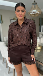 Slip into effortless style with these Aviva Brown Satin Lace Hem Shorts. Crafted from lightweight satin that feels as good as it looks, they're designed for all-day comfort with a stretchy elasticated waistband that moves with you. The delicate lace hem adds a touch of flirty elegance, making them perfect for everything from casual brunches to evening adventures.