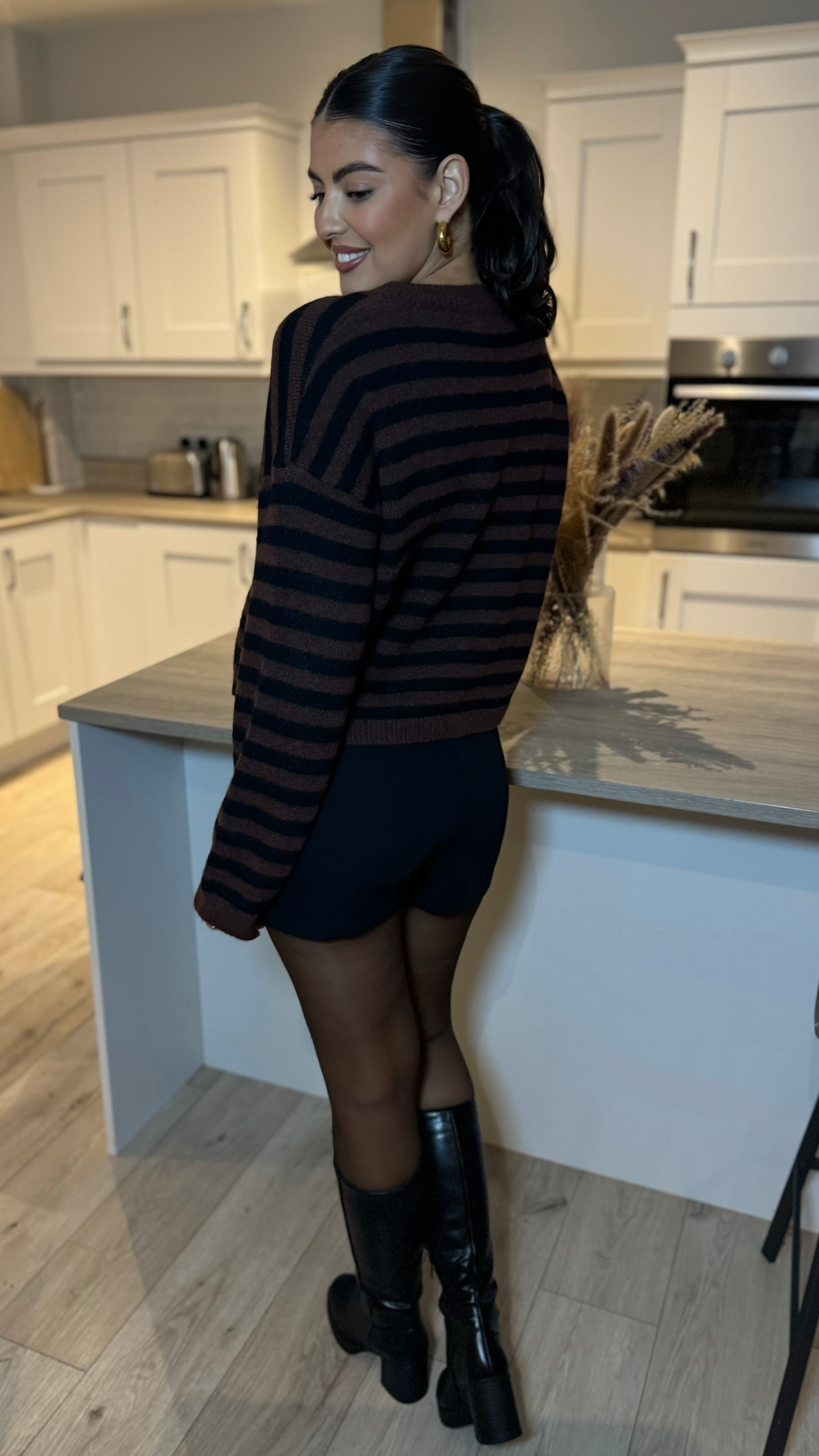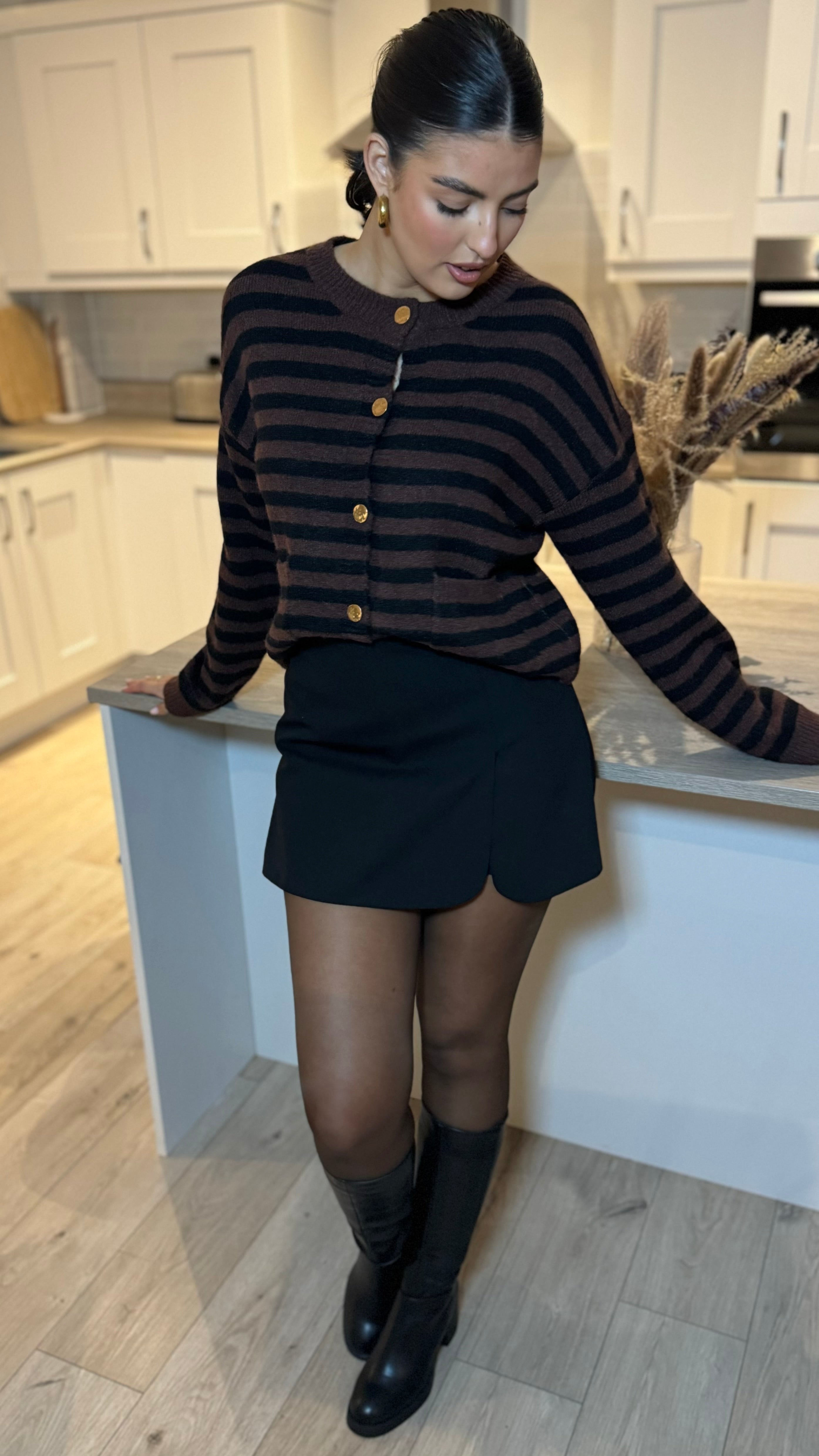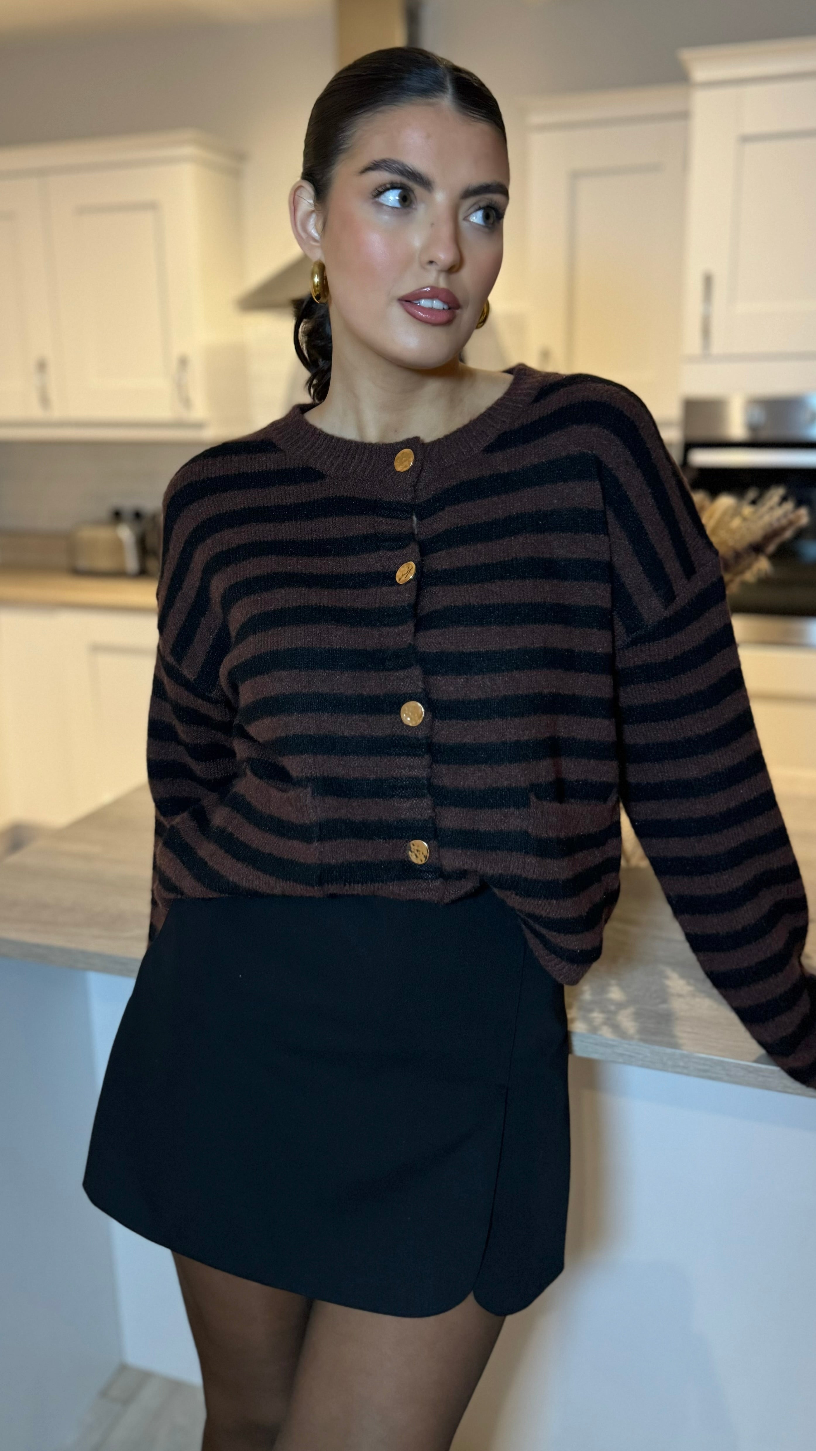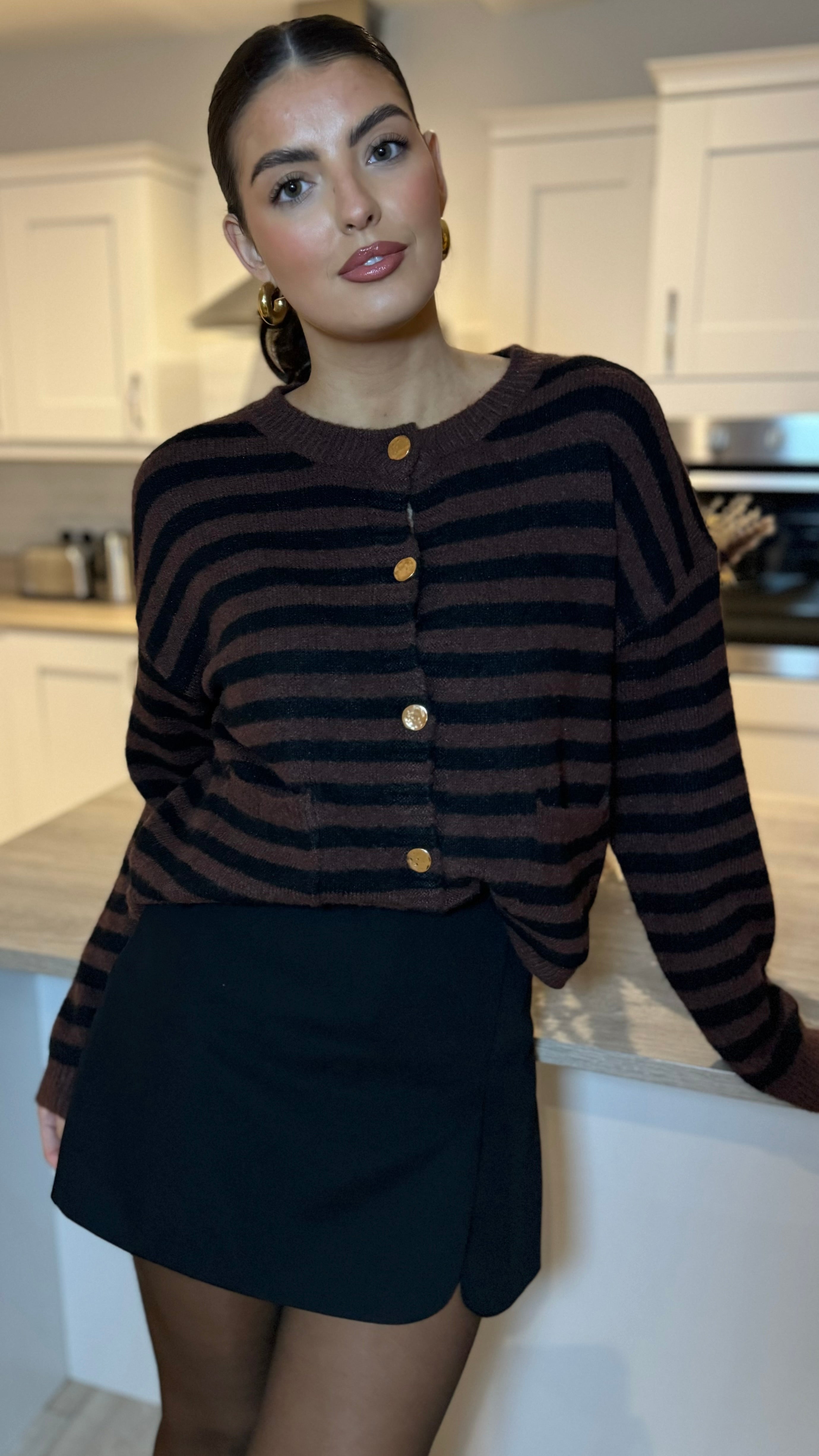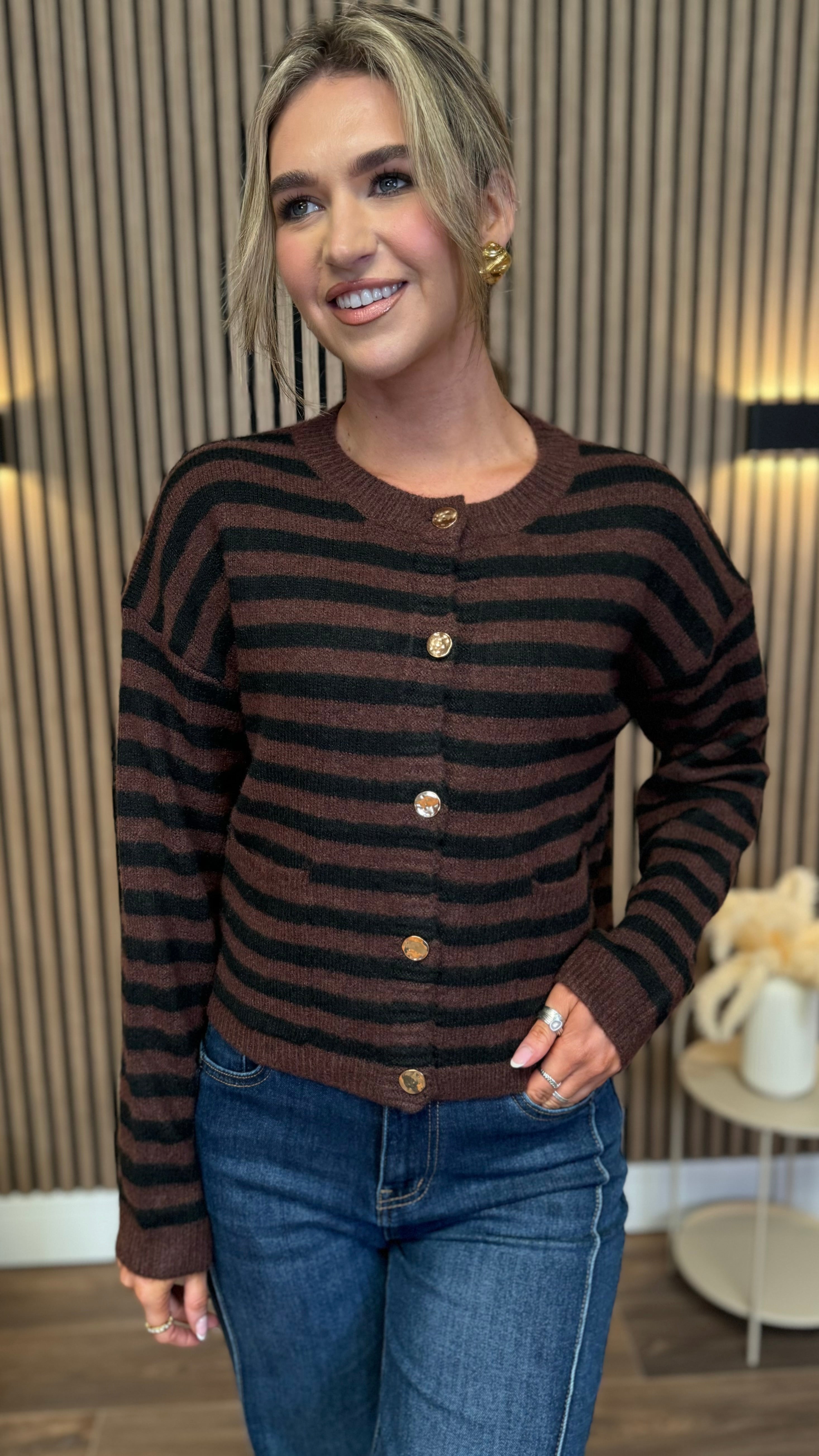 Add a splash of fun to your wardrobe with the Carolina Brown & Black Striped Cardigan. Featuring a cozy round neck and long sleeves, it’s perfect for layering on chilly days. The playful stripe pattern is complemented by chic gold button details, adding a touch of sparkle to your casual look. Comfortable and stylish, this cardigan is ready to brighten up any outfit!