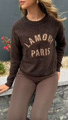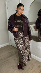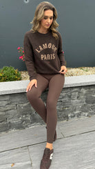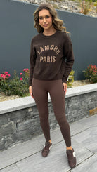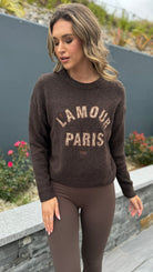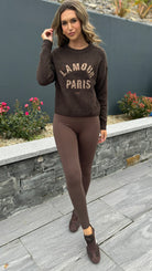 Cozy up in the Jill Chocolate Brown Slogan Printed Jumper, featuring a comfy round neckline and snug ribbed hem and cuffs. Its soft, cosy fabric makes it perfect for lounging or layering in style, adding a fun twist to your casual wardrobe.