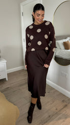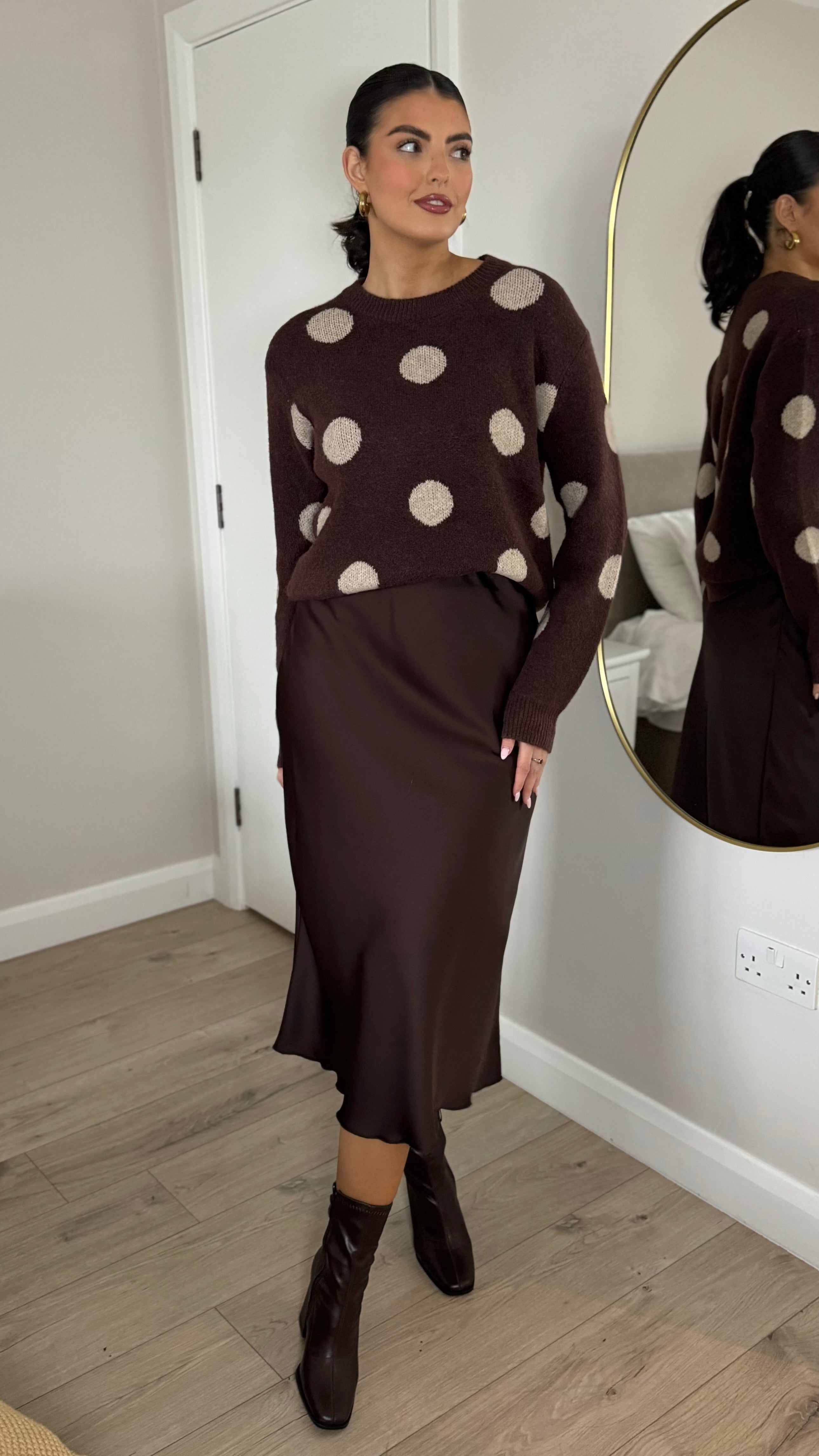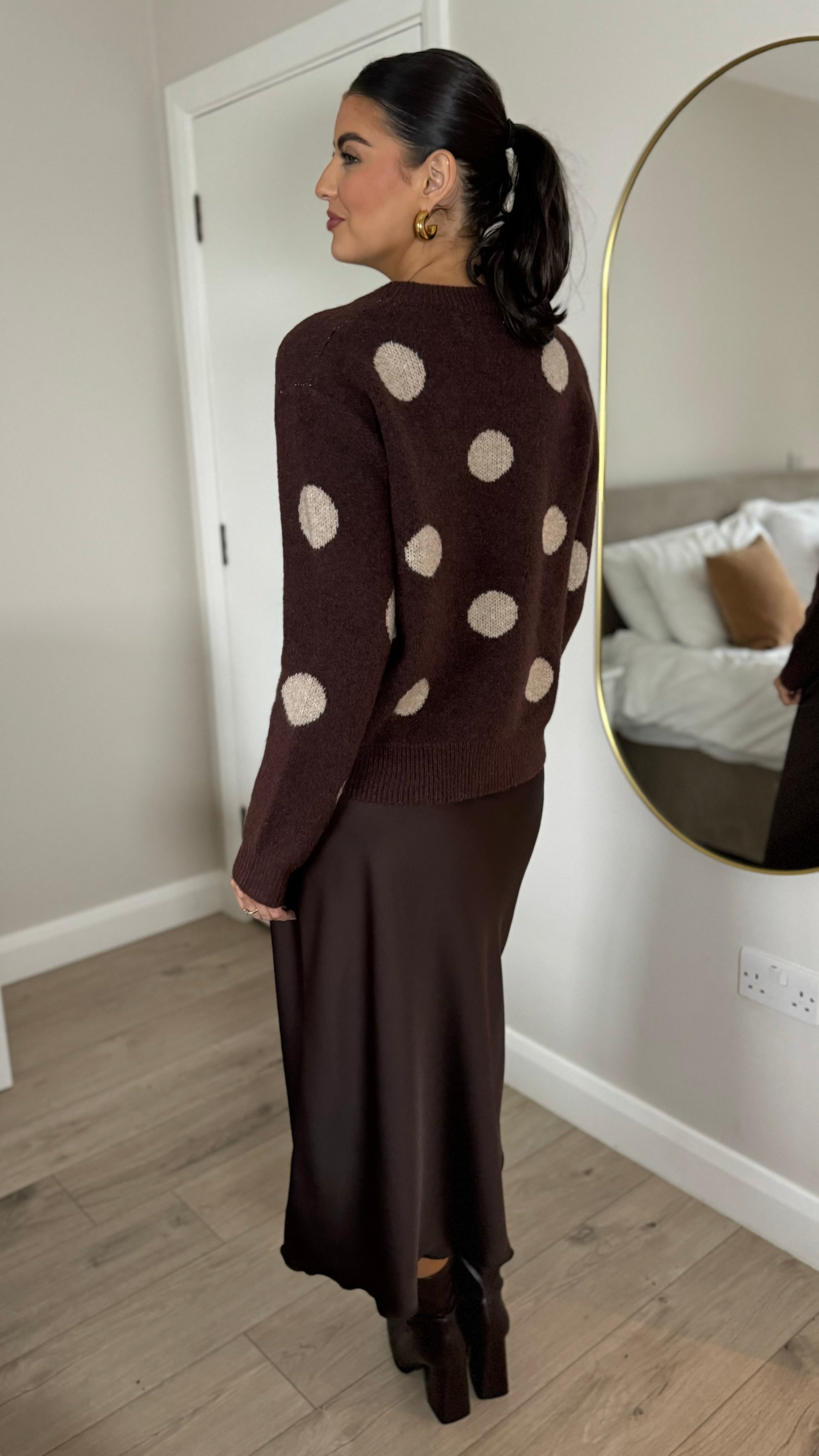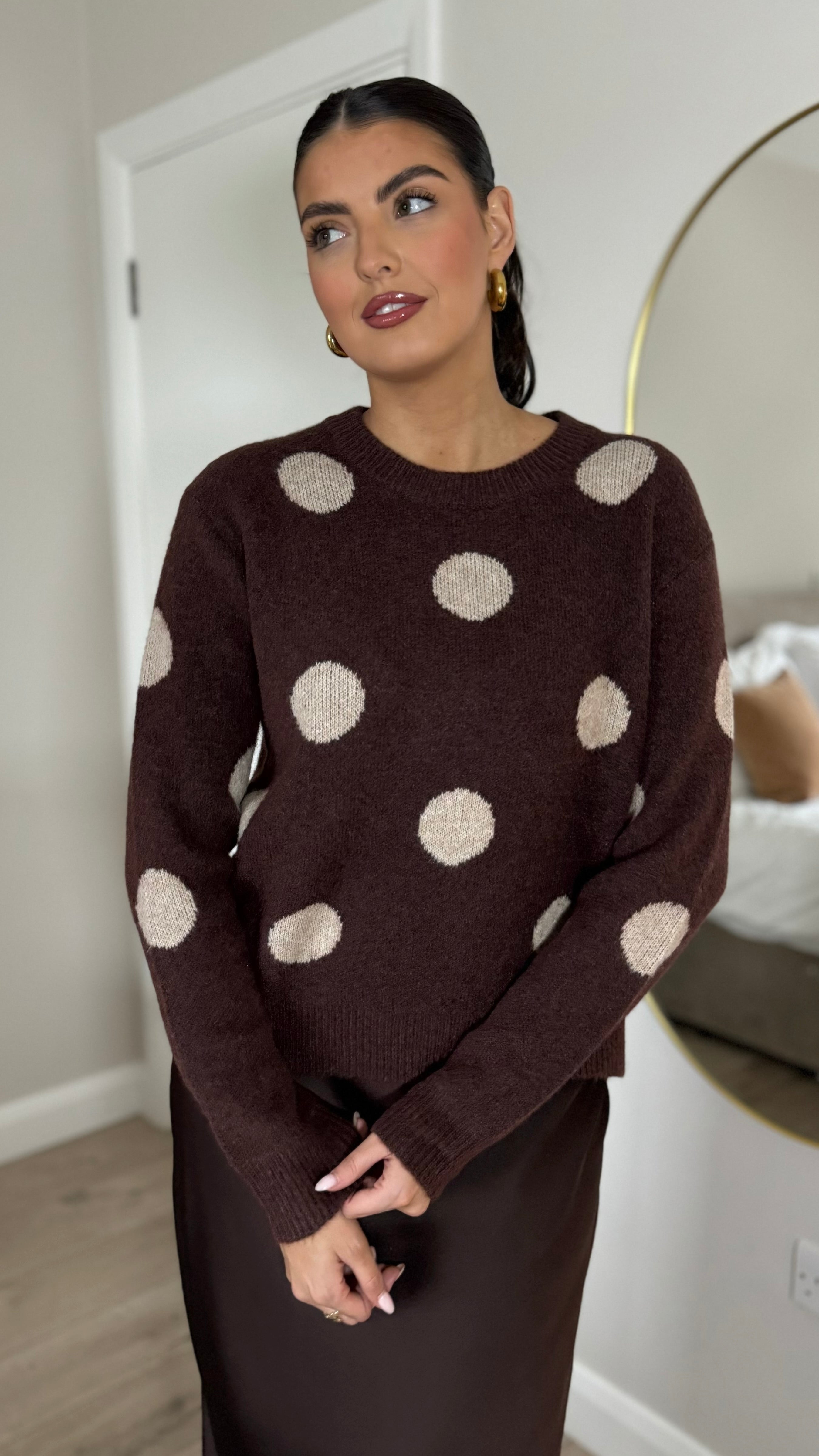 Cozy meets cute in this Juno Chocolate Brown Dot Print Jumper! Featuring a charming beige dot pattern, a comfy round neckline, and snug ribbed cuffs, it's the perfect playful pick to brighten your day and keep you warm with style.