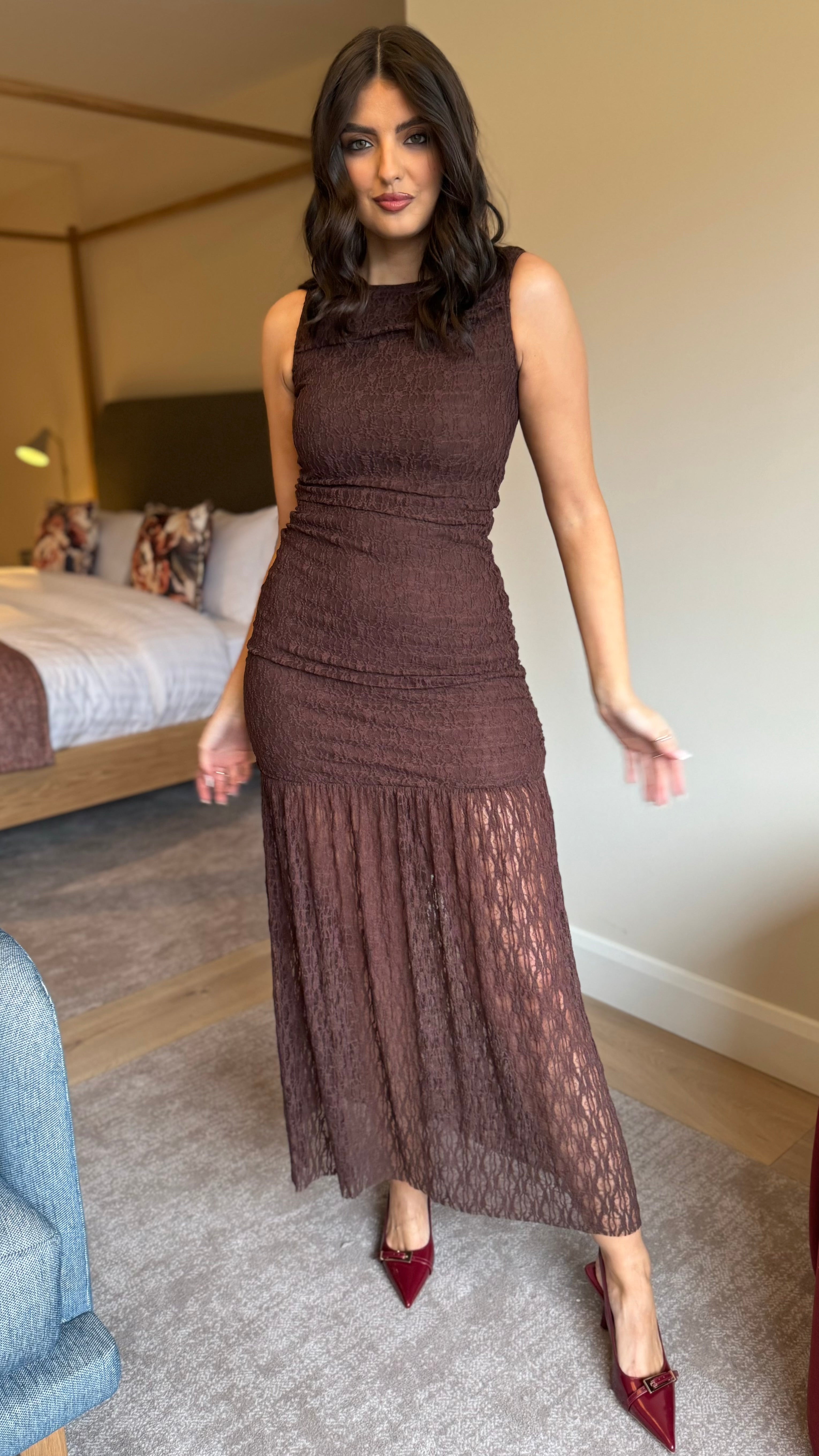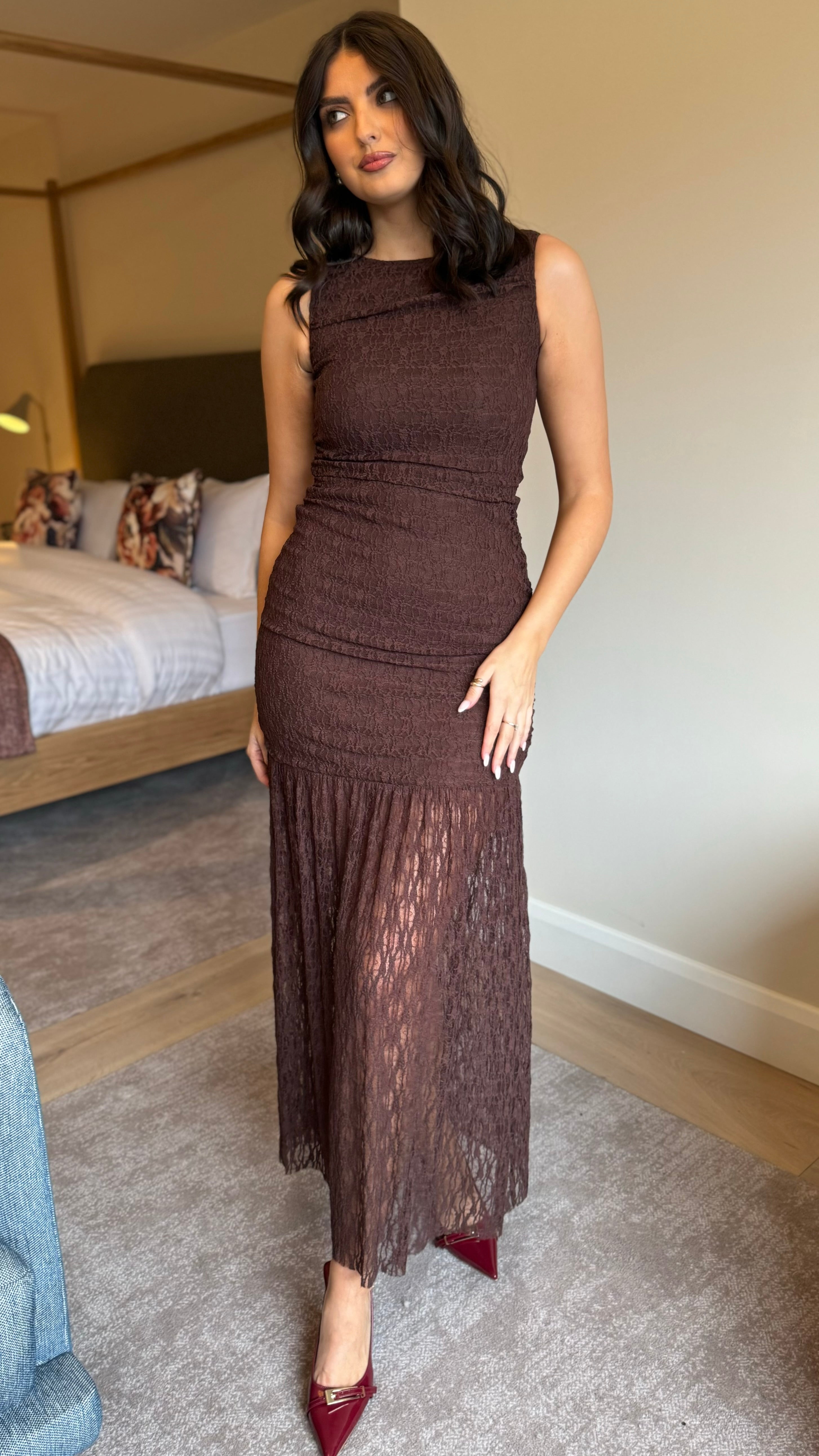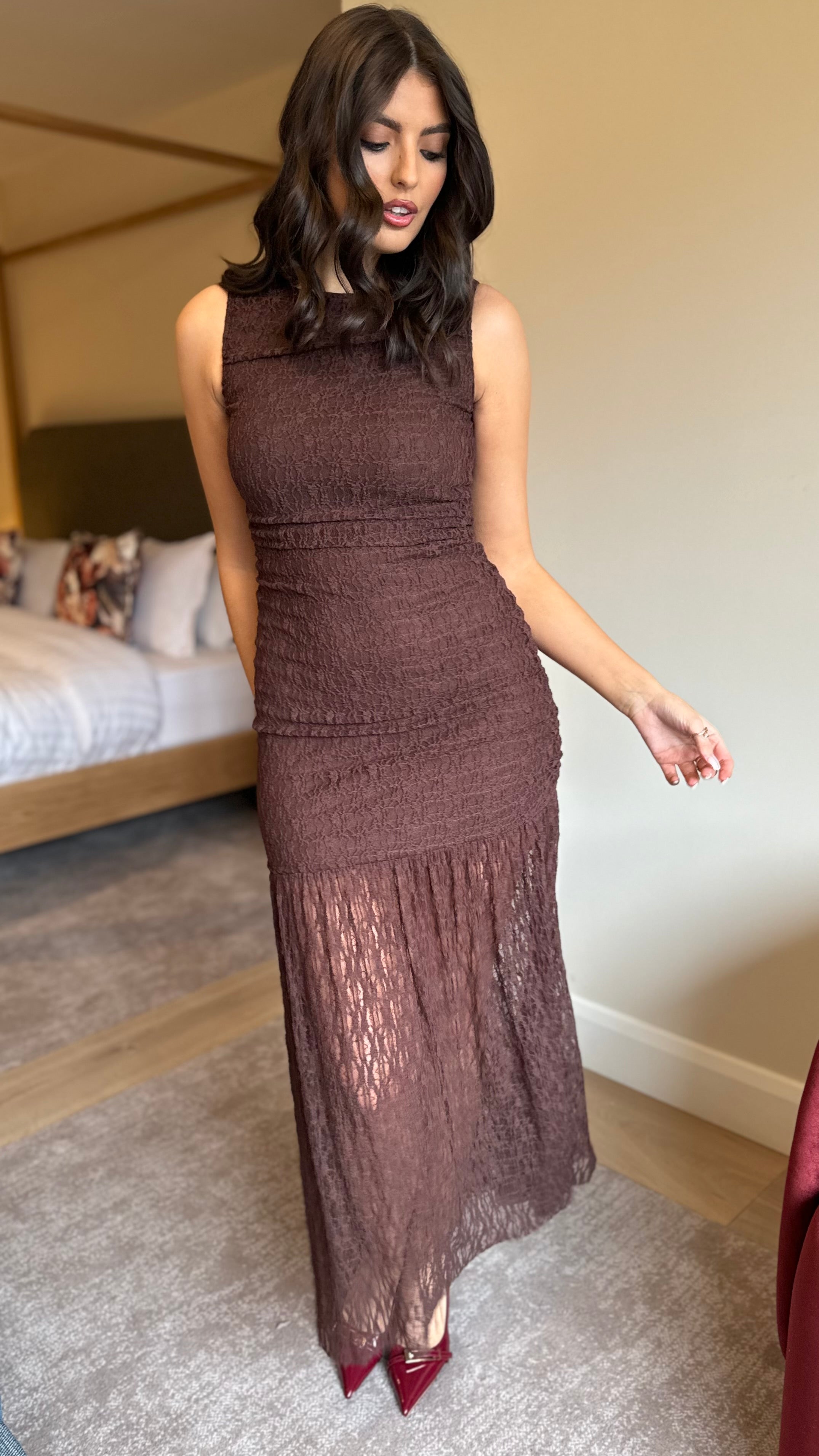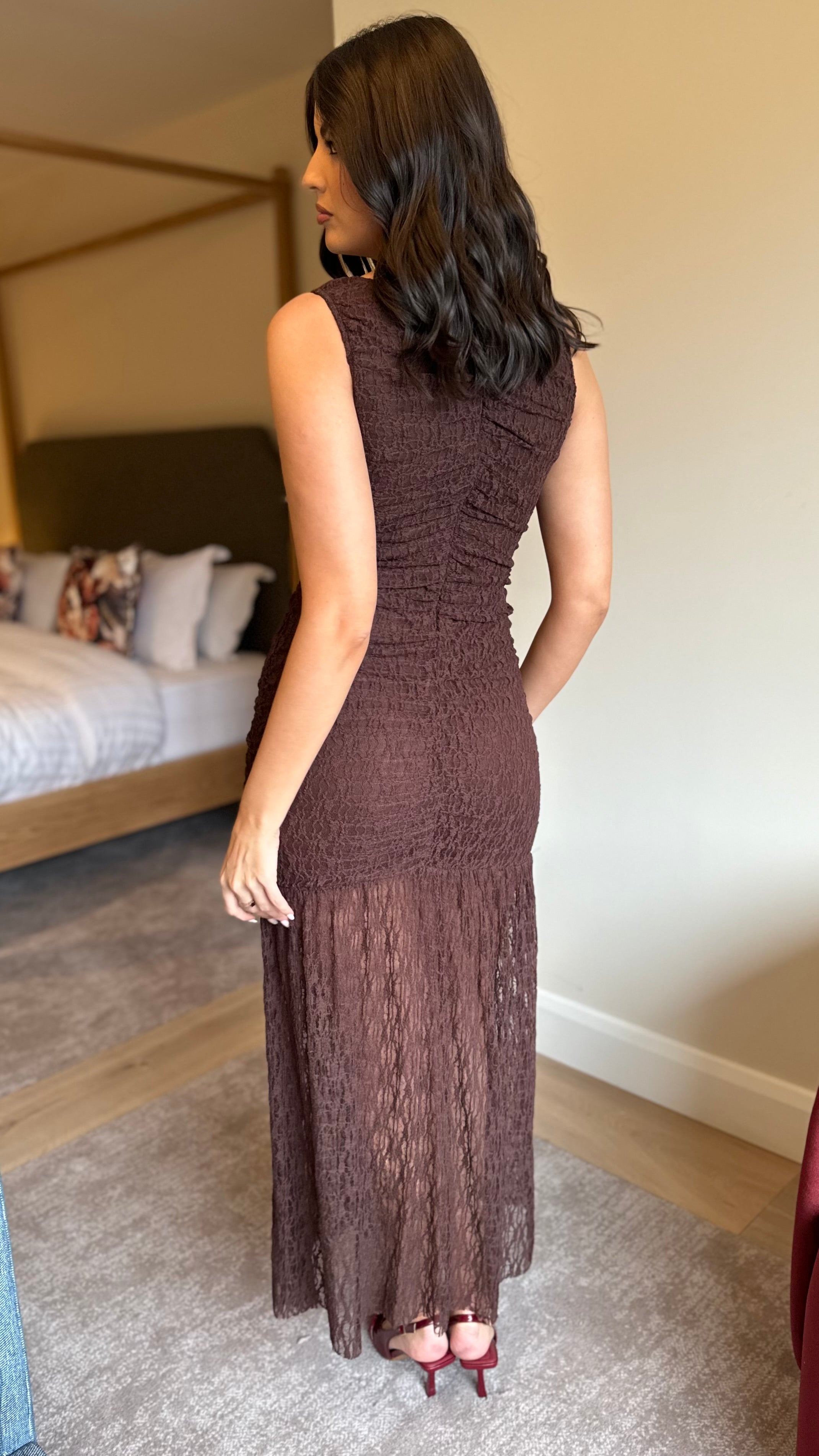 Slip into effortless elegance with this chocolate brown lace midaxi dress. The round neckline frames your face beautifully, while strategically placed ruching flatters your silhouette in all the right ways. Lined through the mid-thigh for comfort and coverage, this dress features a discreet back zip for easy dressing. Perfect for everything from brunch dates to evening occasions, it's the kind of piece that makes you feel confident and chic.